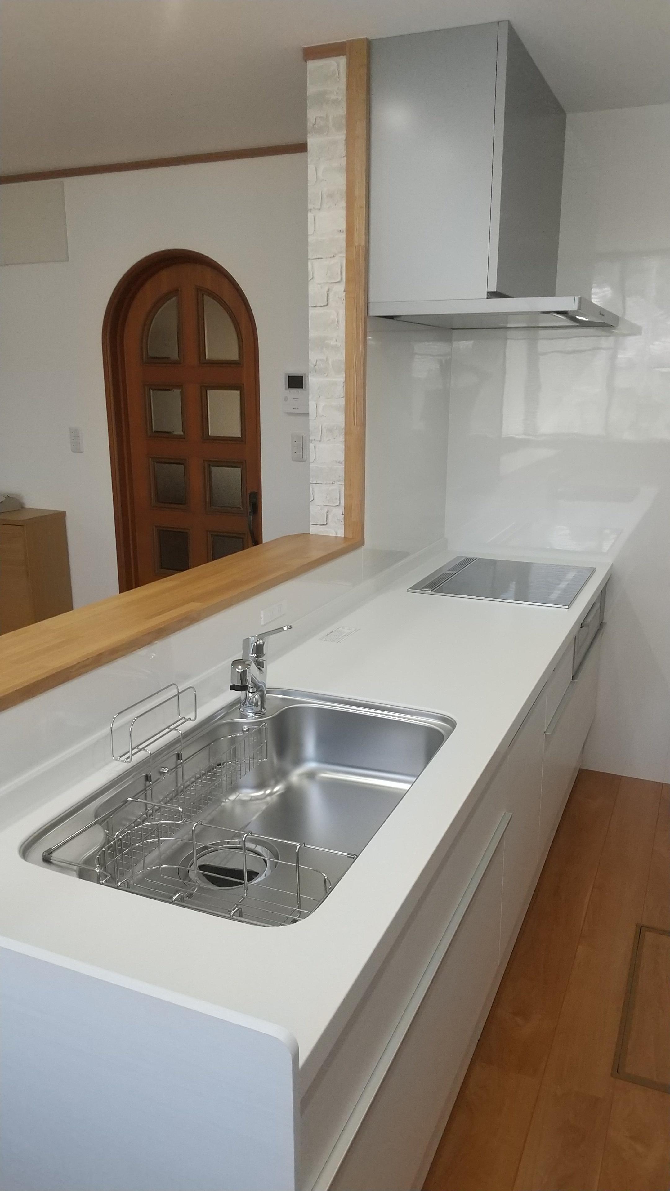 またコンロもガスからIHにしたので使い勝手がよく安全になりました。家電収納・カップボードも同色で壁面に取付けしたので統一感が出てスッキリし、地震が起きても倒れる心配をしなくてもいいようになりました。