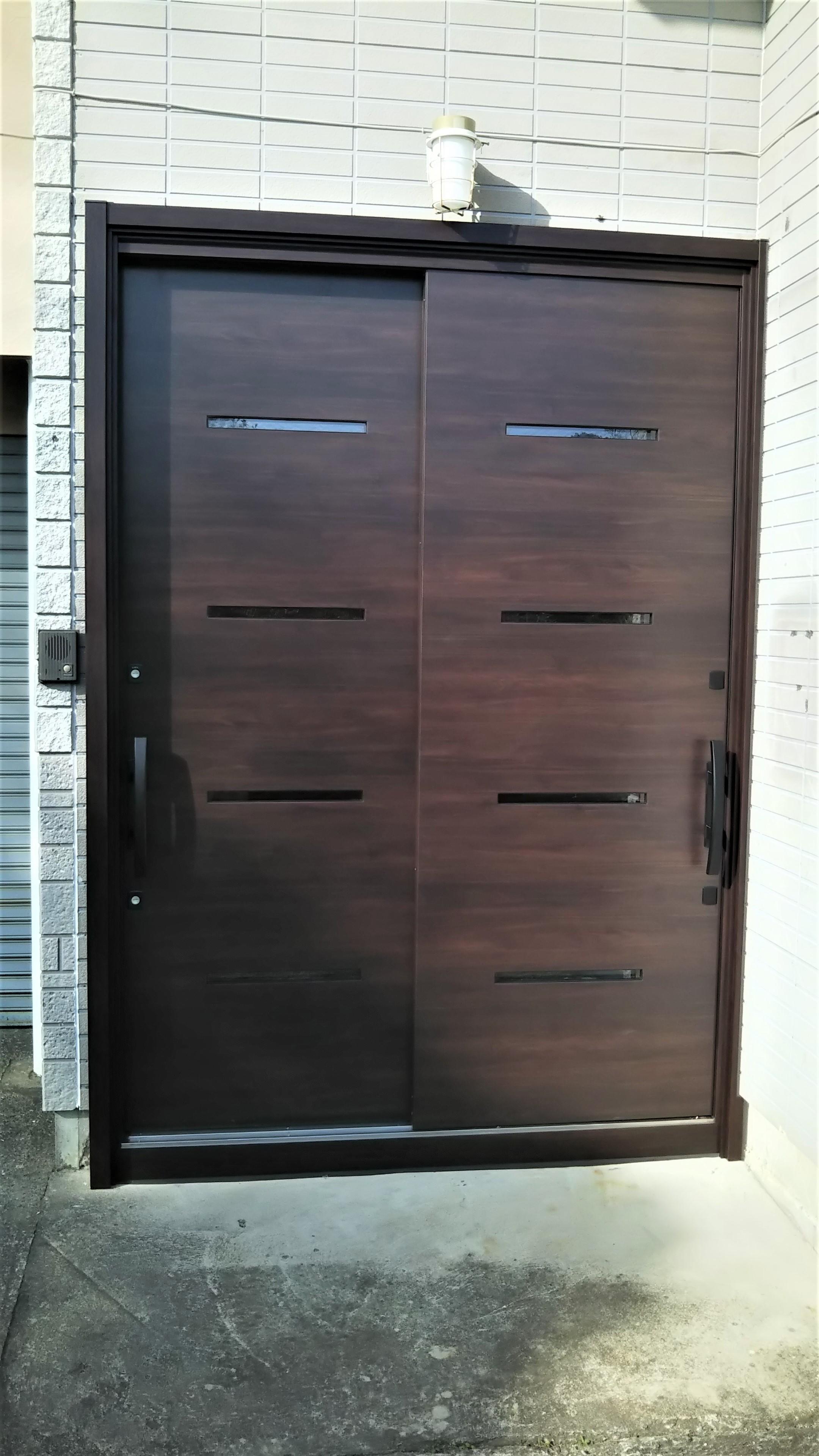 経年劣化により、シンプルでモダンな玄関引戸に取り替えました。 壁を壊さない『カバー工法』なので、《ローコスト + 1日》で新しい玄関にリフォームできます。