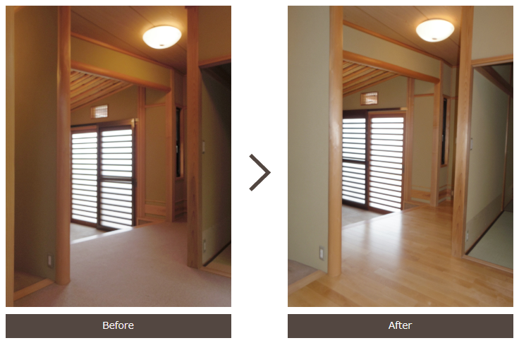 玄関ホールから廊下にかけて、また子ども部屋の床をカーペット敷きからフローリングへ。元々寝室だったお部屋は、お子様の為の明るいお部屋に生まれ変わりました.。.:*・゜☆