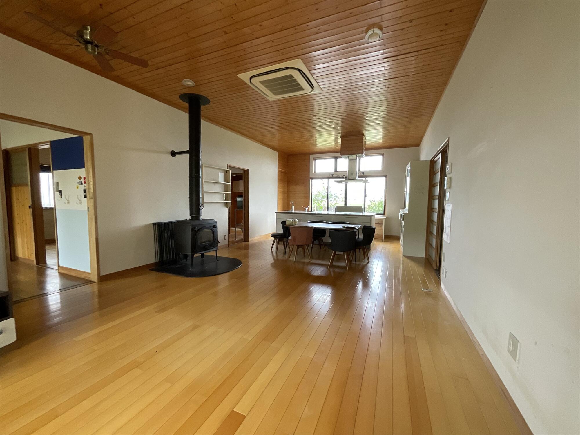 お子様の居室を3部屋分確保しつつ家事動線を考慮、元々の木質感を活かしながら、明るく開放的な空間となるように動かせない薪ストーブと一体的な空間プランニングをしました。