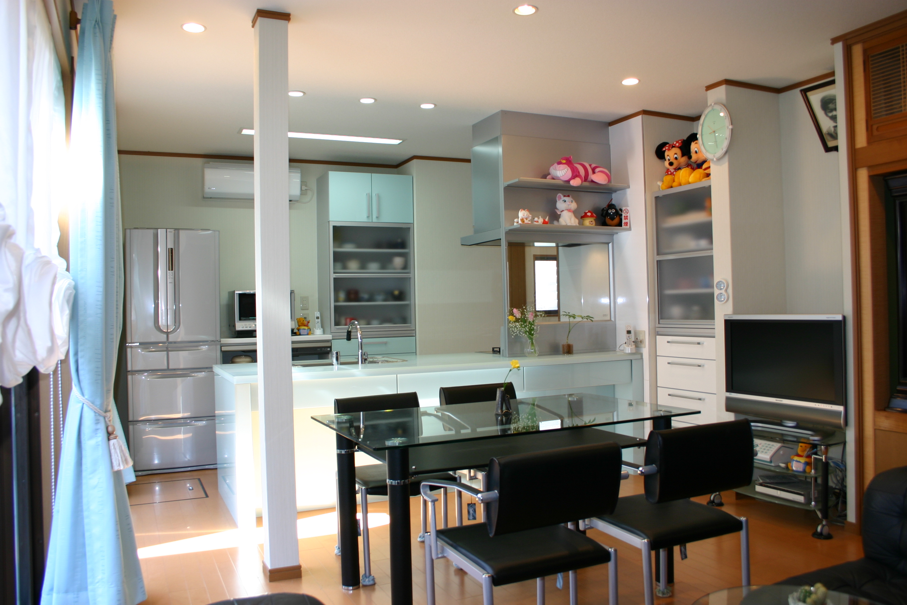 キッチンが狭いうえ居間である和室が使いづらいというお客様の声をもとに、開放感を作り出す為天井を15cm高くし、照明器具を全て埋め込みタイプにしました。