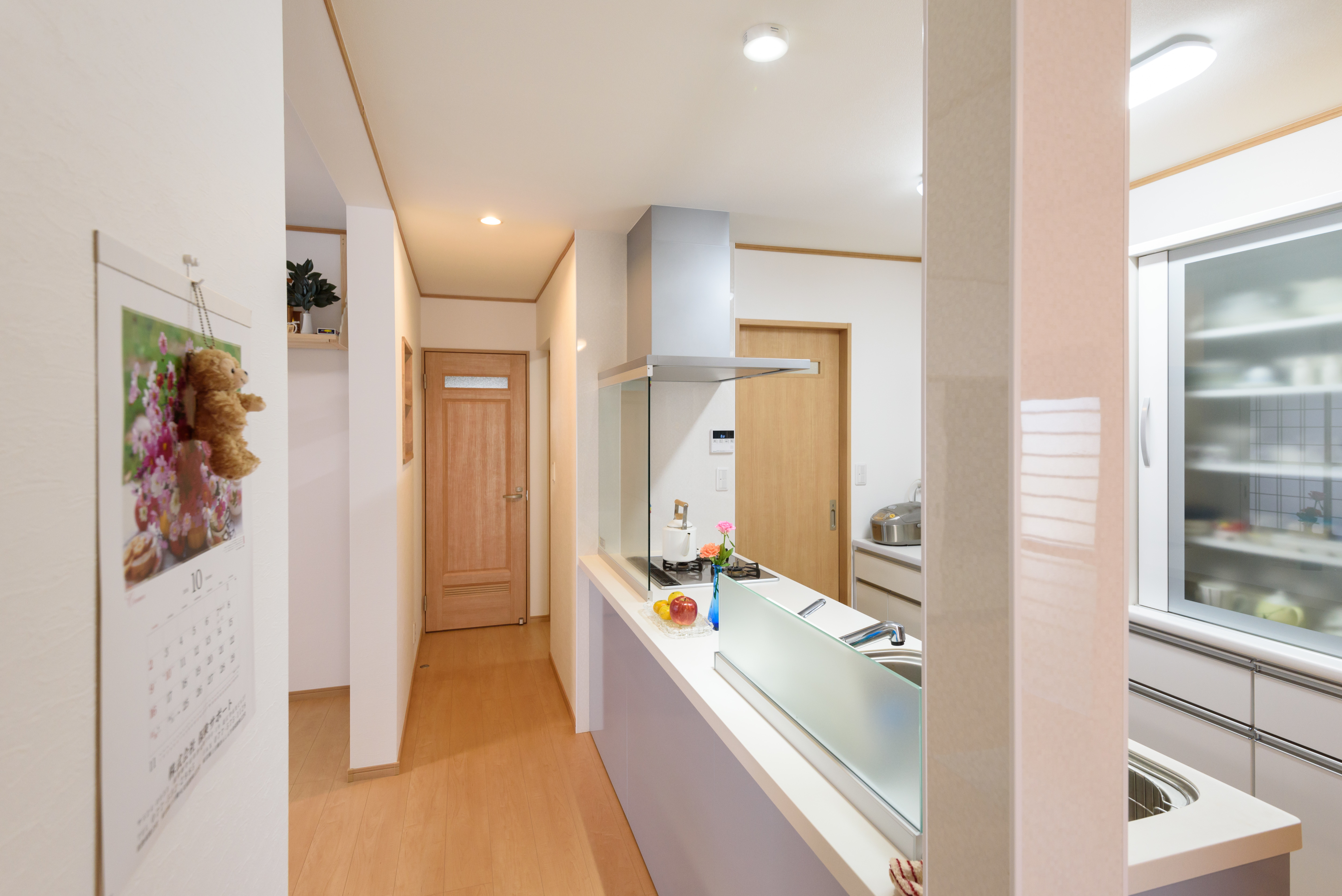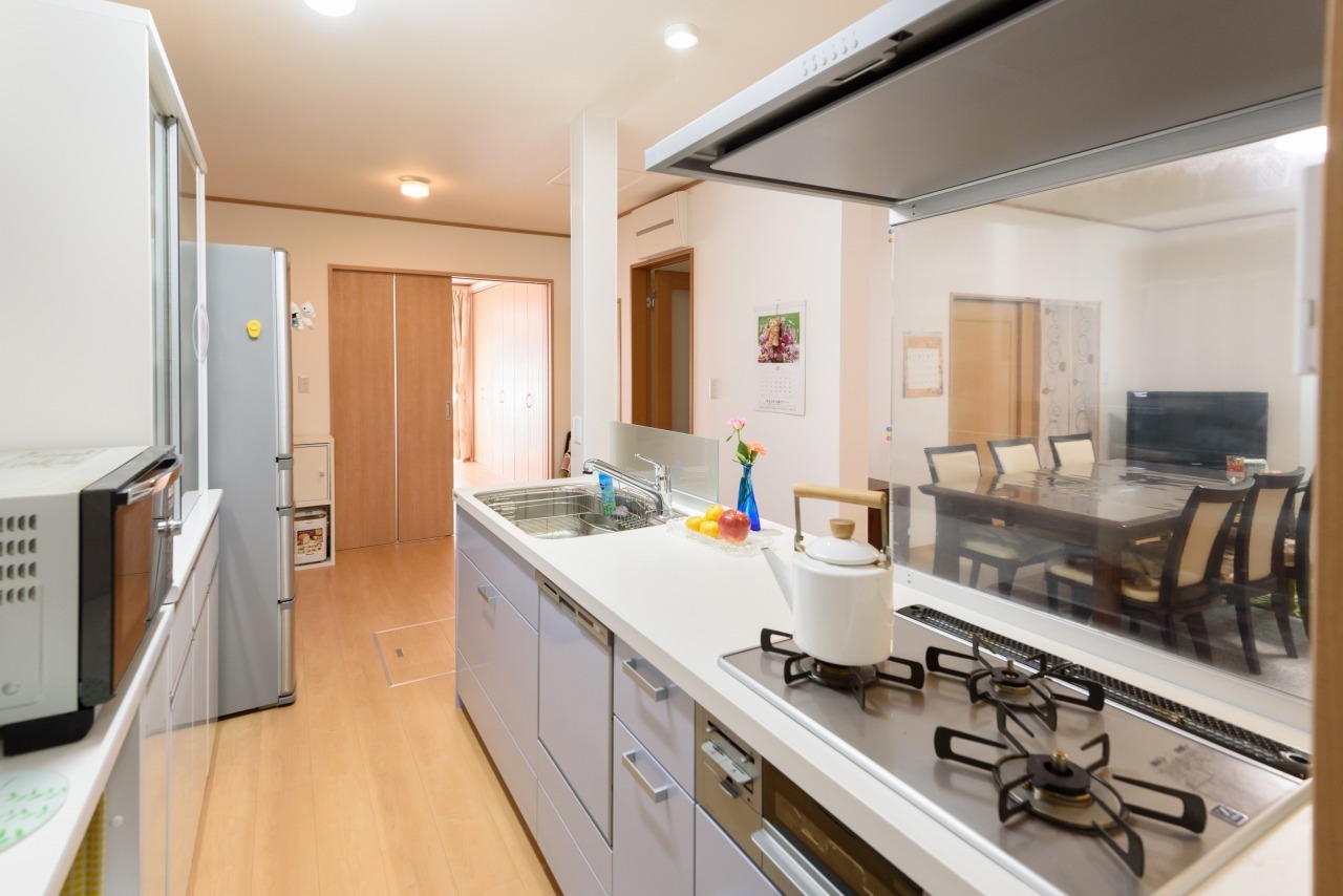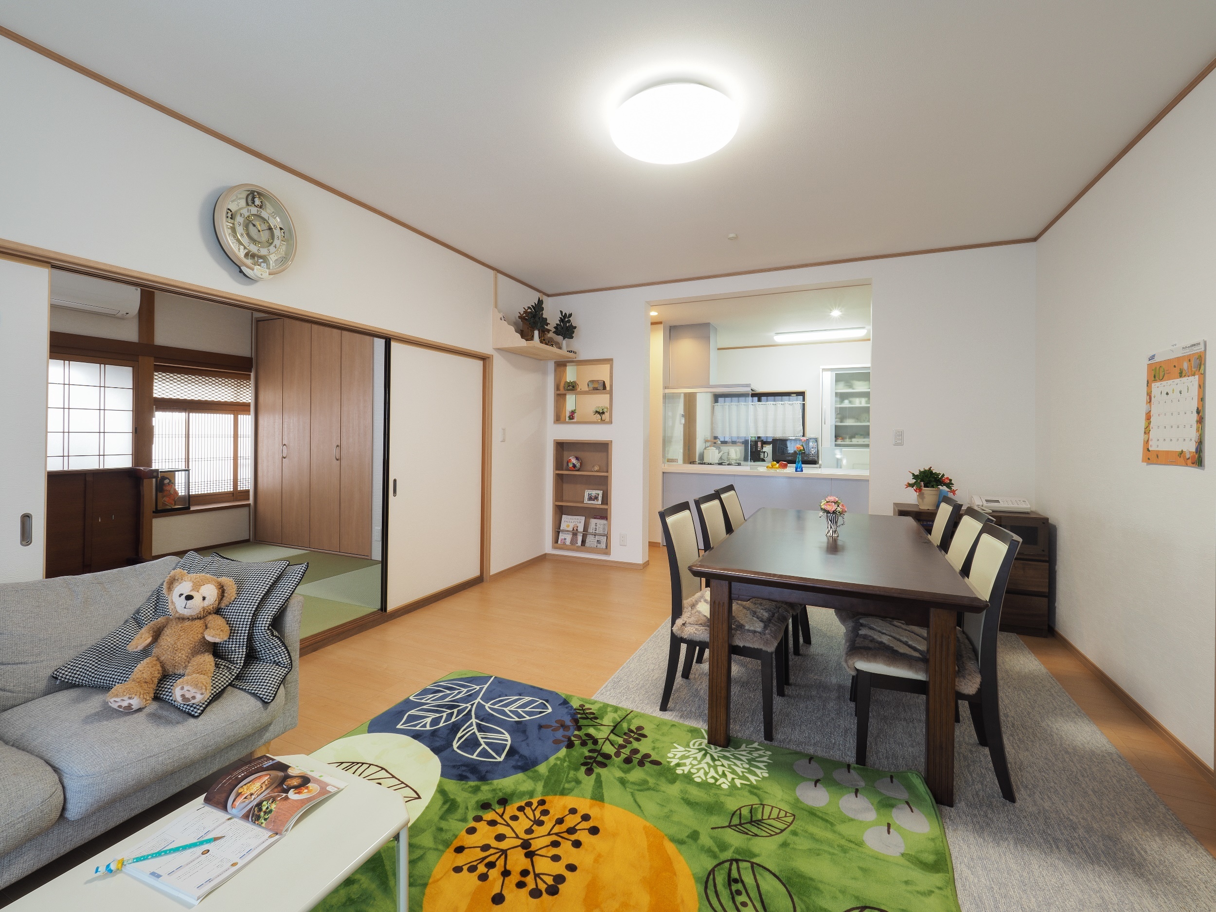 家事動線の中心に配置したキッチンからの眺めも一新して、お孫さんたちとも対話が楽しめるLDKになり、お料理上手なお母様にとても喜んでいただきました。