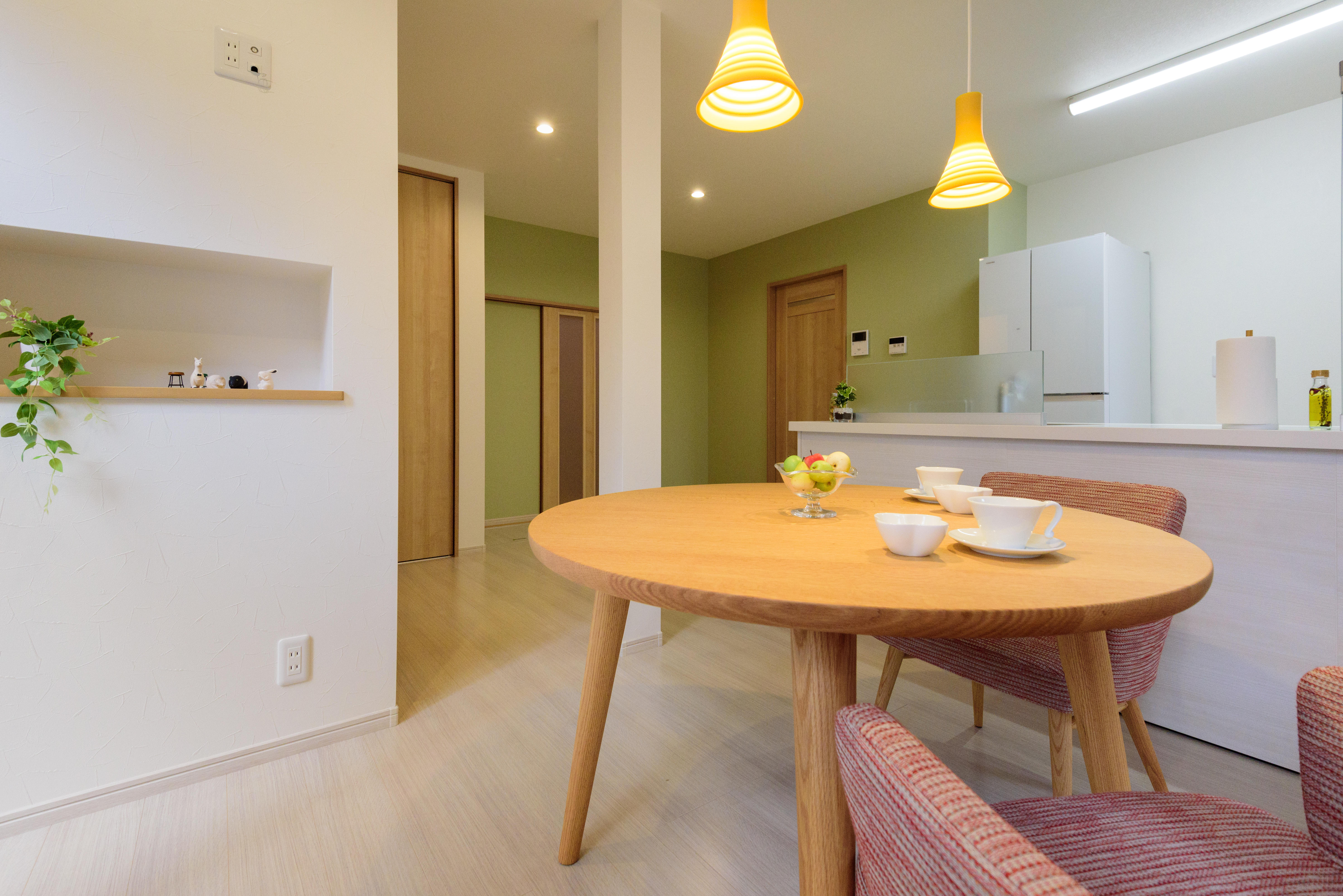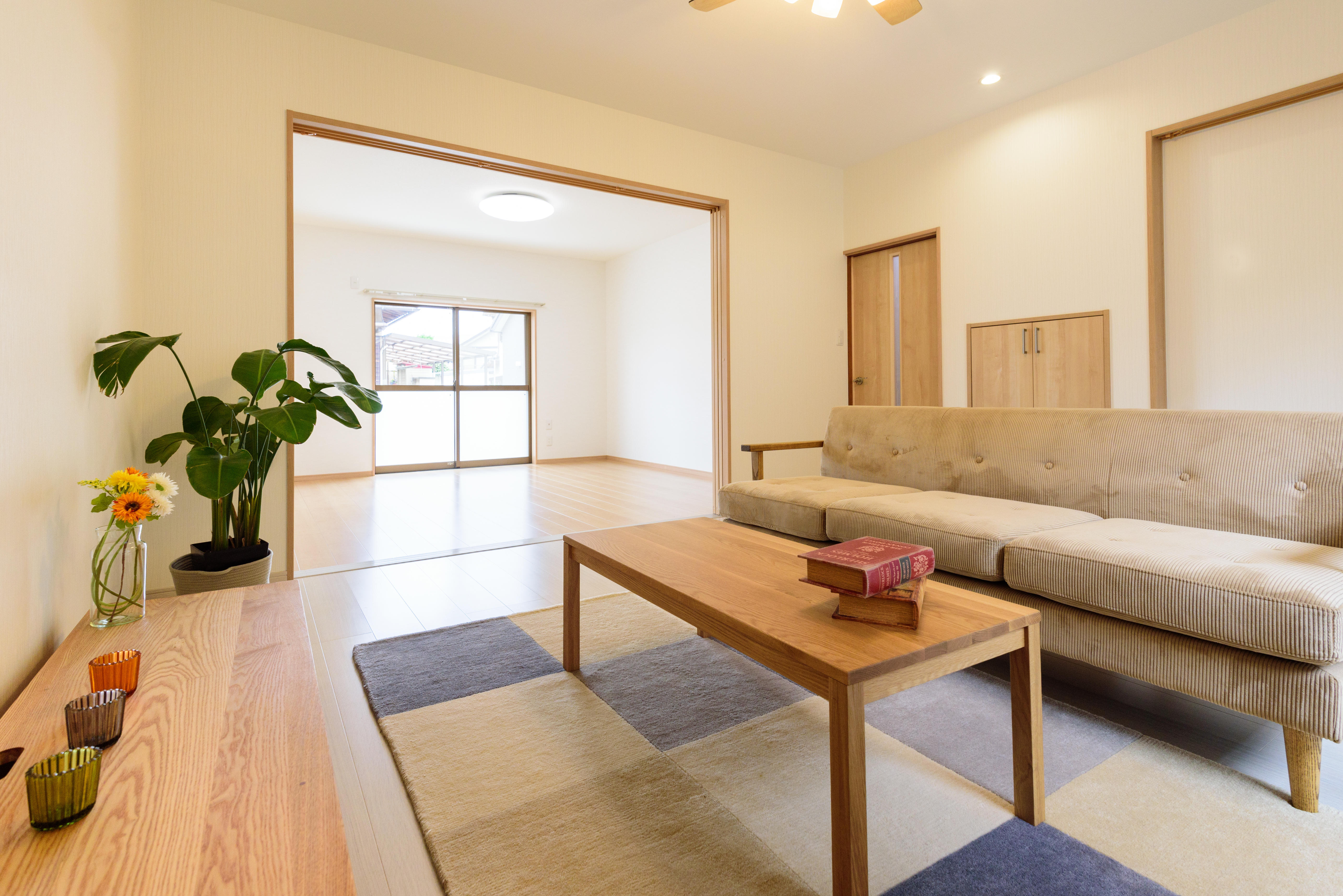 玄関からダイニングキッチンを通ってリビングへ繋がる間取りを変えたい。経年劣化の水廻りを新しくリフォーム。あまり利用させていなかったホール横の和室をリビングにしてダイニングキッチンとホールから出入りできるリビングにレイアウトを替えて季節やご利用シーンに合わせて間仕切るようにしました。中庭を囲うようになったダイニングとリビングが魅力です。