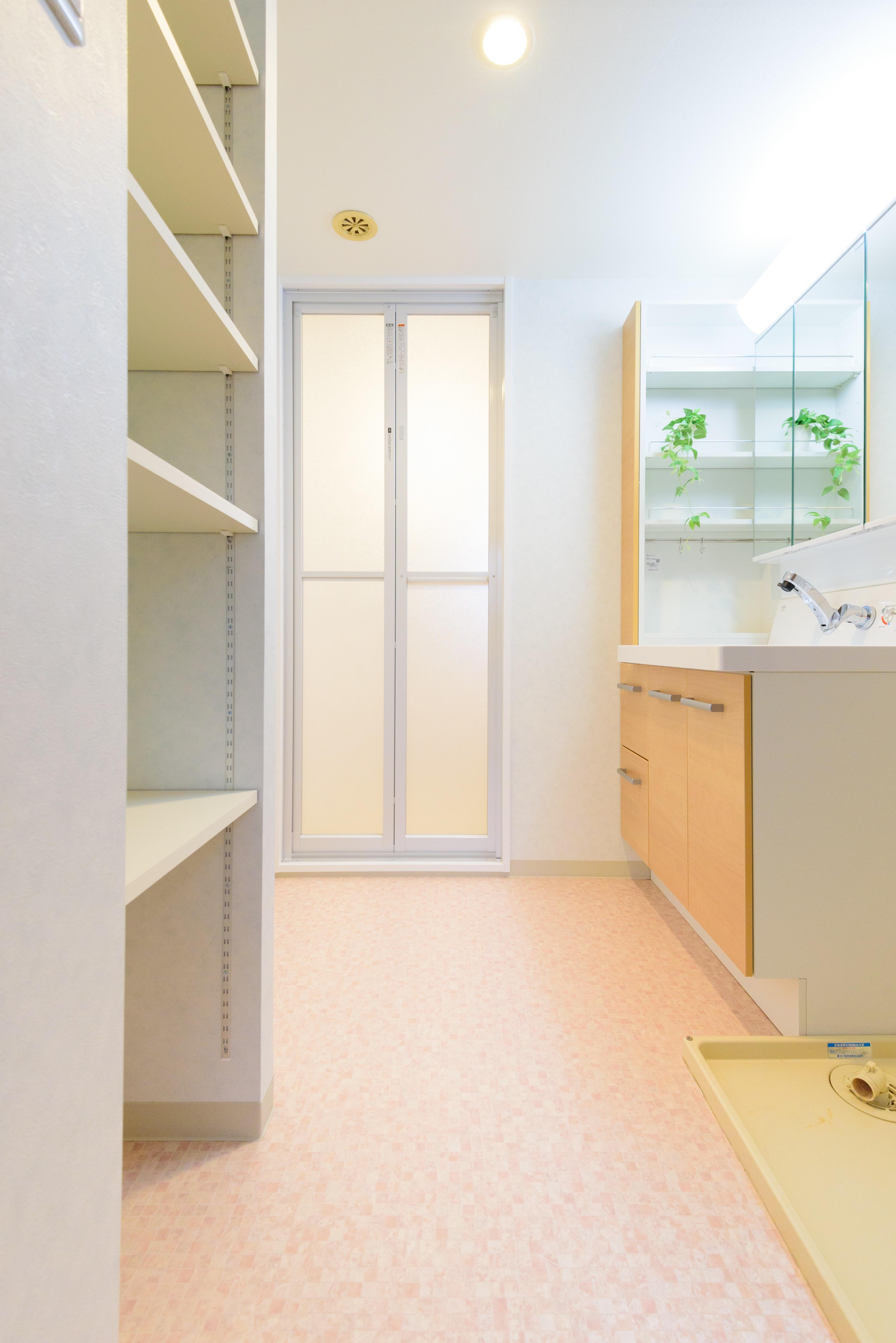 洗面化粧台はサイド収納付で幅90㎝。手前の収納棚は元の棚を使いやすく可動棚にしました。