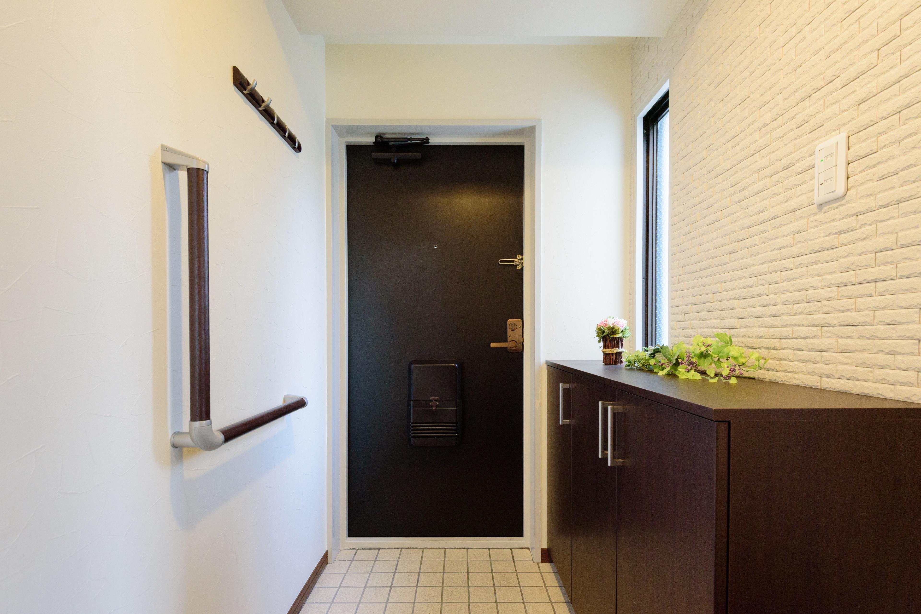機能性内装タイル エコカラット。デザイン性はもとより消臭機能や調湿機能がある優れもの!玄関収納は新しくお部屋イメージに合わされ新調されました。手すりや小物掛けもgood。