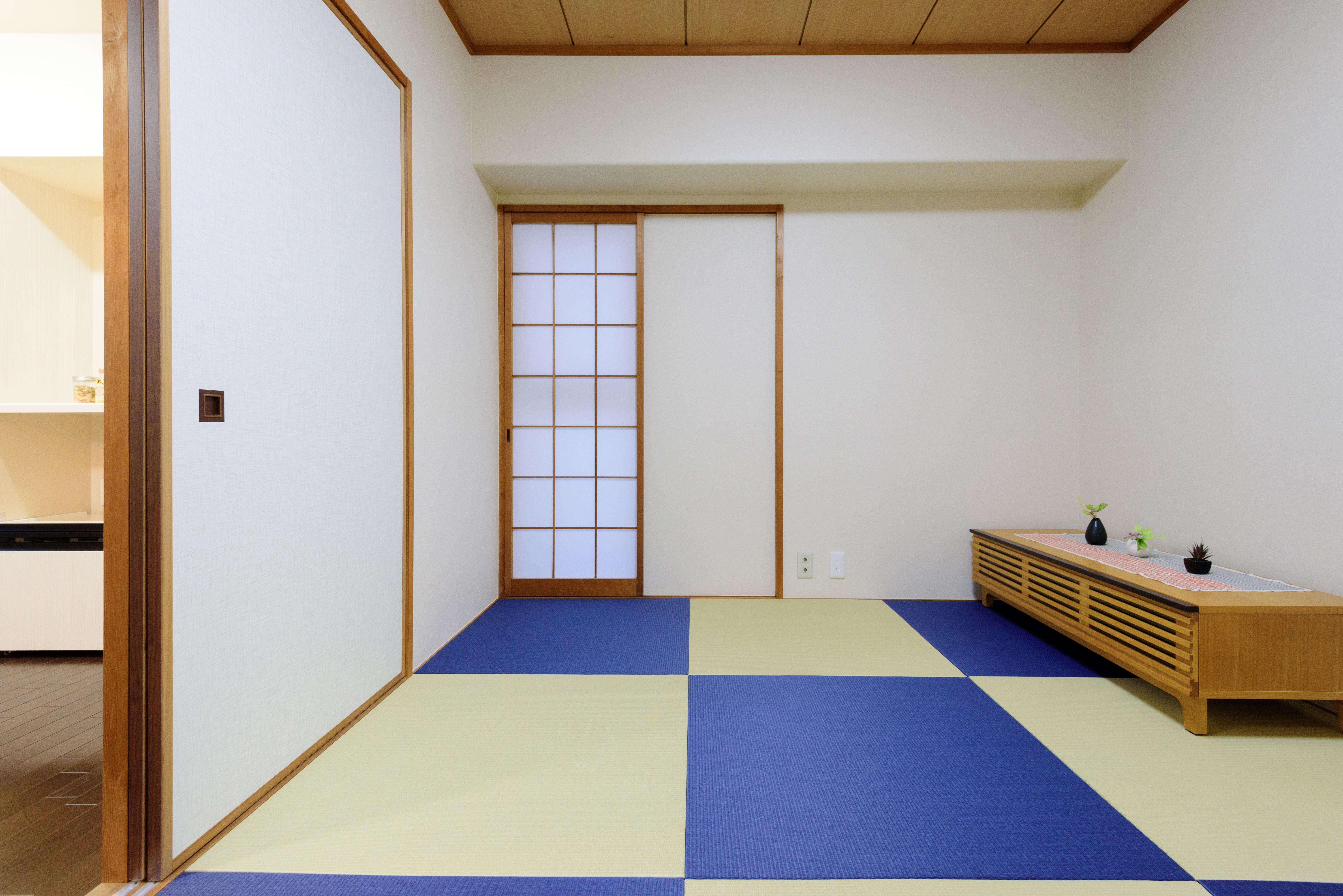 和室は2色の琉球畳を市松模様で仕上げました。とても明るい和室です。