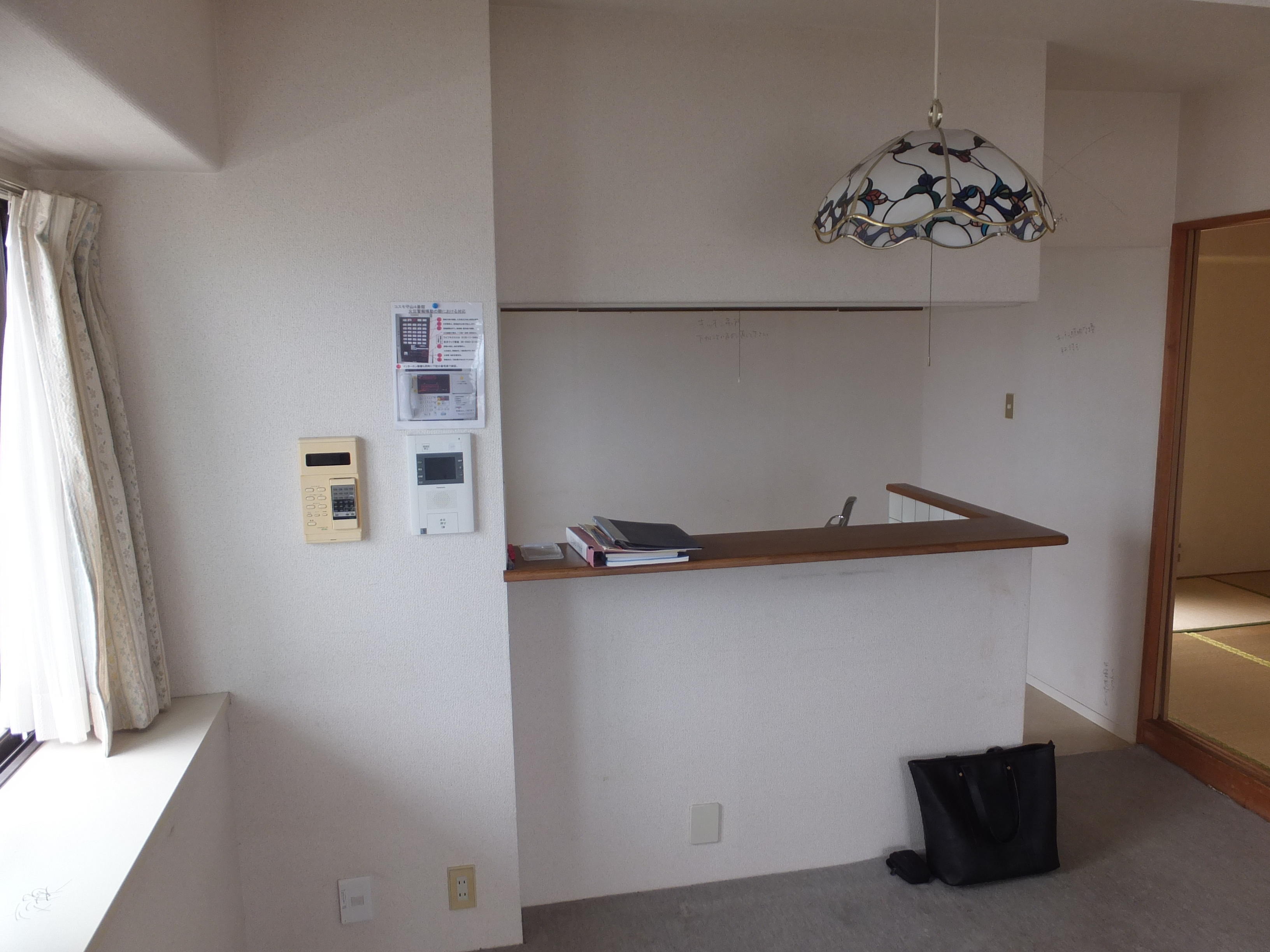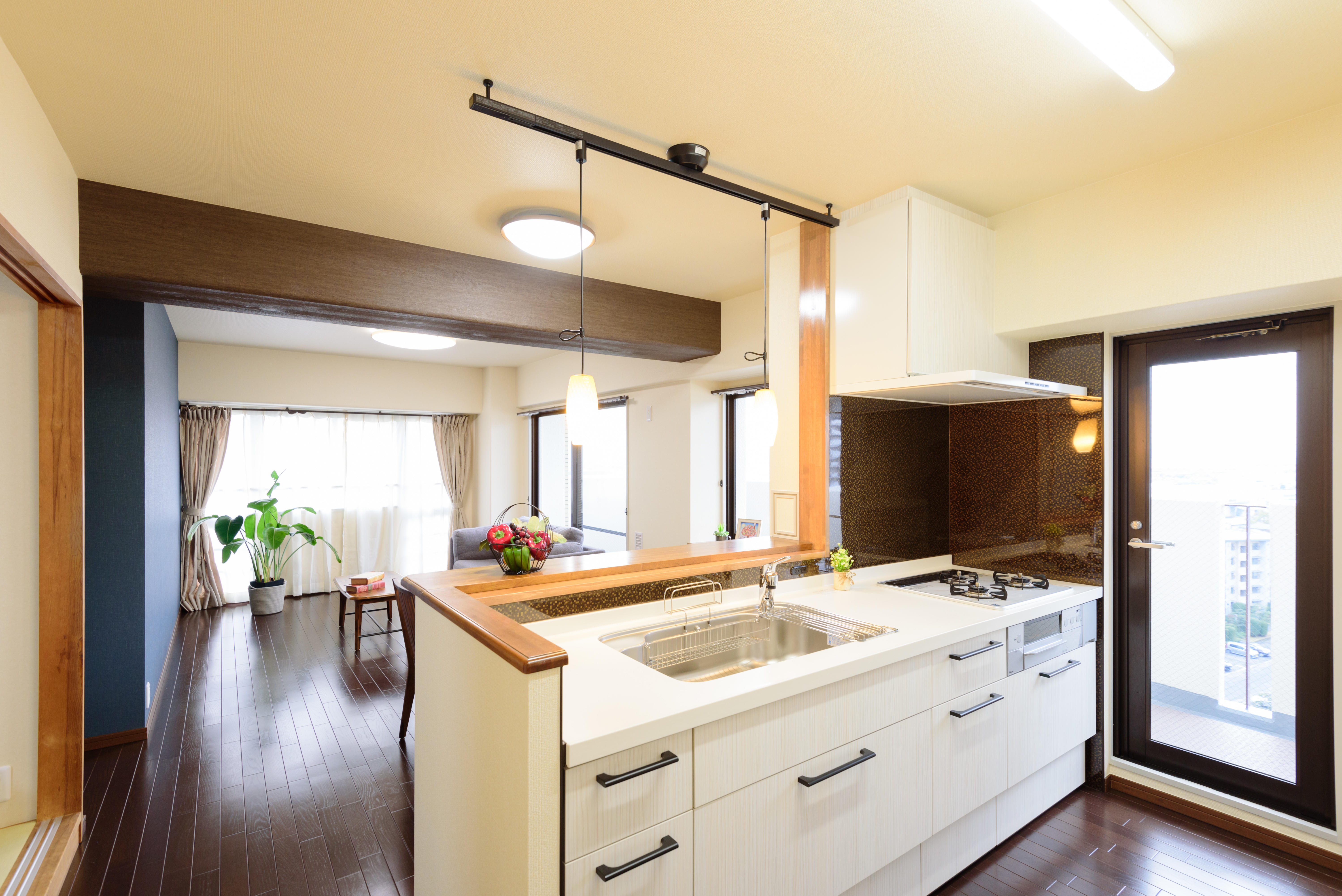収納たっぷりシステムキッチン!清潔感あふれる白のキッチンはモダンなお部屋を引き立てます。キッチンの黒取っ手と茶系のキッチンパネルが雰囲気に馴染んでいます。背面には家電収納と食器棚をお揃いで取付けました。