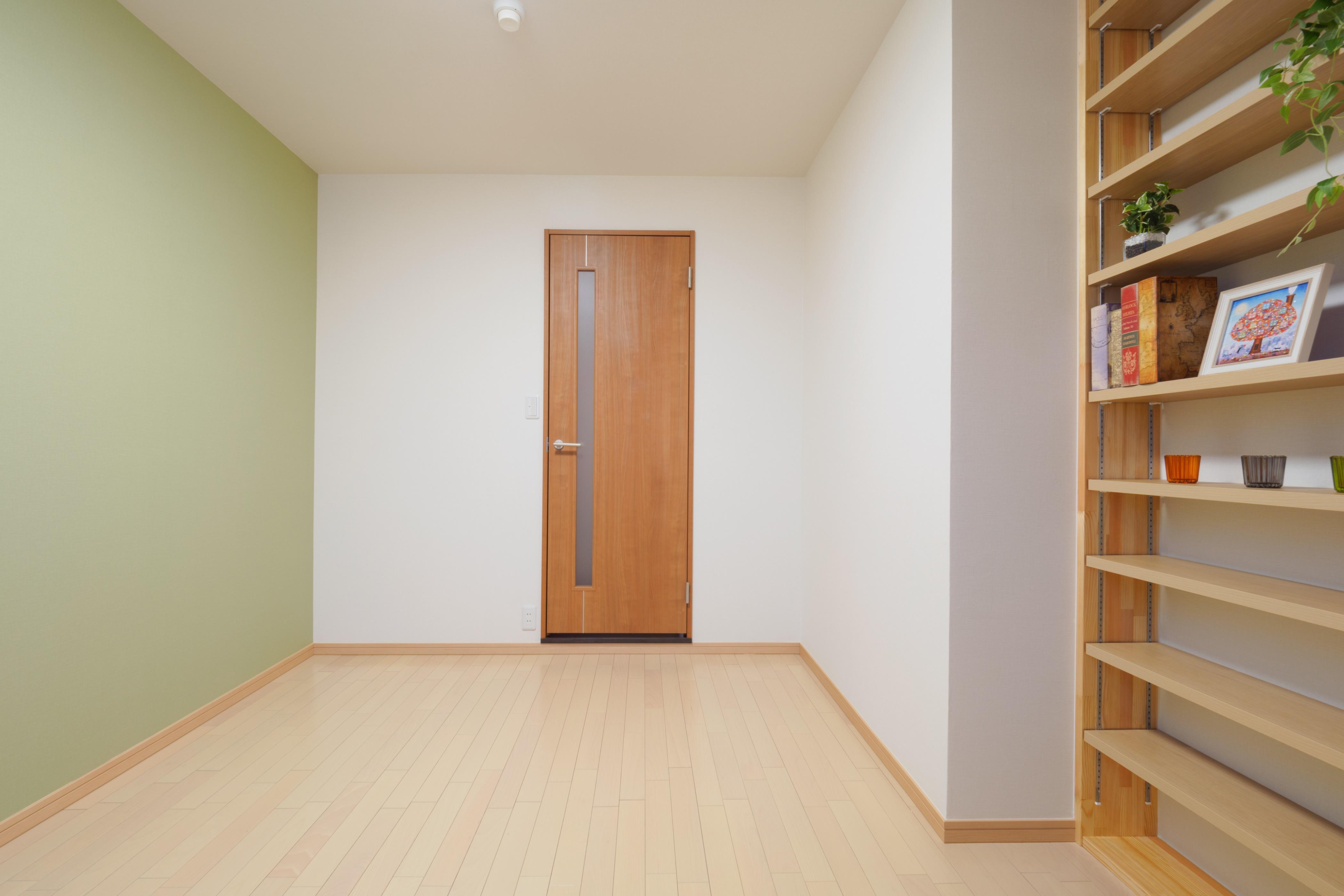 壁の一部をグリーン系でアクセント反対側は天井までの造り付本棚を取付けました。元はクローゼットだった所ですがたくさんの本を収納される書斎として。ナチュラルな仕上がりのお部屋となりました。