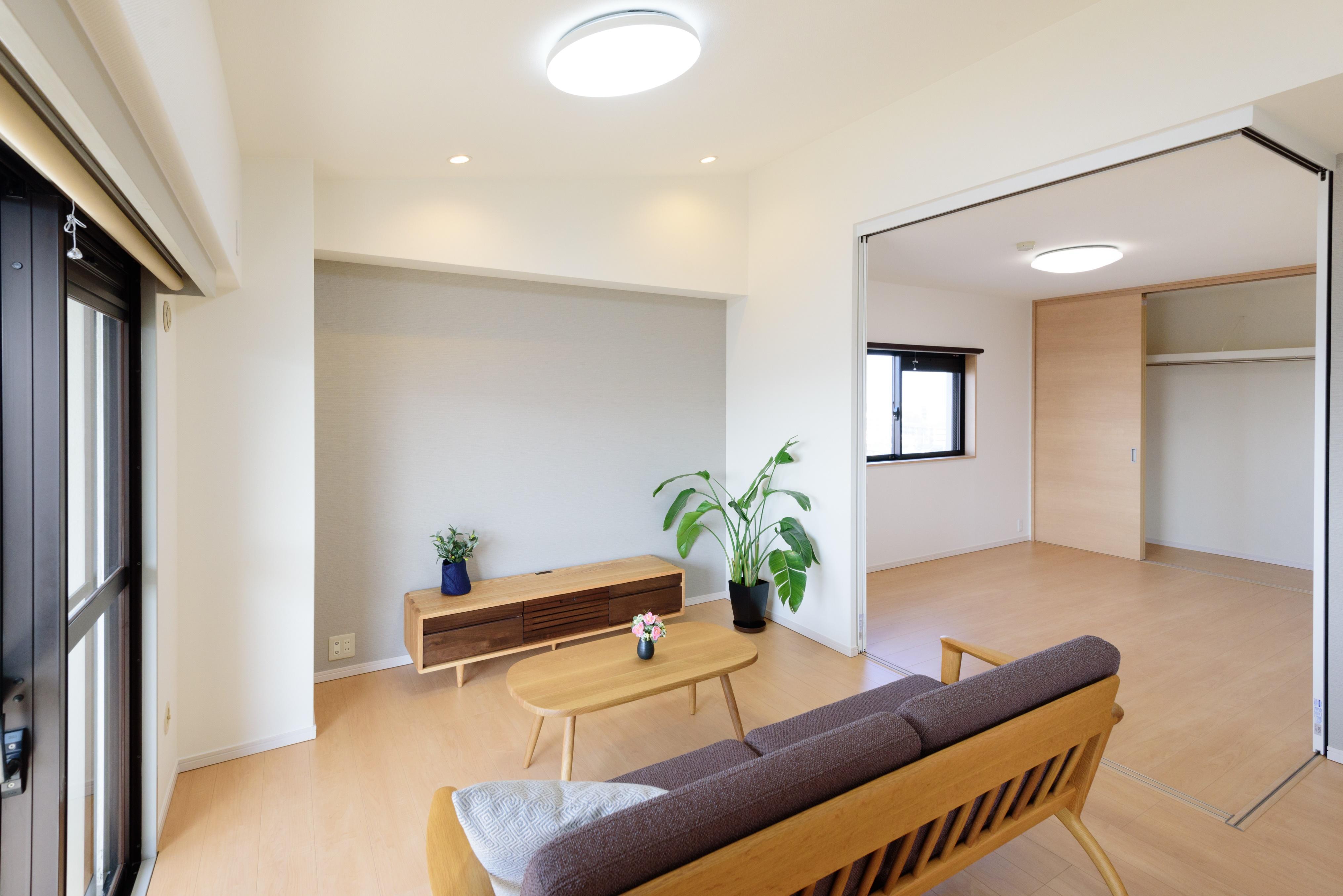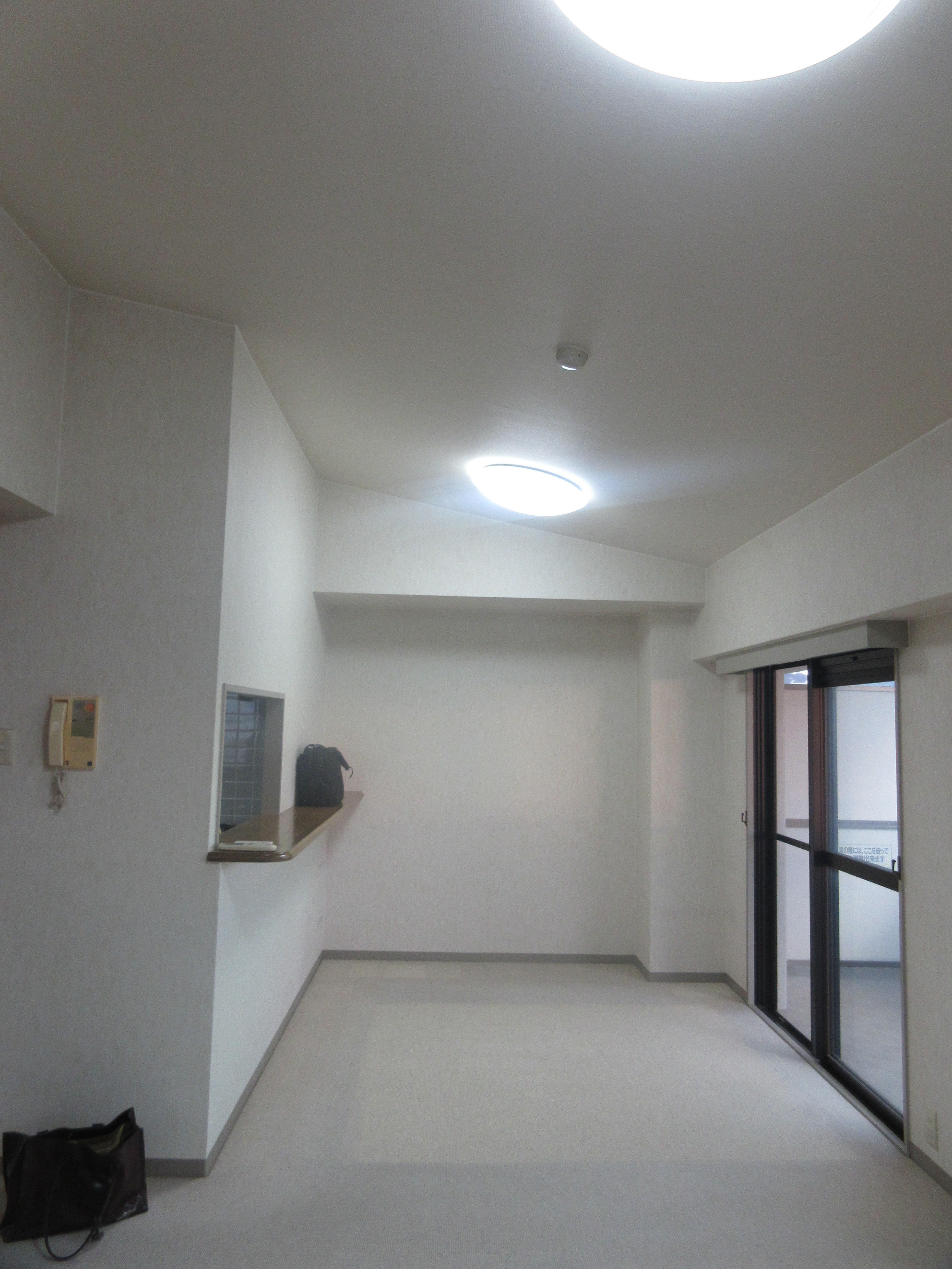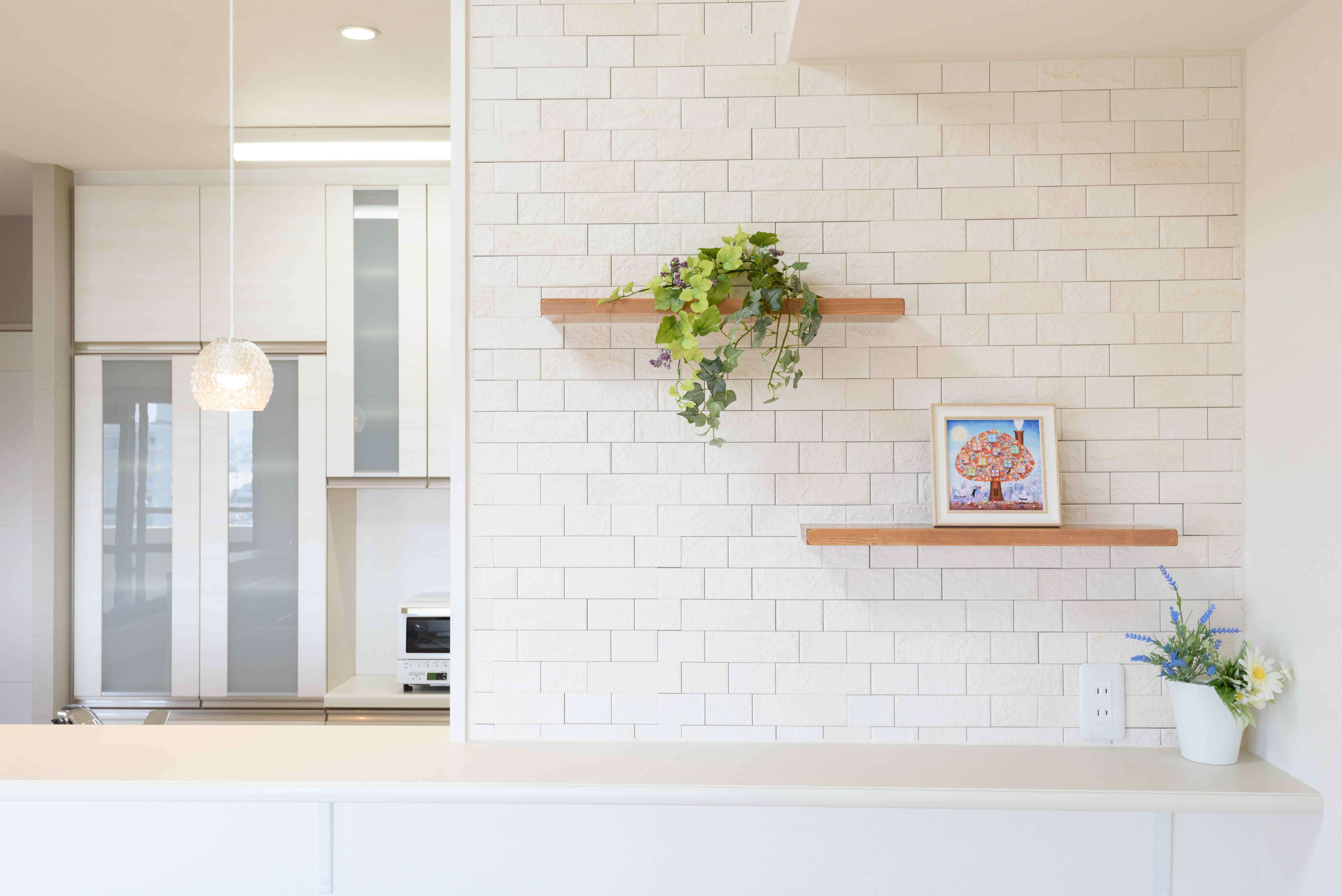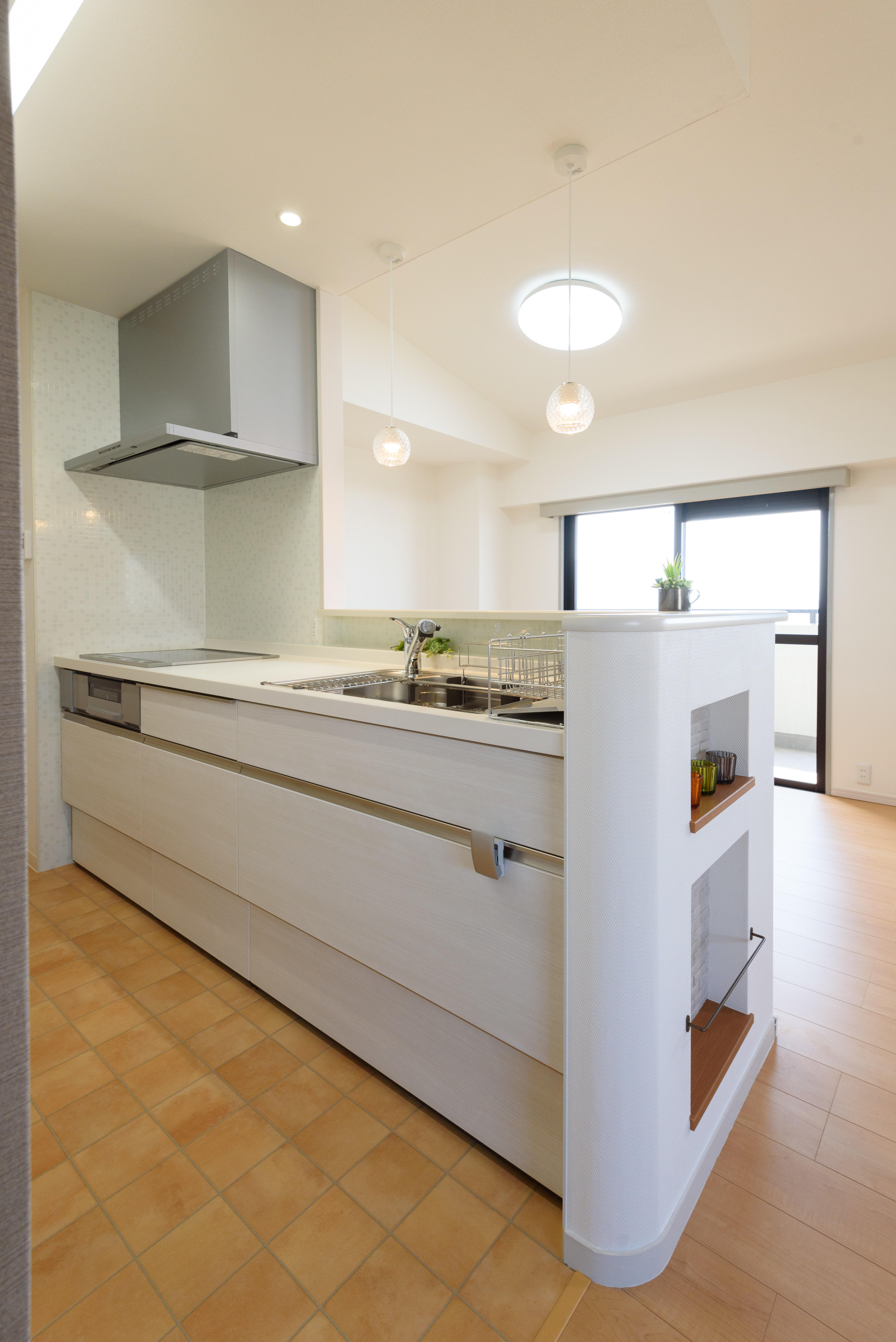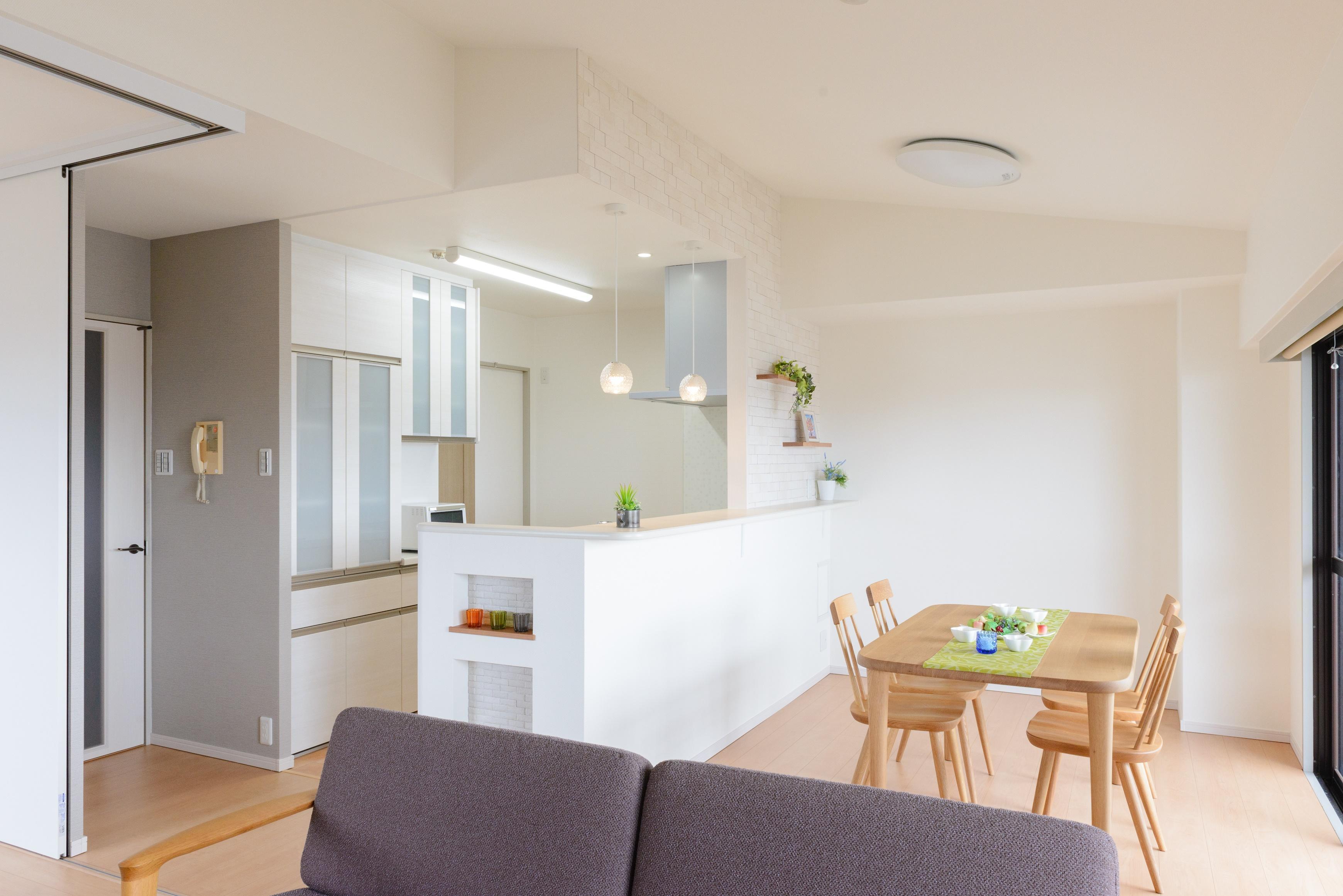 壁で囲われていたキッチンを開放的な対面キッチンへとのご要望で、2方向の上部壁を取り払い明るいキッチンに仕上がり、キッチンからリビングの様子も伺えます。床は絨毯からフローリングに貼り替えカジュアルな色調に。白を基調とした意匠がさらに明るさと広がりを持たせています。