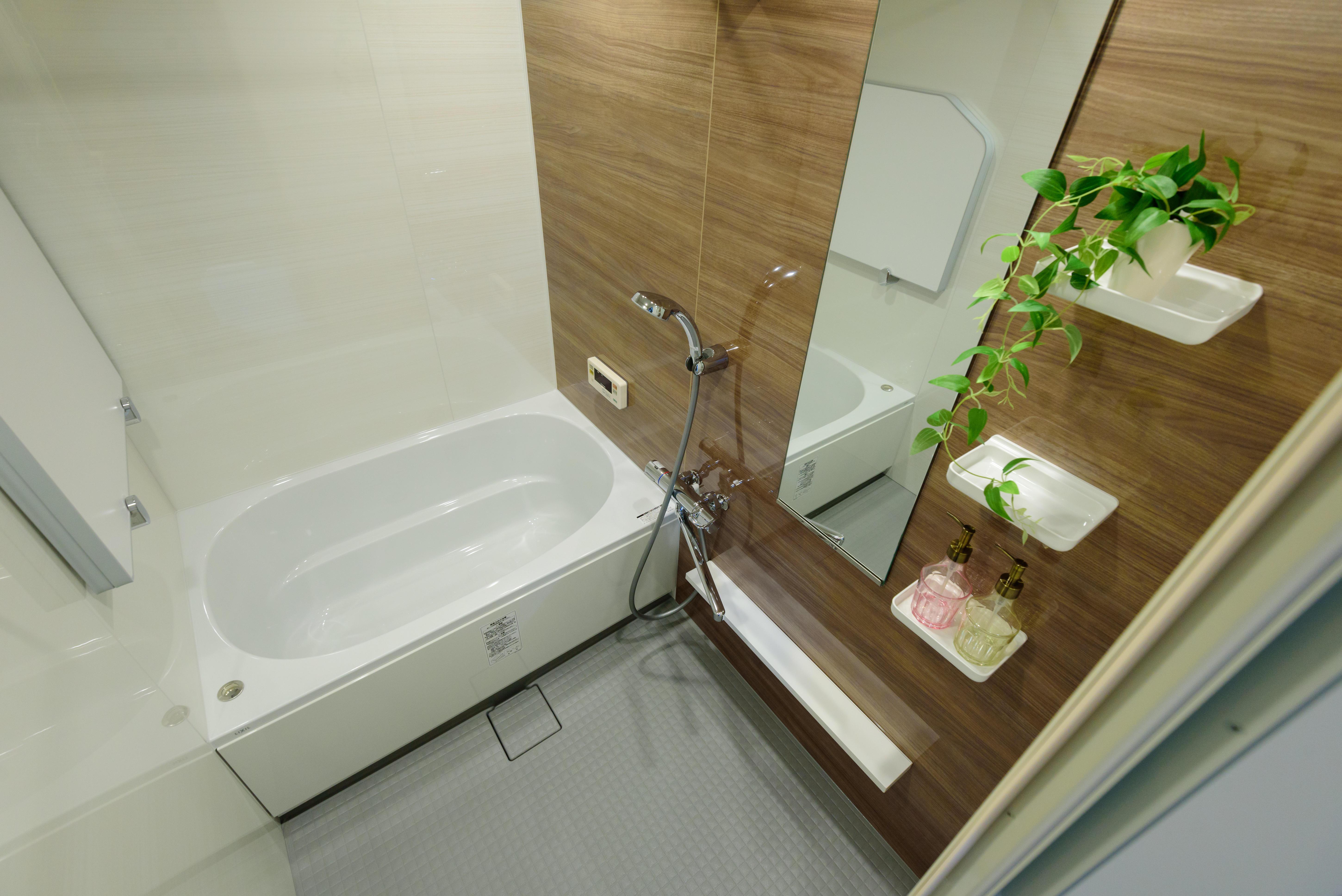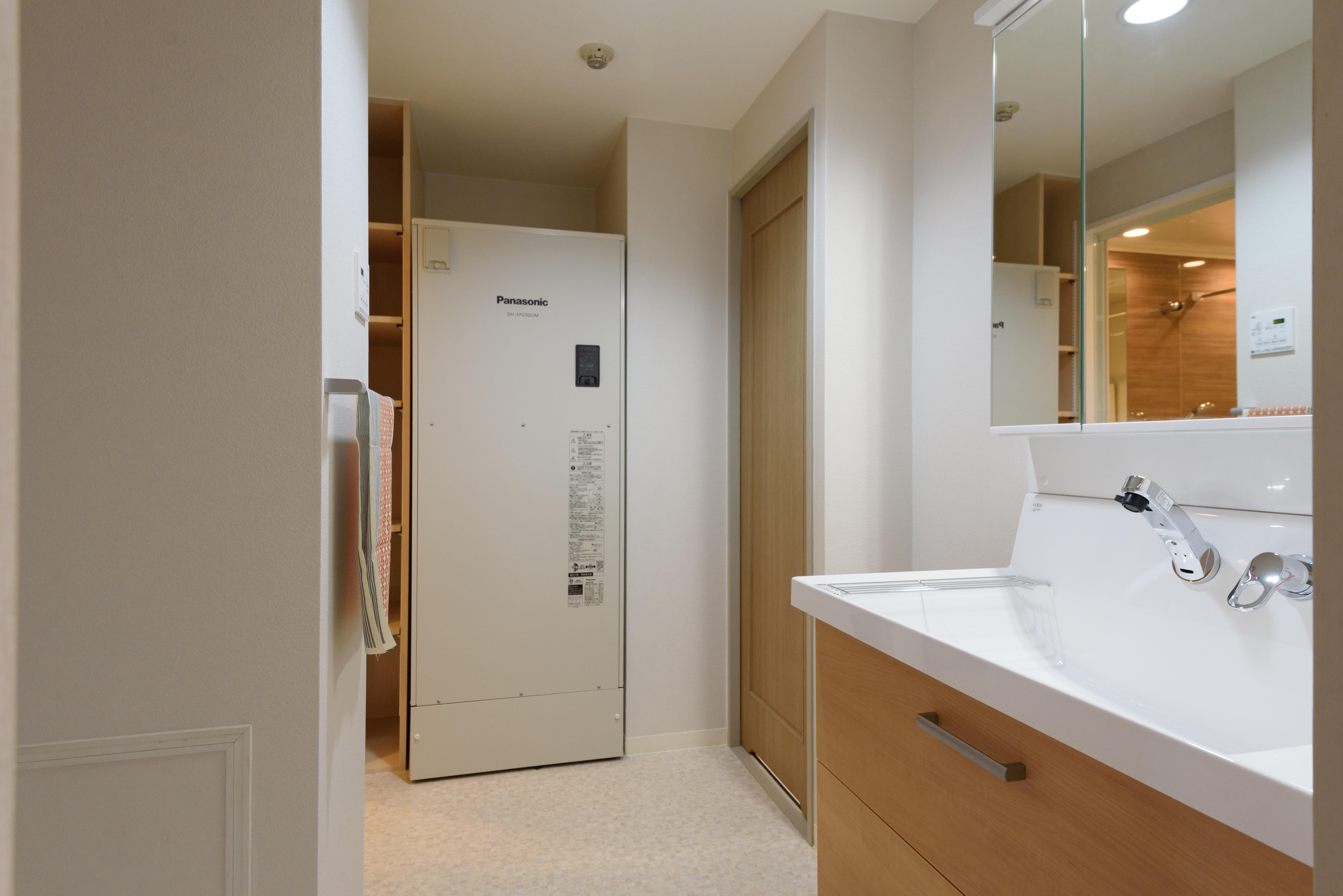 洗面化粧台は幅90㎝の大きめサイズで収納量を増やし、給湯器と浴室の空いたスペースに可動棚を設置。