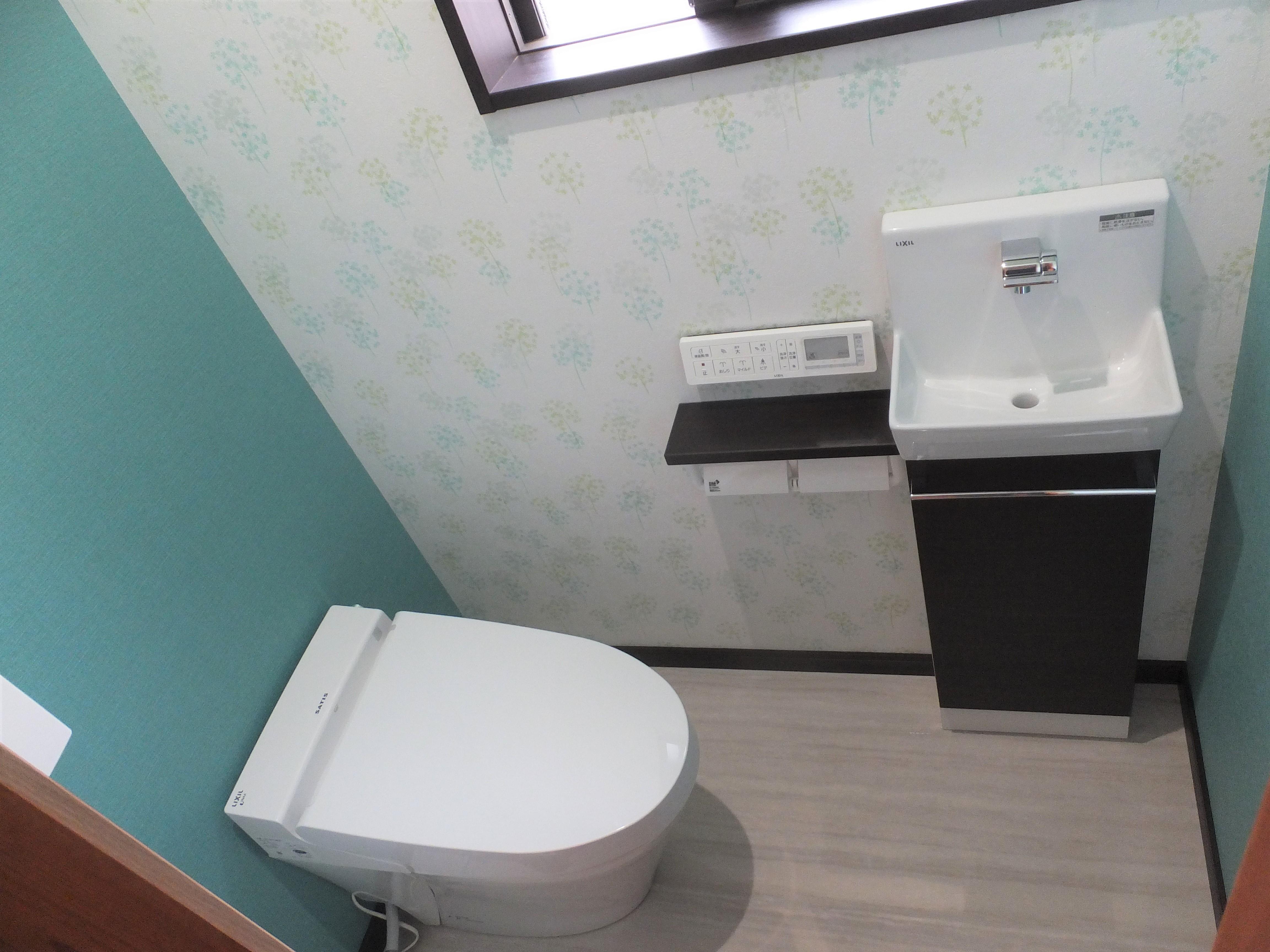 以前のタンクありから今回タンクレスにリフォームし、空間が少し広くなり、ゆったりと使用できるようになりました。 壁紙を色を変えて貼ったことにより、デザイン性が増しました。