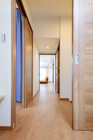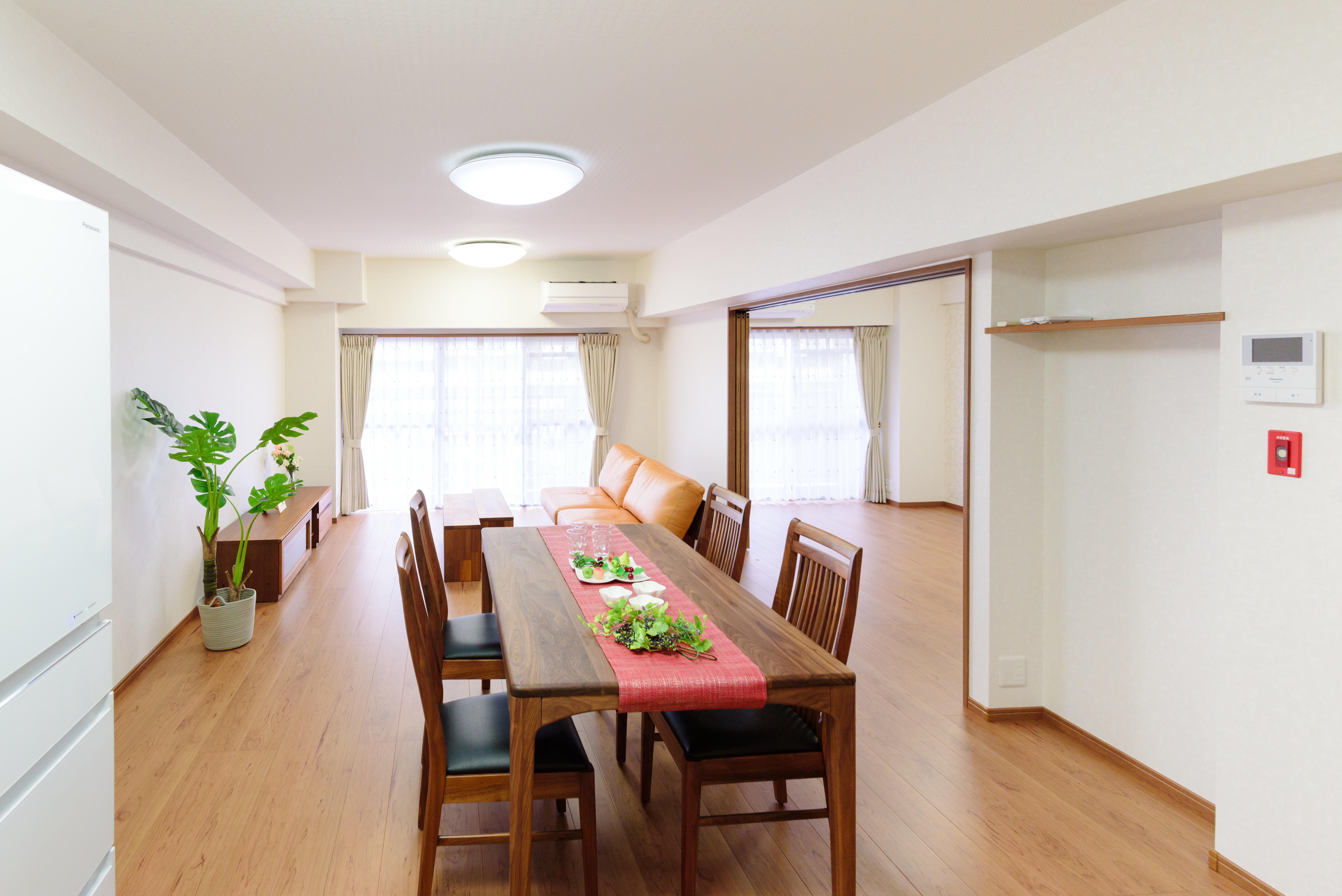 全室バリアフリー化のフルリノベーション。建具は全て引戸に玄関ホールからフロアを貼り替える事でバリアフリーを実現。リビング横の和室は洋室にし、3枚連動引戸で開け閉めでき、開放的な空間となりました。引戸の開閉により生活シーンに合せた使い方が出来ます。