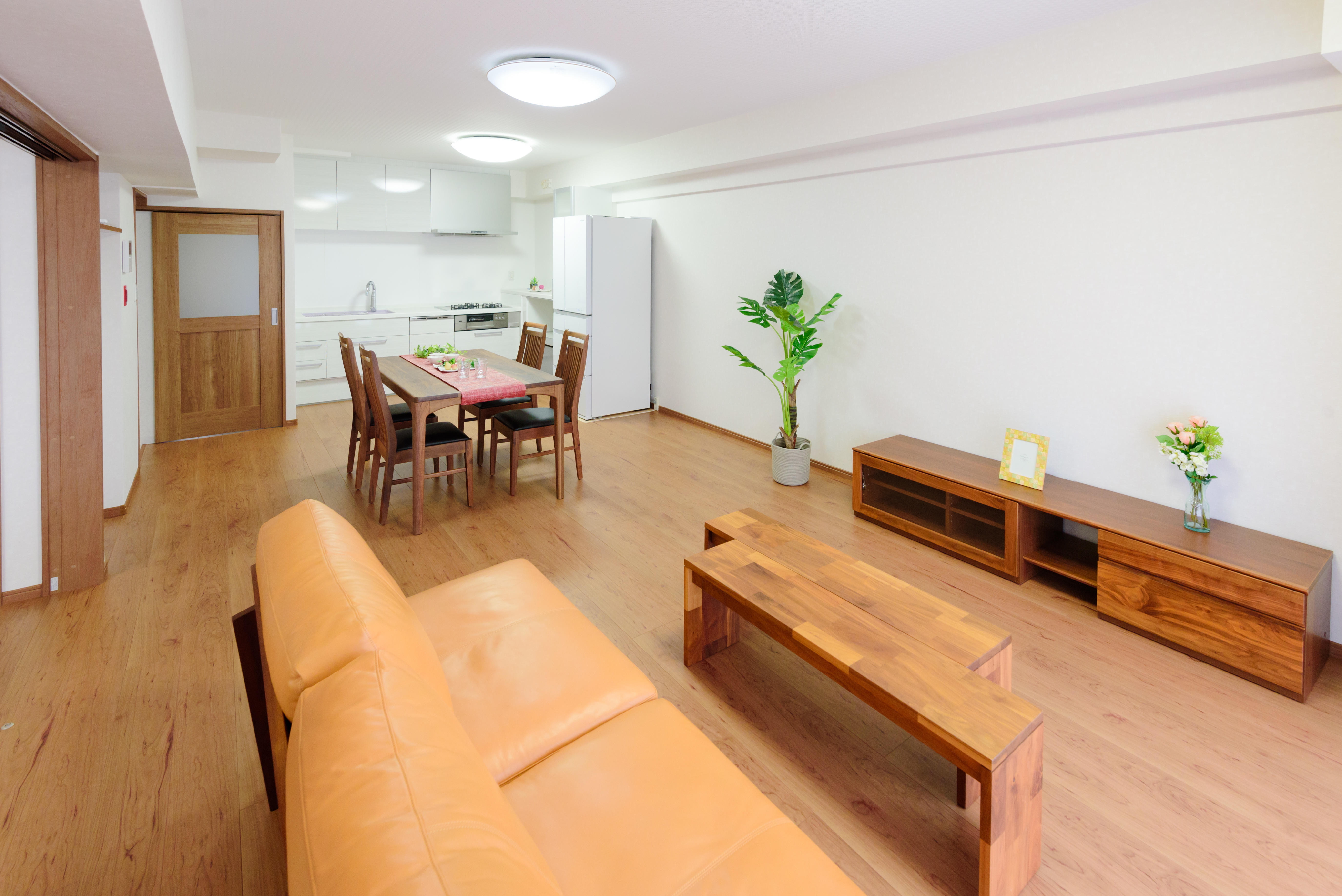 建具は木調の落ち着いたチェリー柄、ホワイト系のキッチンと壁紙が統一感を持たせ、家具を引き立たせています。