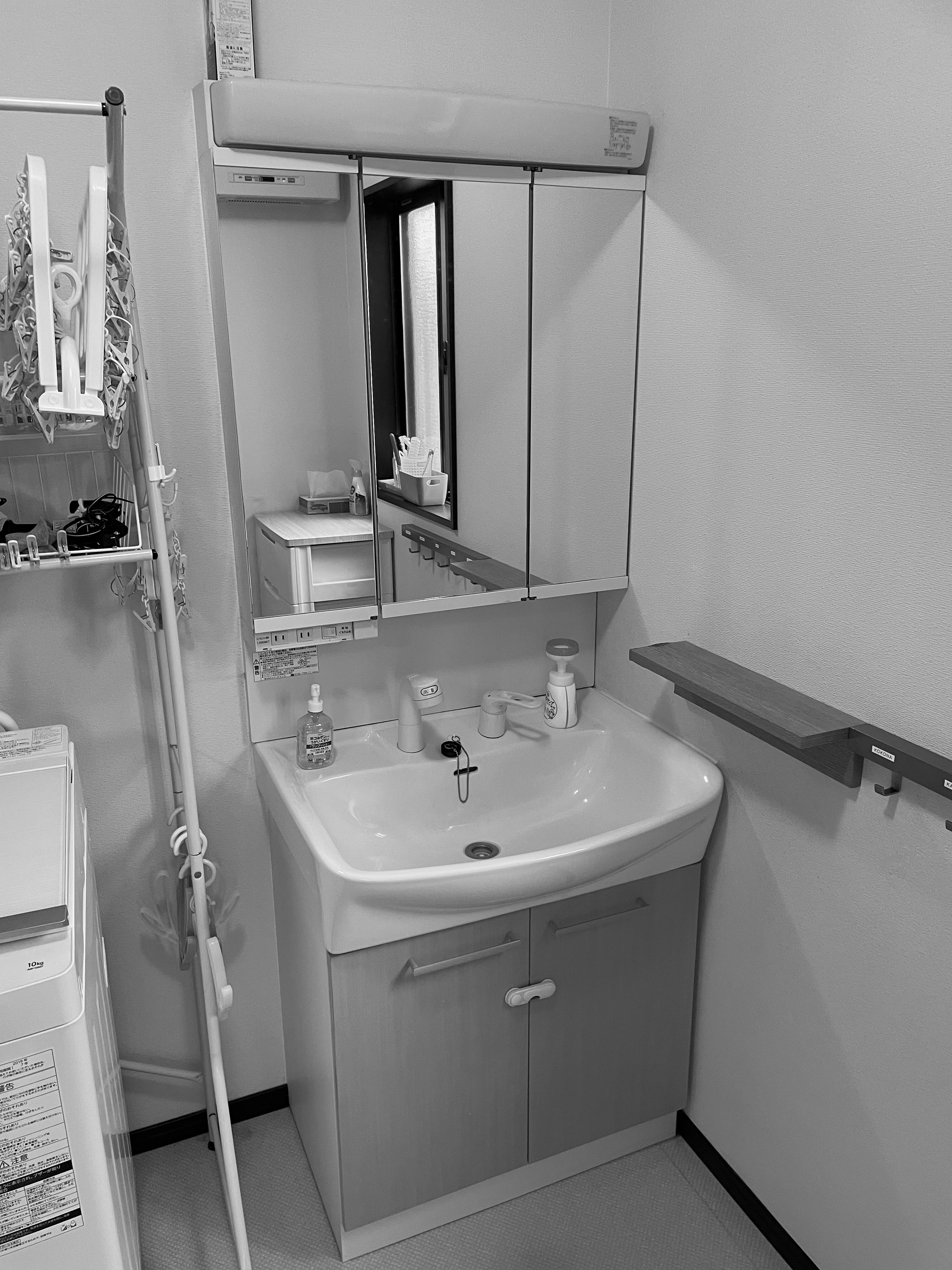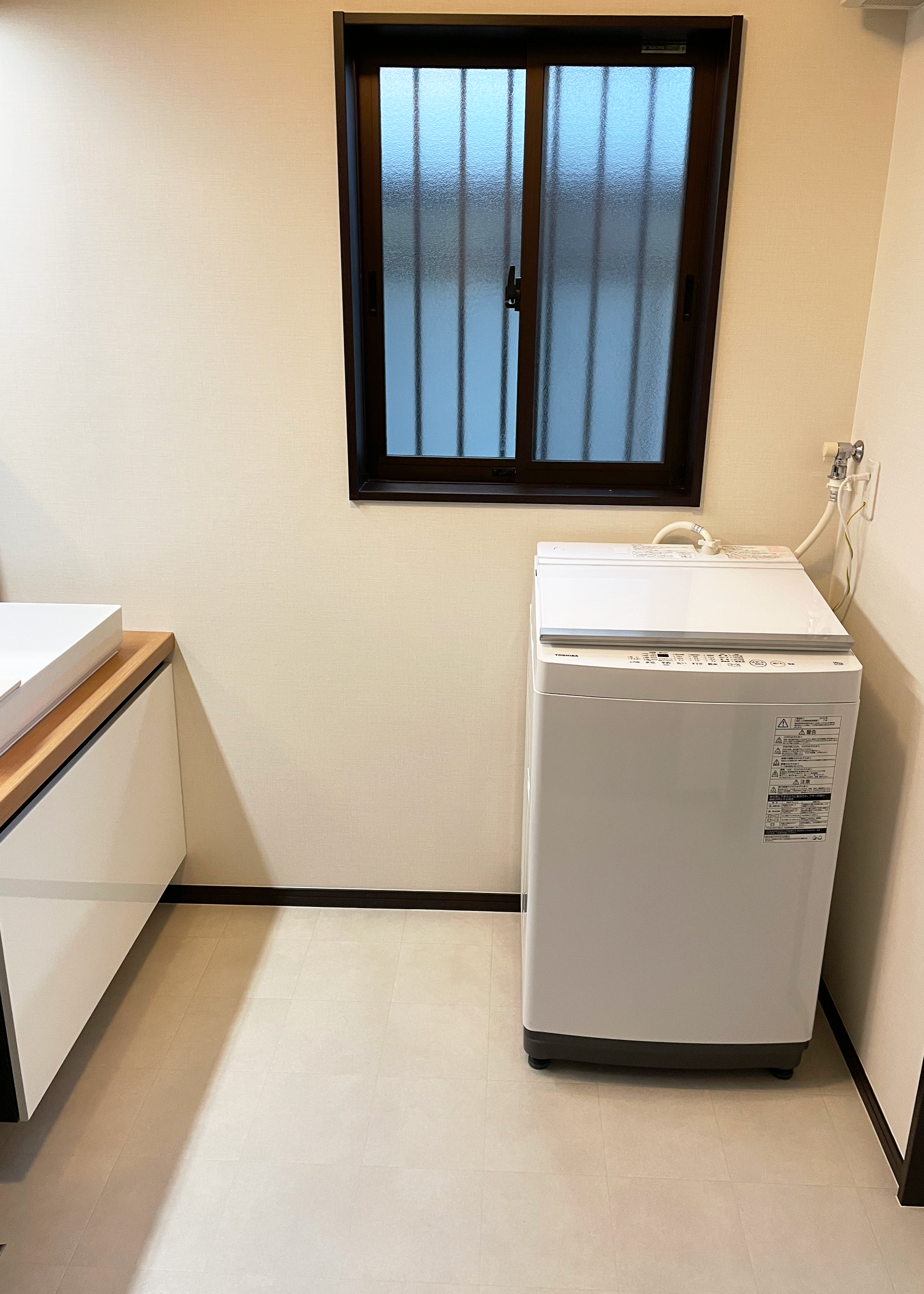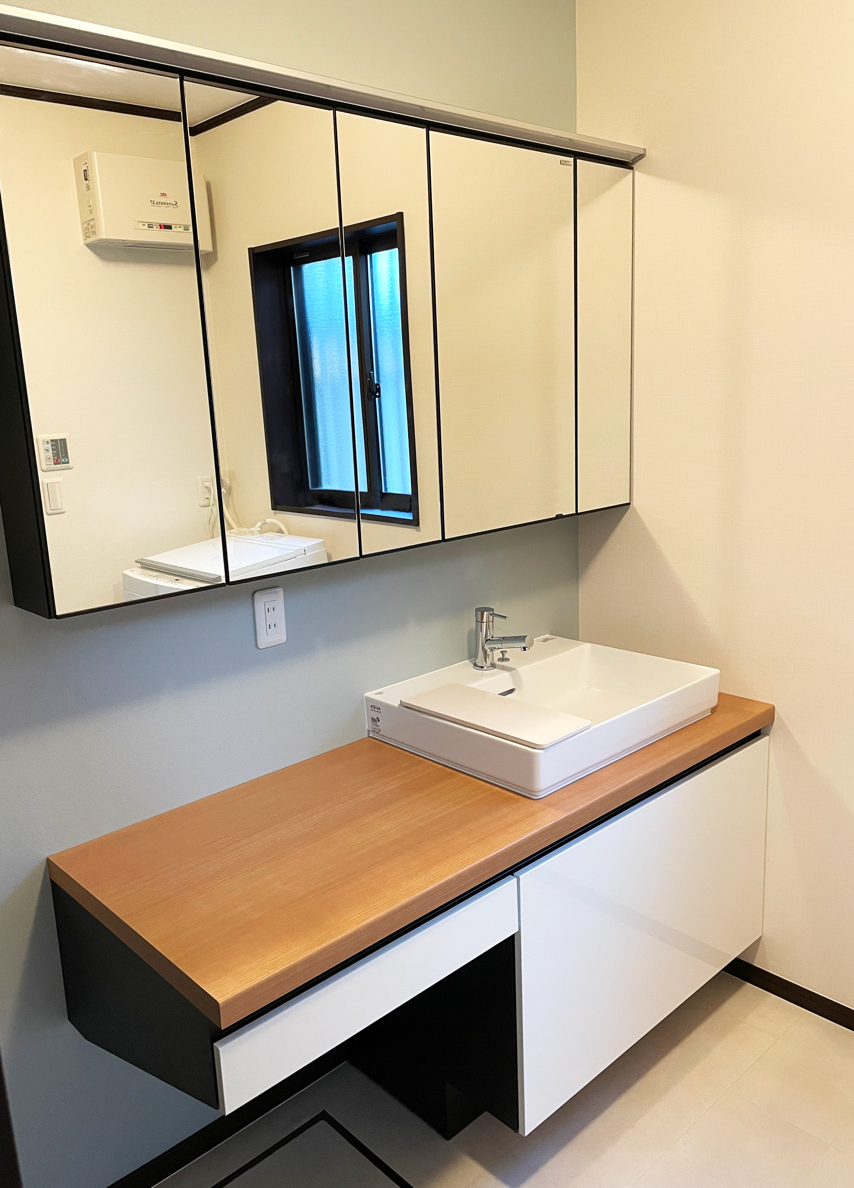 お嬢様が3人いらっしゃるT様邸の朝は洗面が取り合いになり、奥様はストレスを抱えていらっしゃいました。そこで、取り合いにならないような大きな洗面に取り替えたい!とリフォームのご依頼をいただきました。洗面横にあった洗濯機は浴室側に移動することで、間口150cmの大きな洗面を設置することが可能に!大きなミラー、手洗い器の横にカウンタースペースがあるので広々と使えます。朝のストレスから解消され、気持ちの良い朝を迎えることができますね。