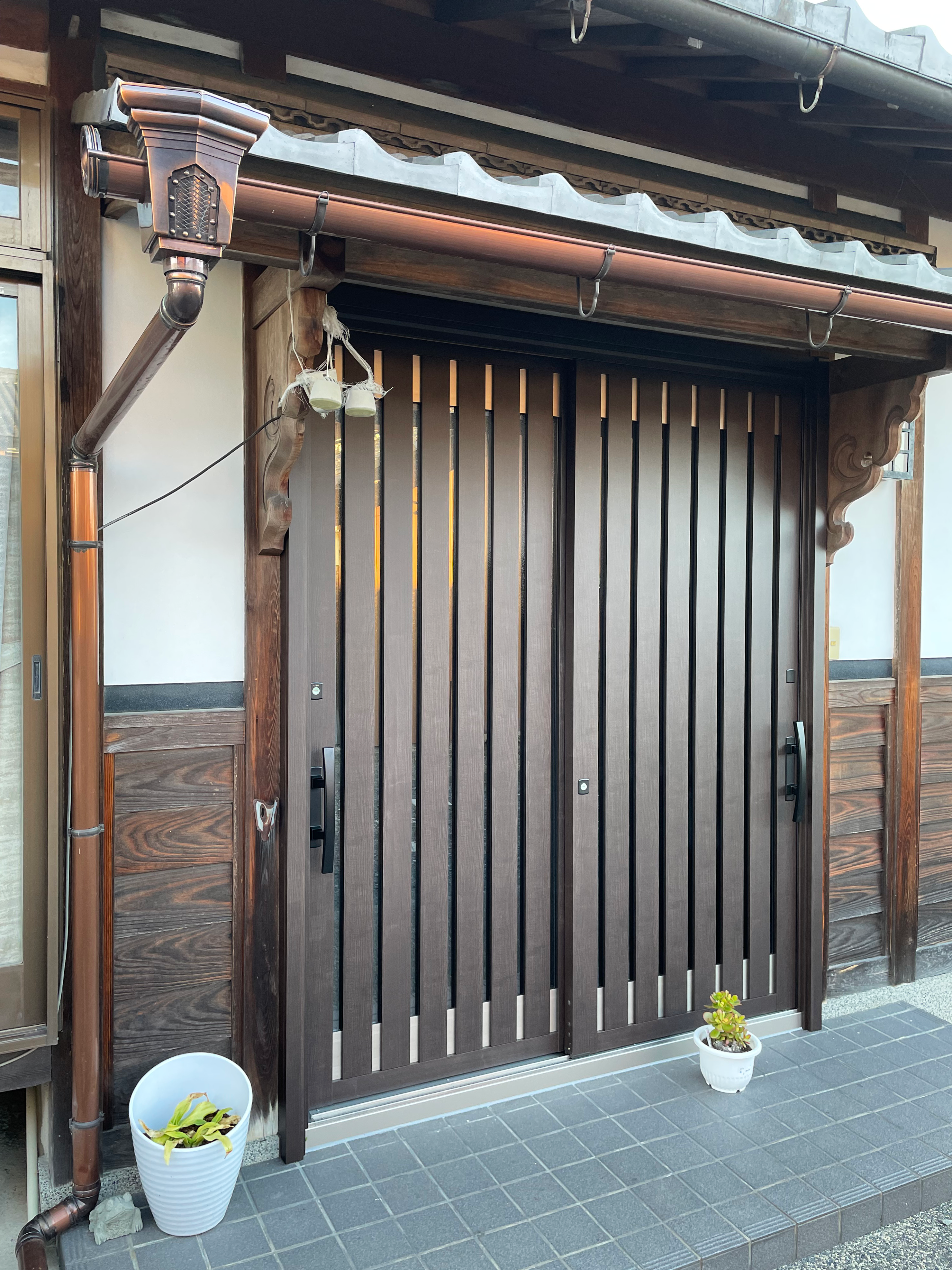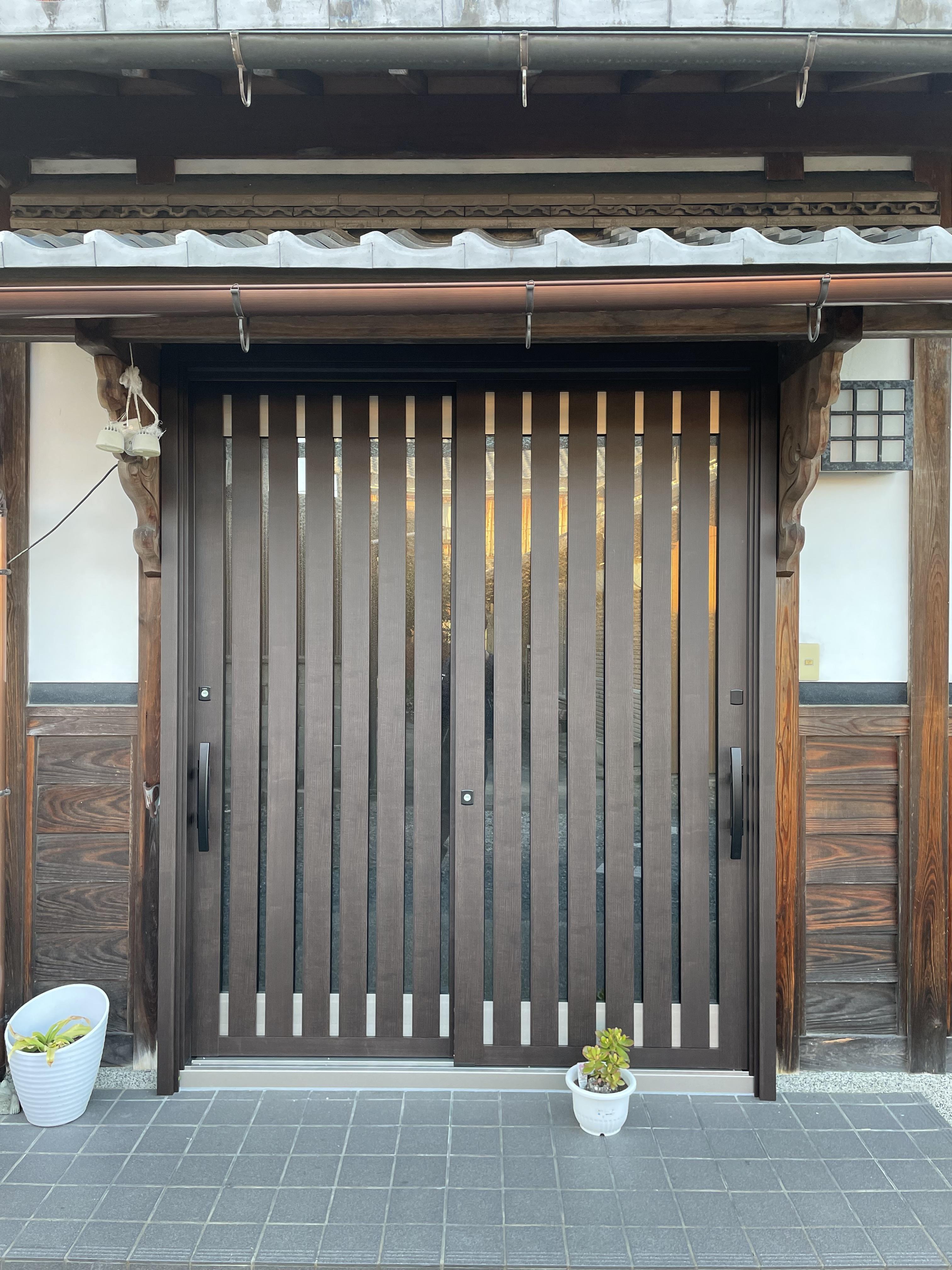 引き戸から引き戸へのお取替え。同じLIXILのリシェントで、同じブラウン系でもデザインが違うだけで玄関周りの雰囲気もがらりと変わりました。お洒落な和風玄関です。
