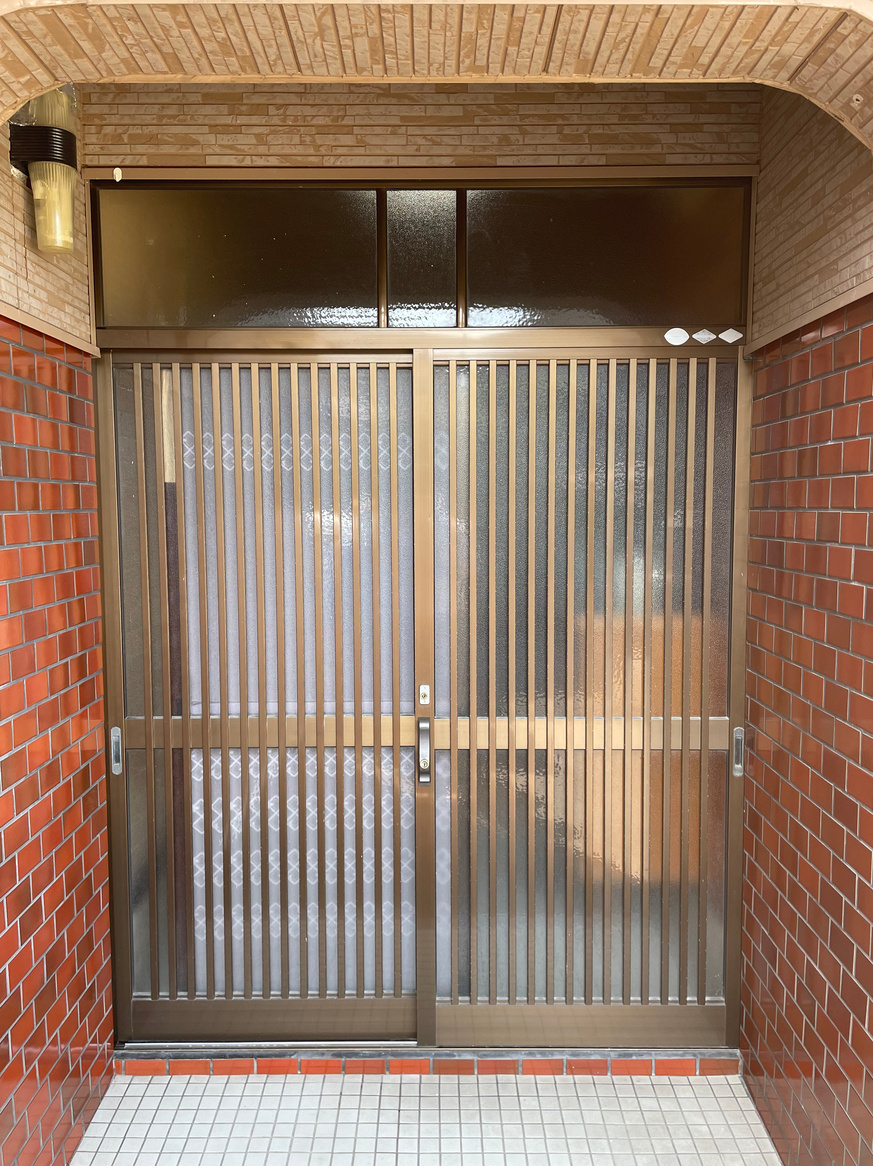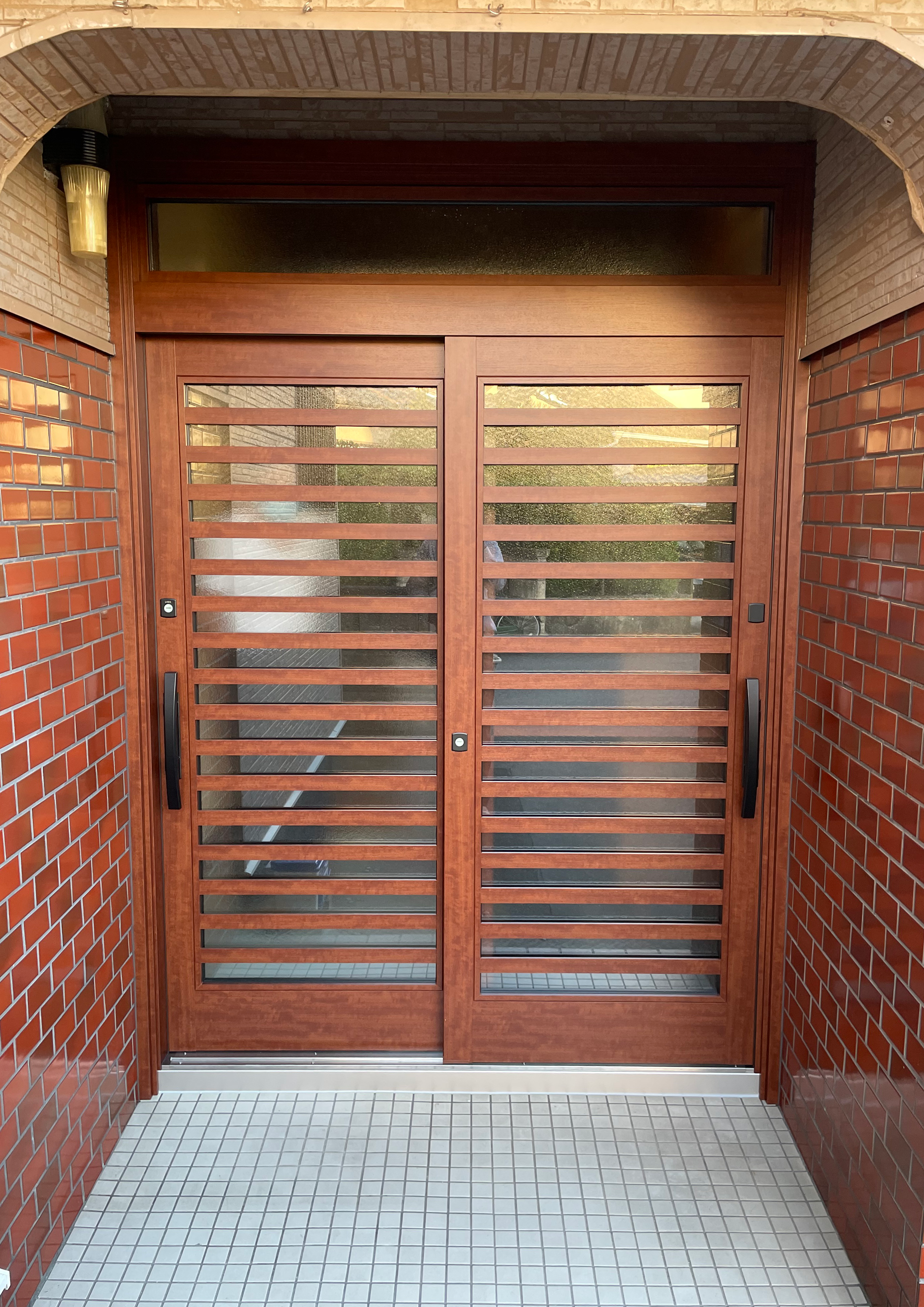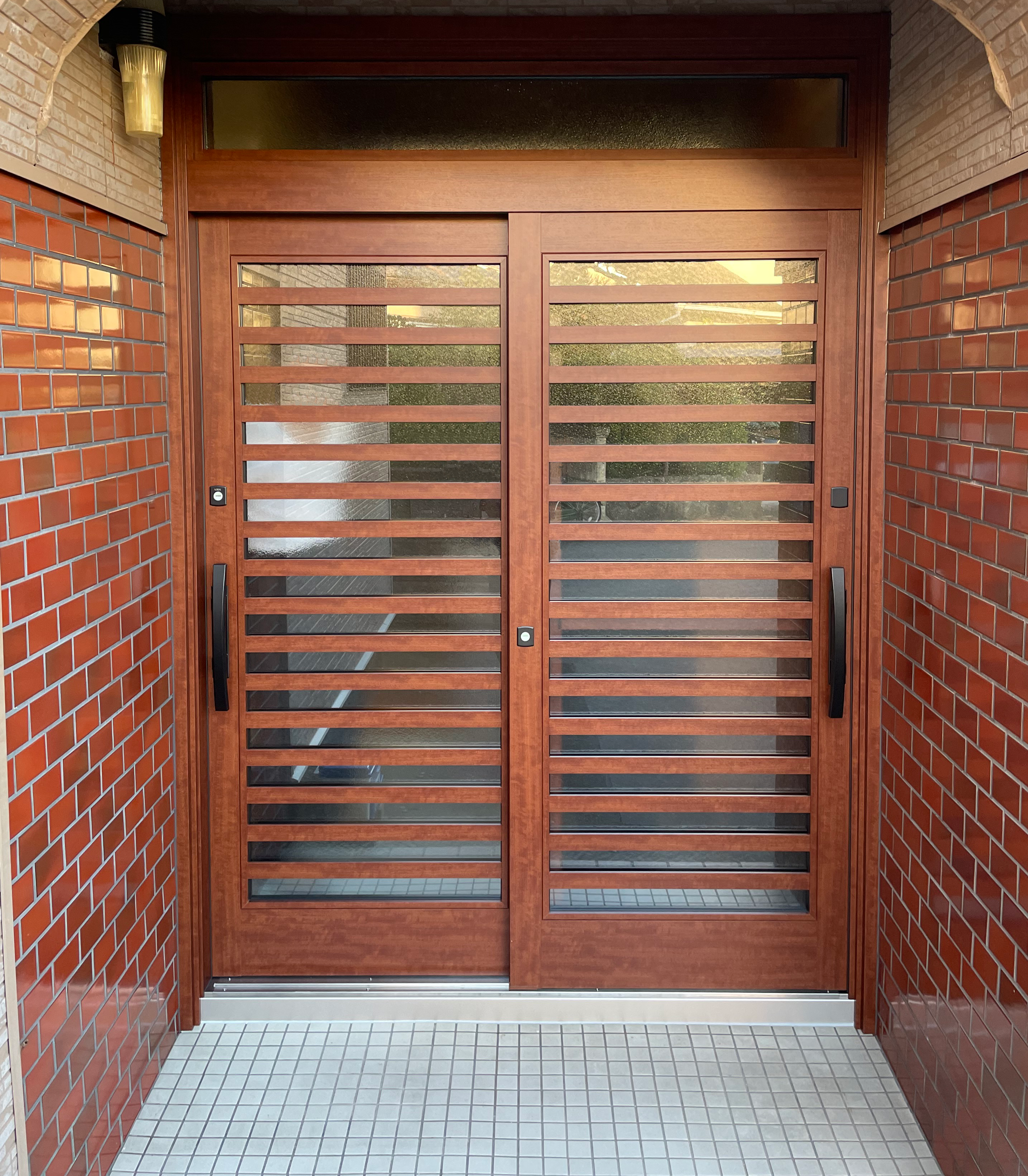 チラシを見てリシェントの玄関扉が気になるんです、とご相談いただいたお施主様。引き戸から引き戸への玄関工事のご依頼をいただきました。 新しく取り付けたリシェントは赤みがかったブラウンでサイドのレンガとの色味が合い、統一感のある玄関に仕上がりました。