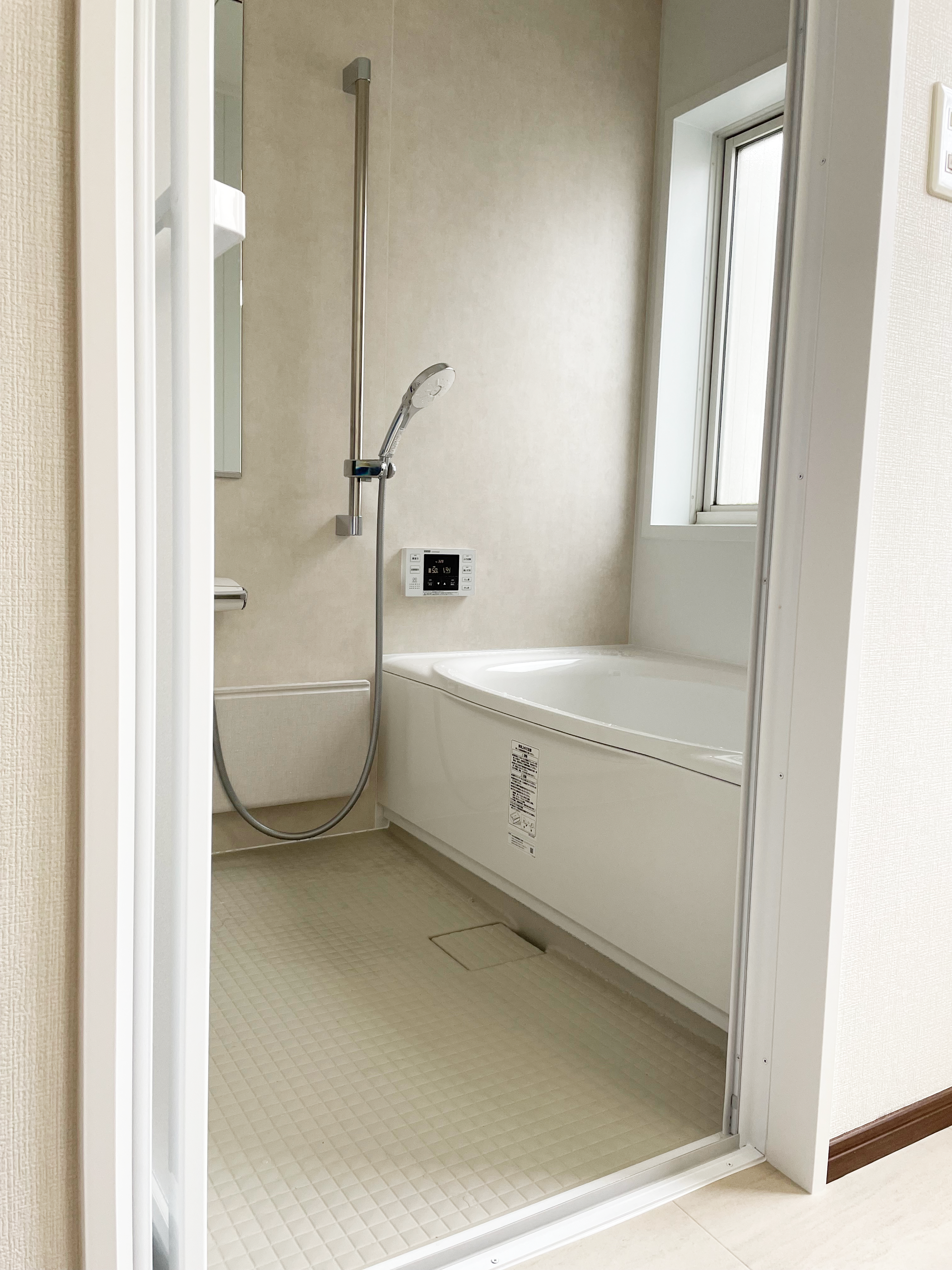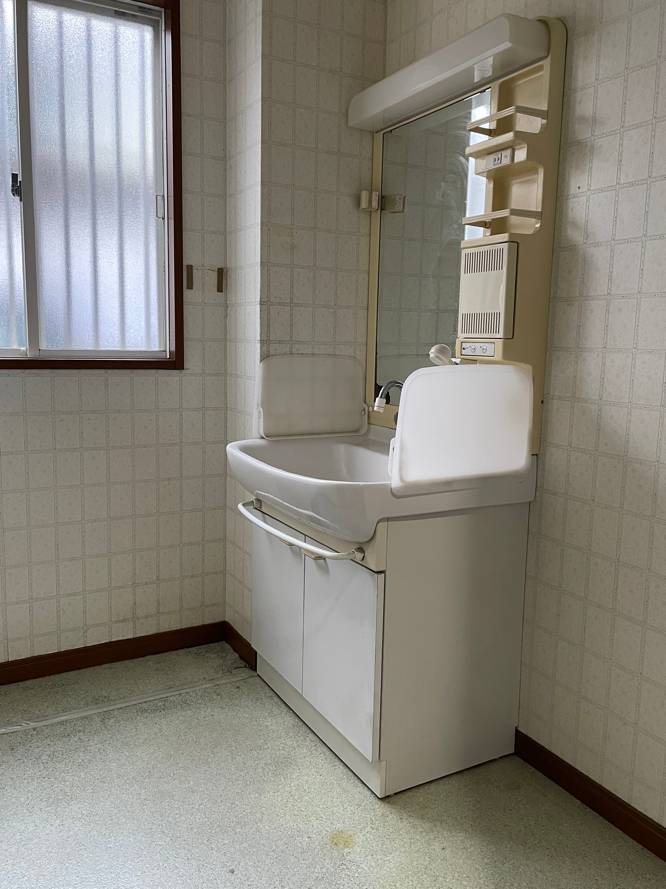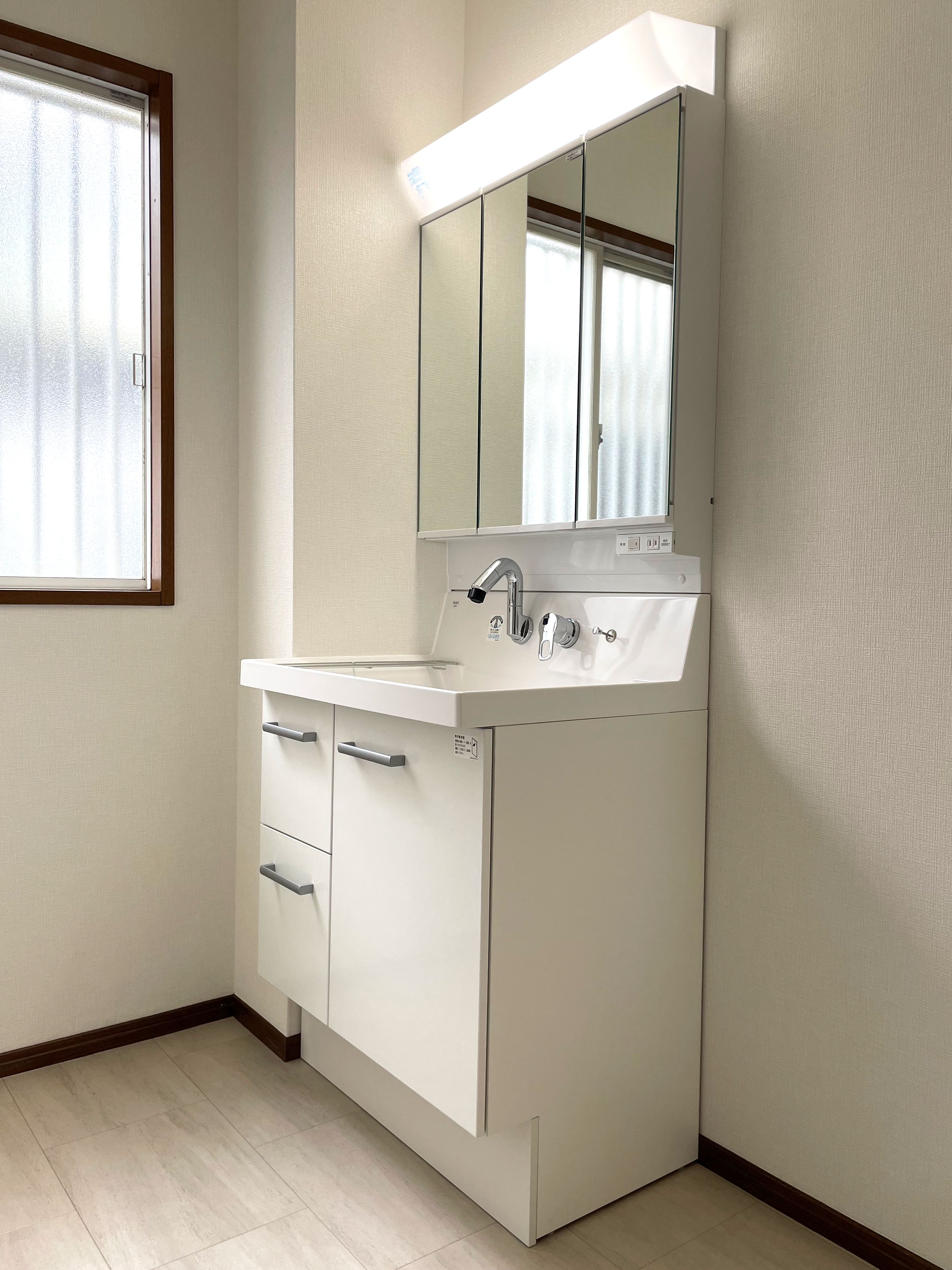 浴室、洗面化粧台の取替工事をご依頼いただきました。 脱衣室の床、壁、天井のクロスを貼り替え全体的に白系統で統一。 明るく清潔感のある空間へと生まれ変わりました。