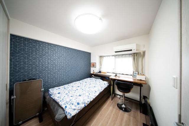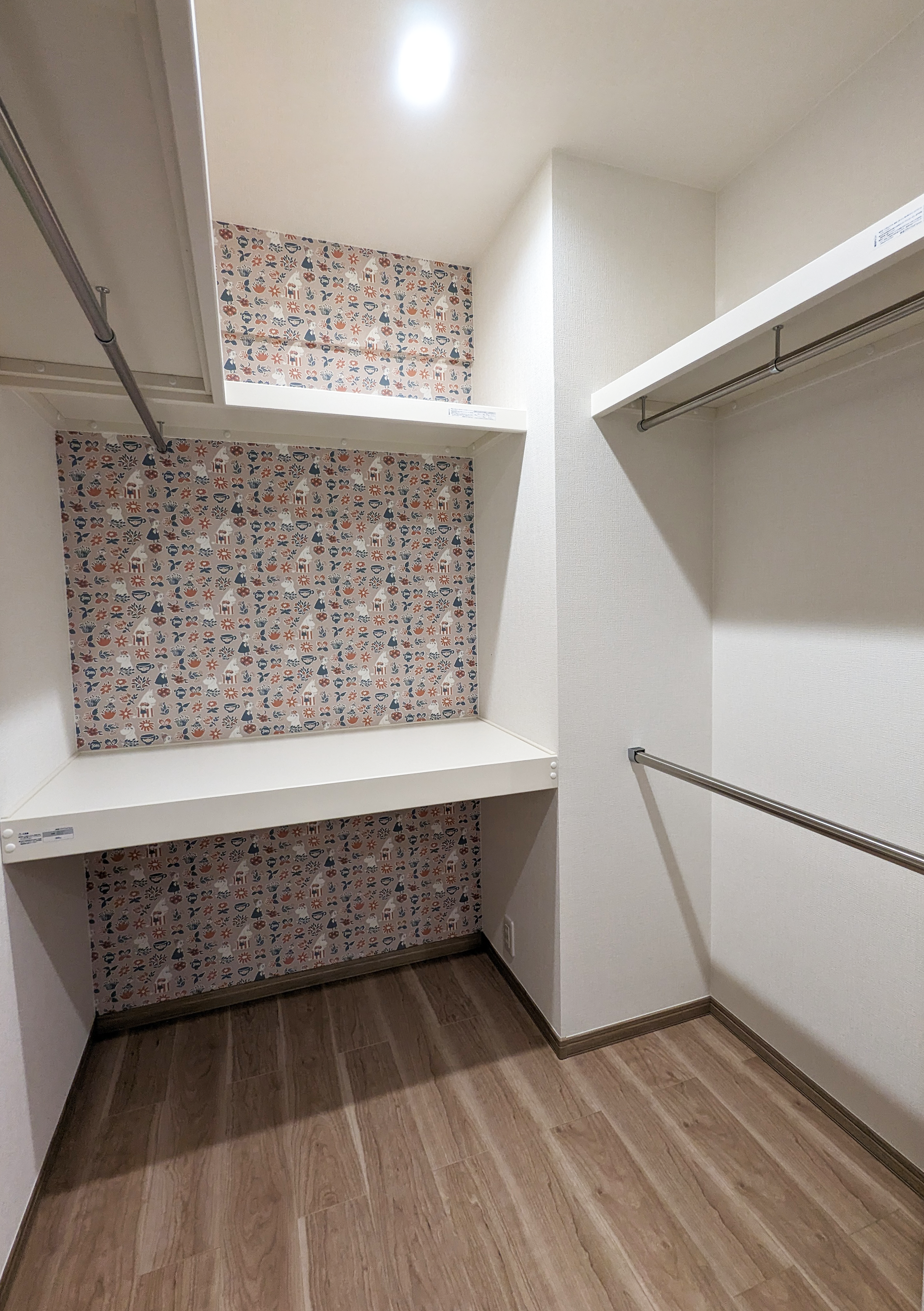 和室の押入れは和室側に拡張しました。廊下と和室から行き来が可能で効率よくお使いいただけます。ムーミンのアクセントクロスがかわいい!