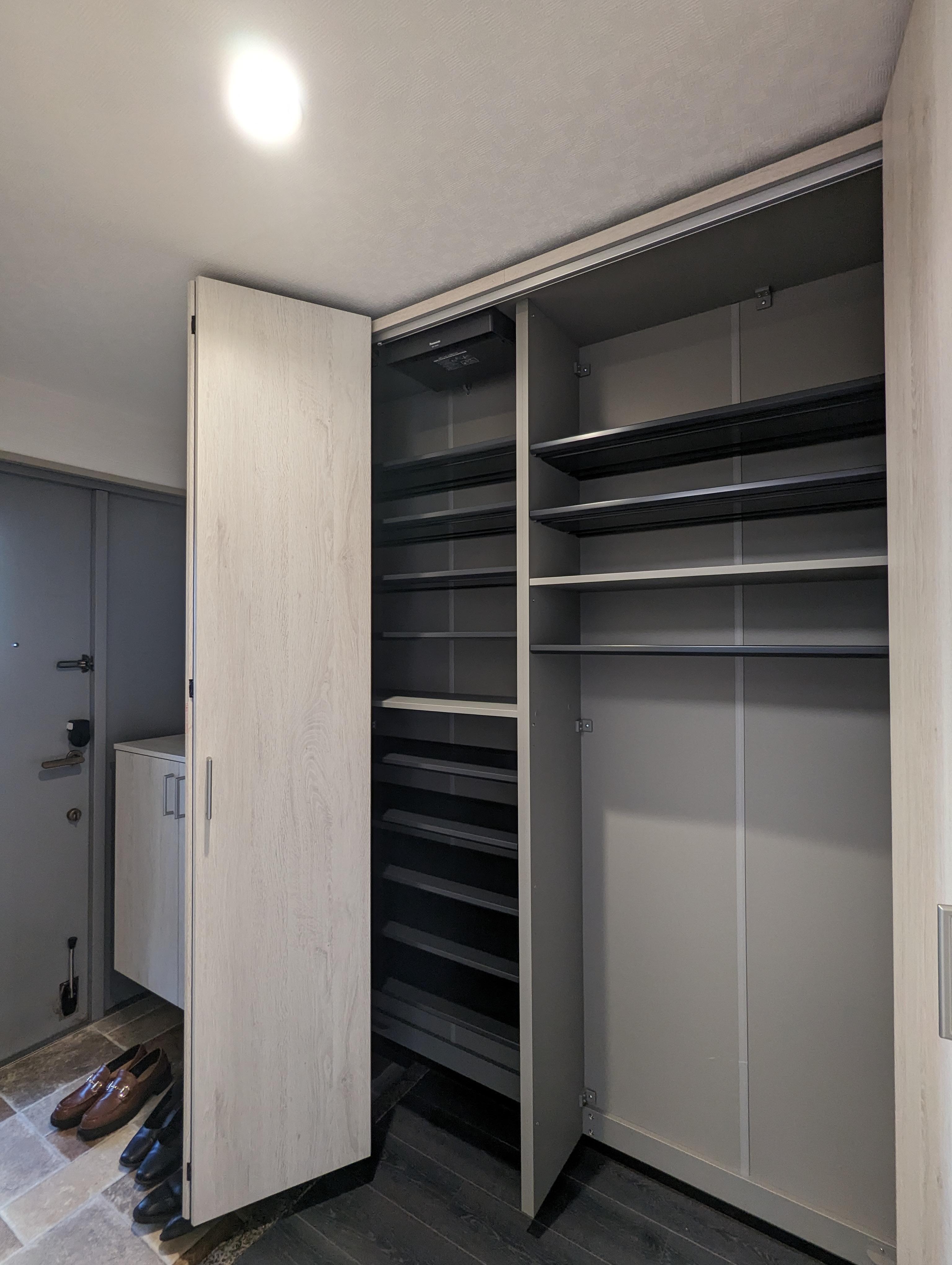 玄関収納を増やすために洋室の壁を動かして収納スペースを確保しました。一番の要望だったゴルフバッグもすっぽりと納めることができました。箱ごとしまい込んでいた靴も全て収納できるように!