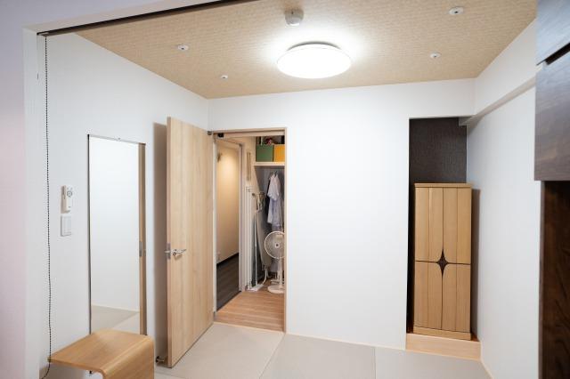 息子さん家族が帰省された際にお孫さんがごろ寝できる十分なスペースを確保。奥様の優しい配慮が伺えます。LDKと和室をの仕切りたい奥様と解放したいご主人様とでご意見が分かれてしまっていました。そこで提案したのはロールカーテン。普段はロールカーテンをしまっておいて開放的に。その際にカーテンが見えないように壁を門型に造作しています。壁掛けの鏡はゴルフが大好きなご主人様が素振りを練習するために取り付けました。姿見としてファッションのチェックにもちょうどいいです!と奥様。仏間もぴったりと納まりました。奥にある扉に続くのはWCL(ウォークインクローゼット)です。