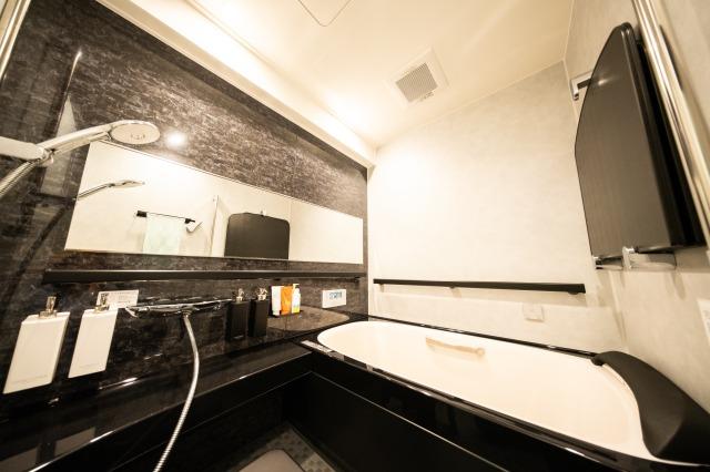 ご主人様がお気に入りのスパージュ。アクアフィールが快適とお喜びいただけました。パネルと浴槽のブラックがシックでおとなっぽく空間に締まりが生まれます。