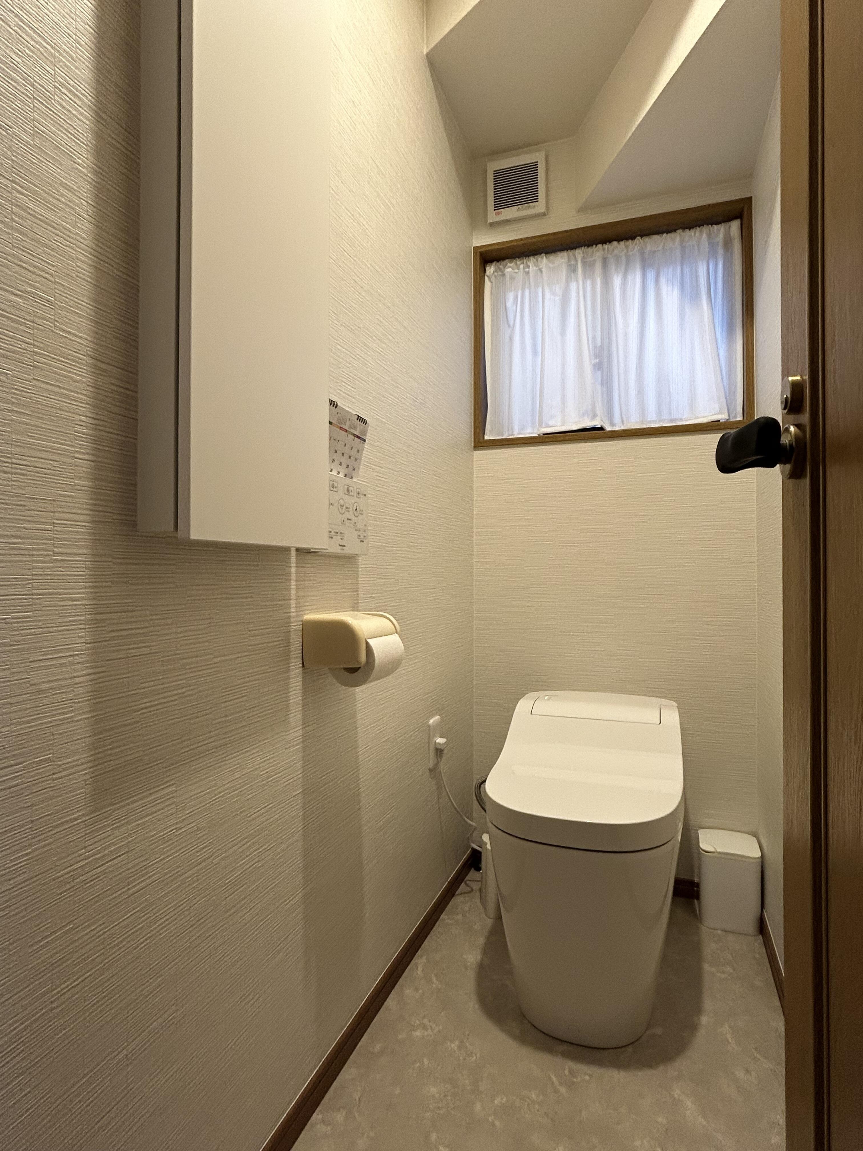 階段下にあるトイレは、限られたスペースということもあり手洗いは無しのスッキリタンクレスへ。ペーパーホルダーは既存をそのまま活用しました。トイレ:Panasonic アラウーノ収納:LIXIL 壁埋込タイプTSF-207