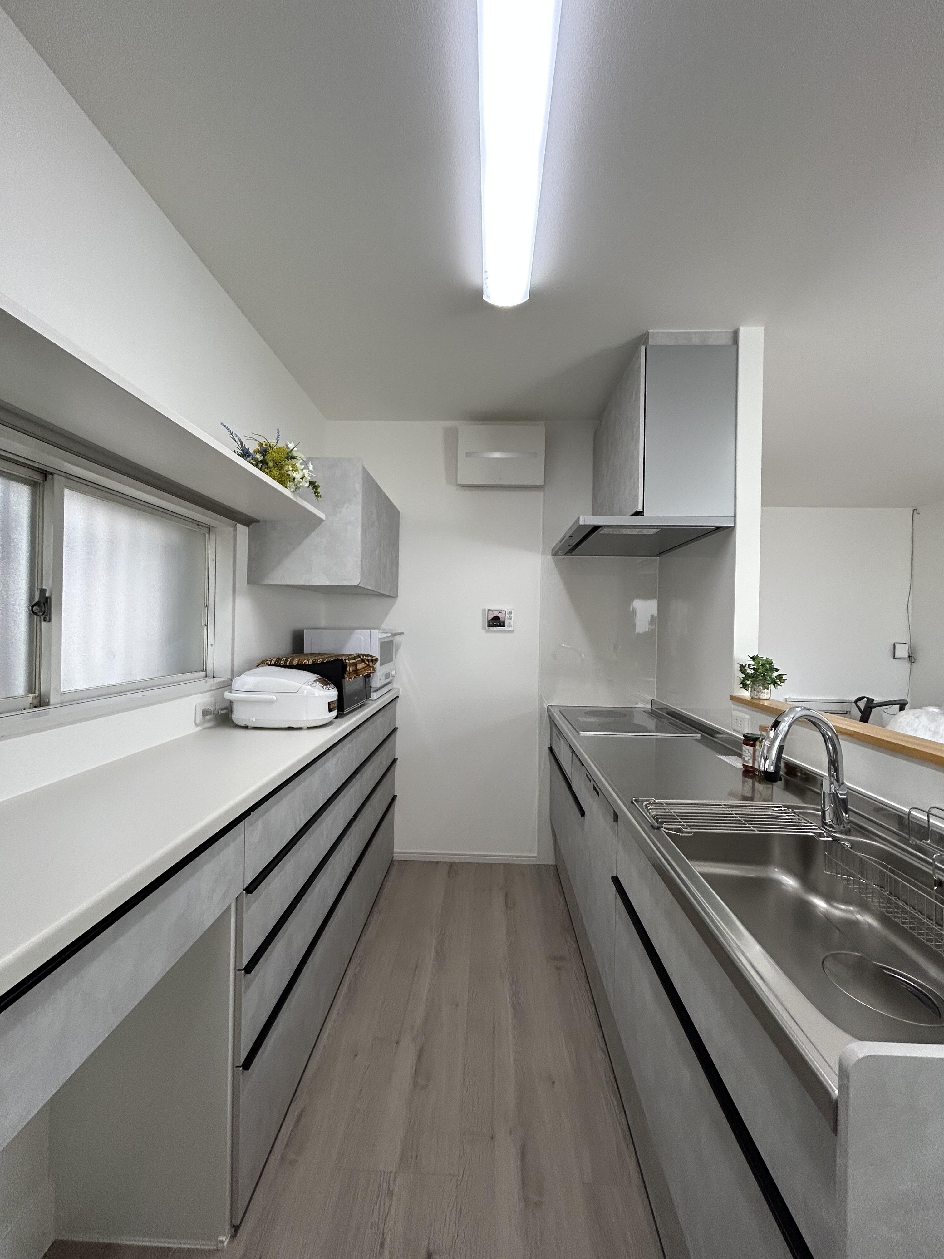 しかし、「対面キッチンにしたい」とのご要望を受け、リビング・ダイニングを広々と見渡せるレイアウトに変更。構造上抜けない壁があるなど、限られた空間の中で工夫を凝らし、こだわりのキッチンが完成しました。