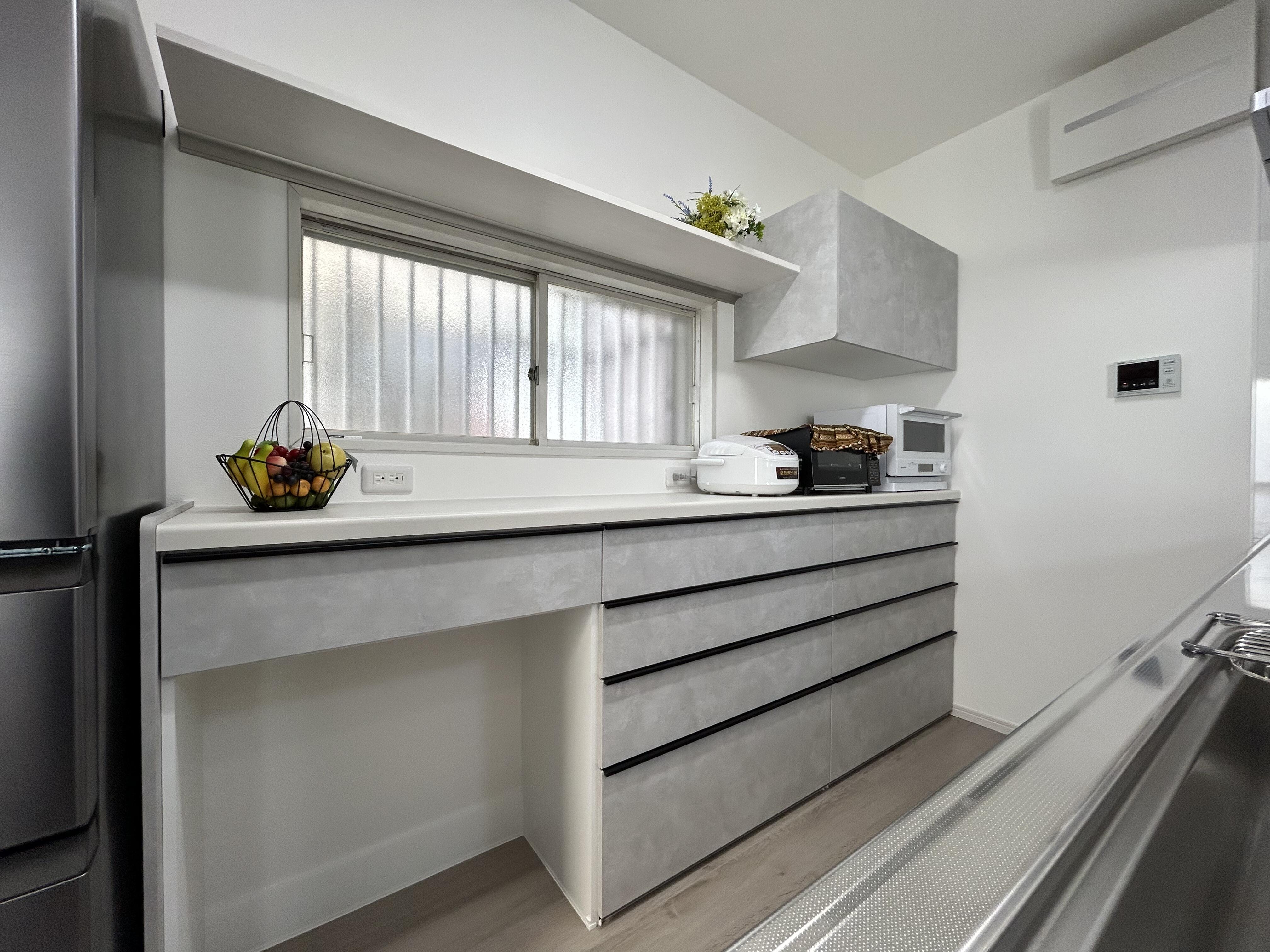 以前に他の水まわりをリフォームされたお施主様から、「次はそろそろキッチンも…」とご相談をいただきました。もともとは壁付けのキッチンで、当初はそのまま位置を少しずらして、収納も現状位置のままで交換するプランをご提案していました。