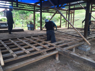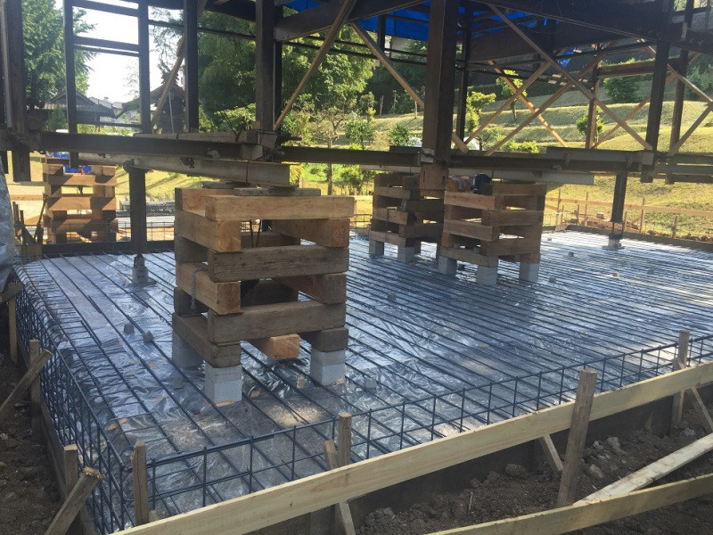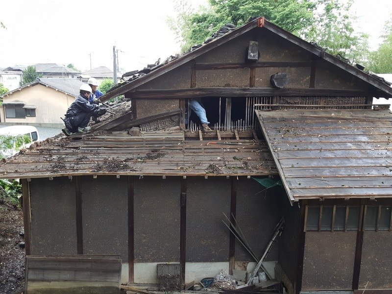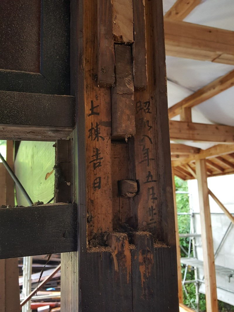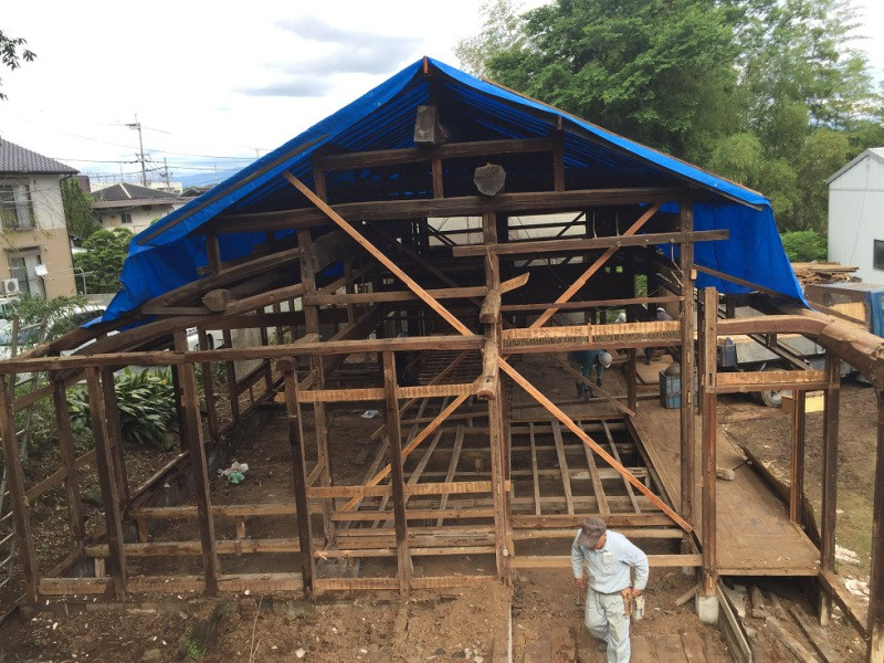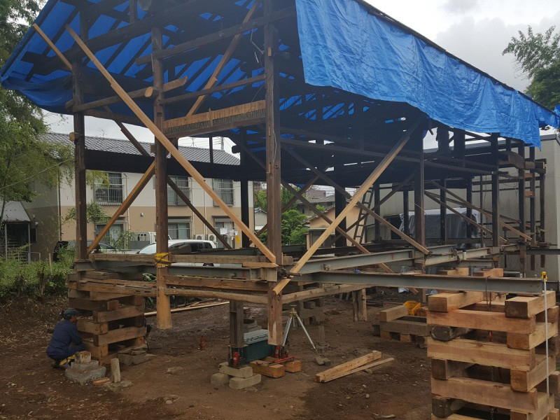 瓦を外し、壁を落とし、床天井を剥いでスケルトンにします。仮筋交いで建物を固めて、次に行うのは何だと思いますか? 軽くなった建物を、上げるわけです。 GLから、約1.5Mくらいまで持ち上げます。既存のブロック、土台石等をきれいに撤去して新築同様の鉄筋コンクリートのベタ基礎を作ります。 そして、それに乗せるわけです。 「手刻みリノベーション」古材と新材の融合~宮大工に始まり創業100年の歴史と、100年の匠の技。