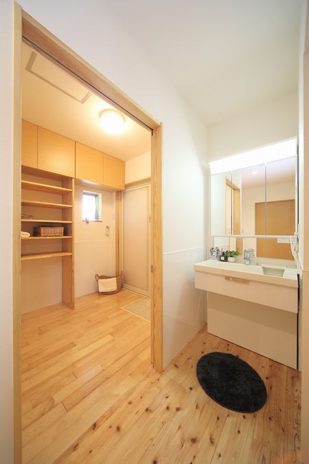 脱衣所の収納棚天袋。洗面台が別にあるので、来客がある時にはドアを閉め目隠しに成ります。