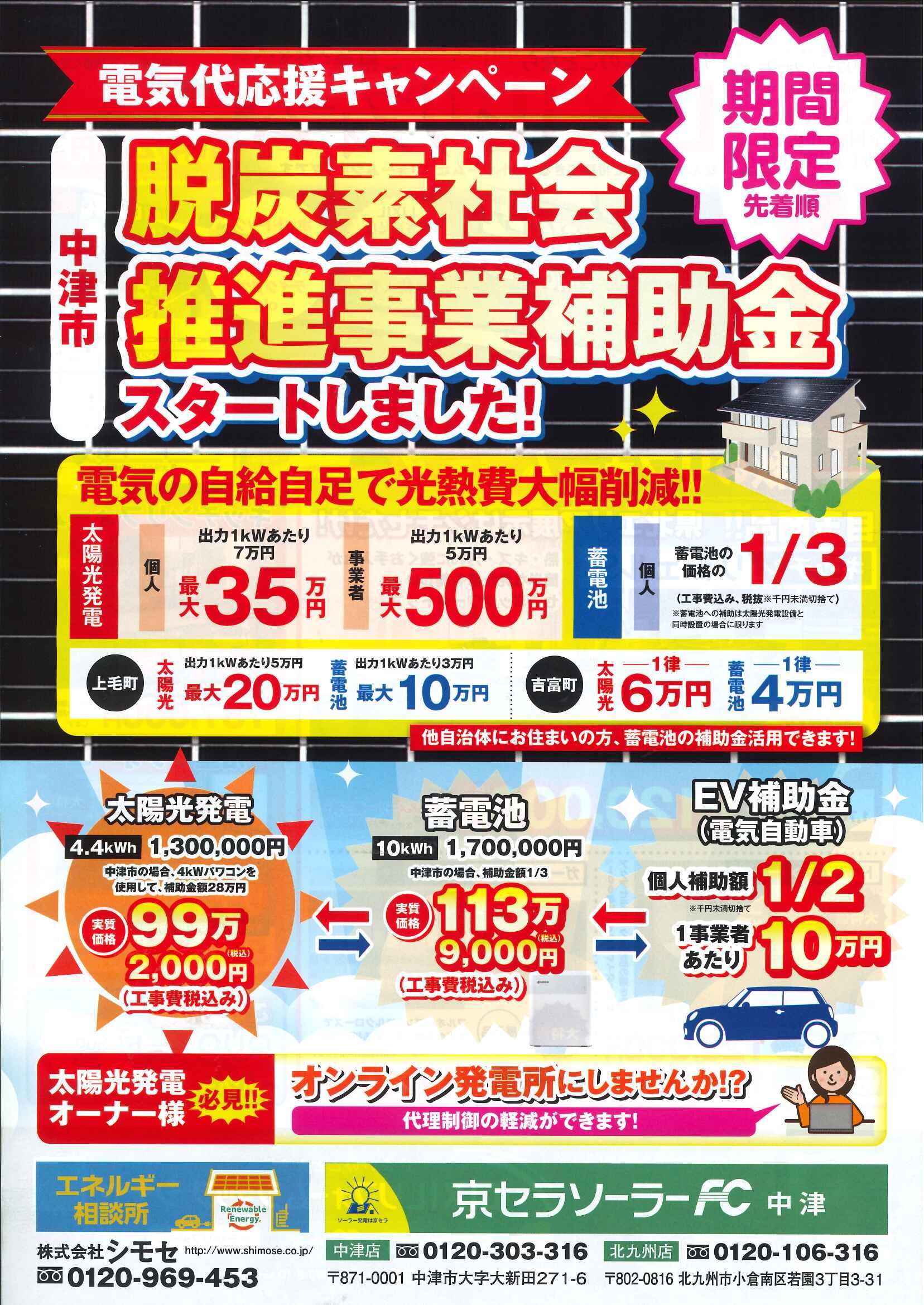 中津市の「脱炭素社会推進事業補助金」が始まりました。