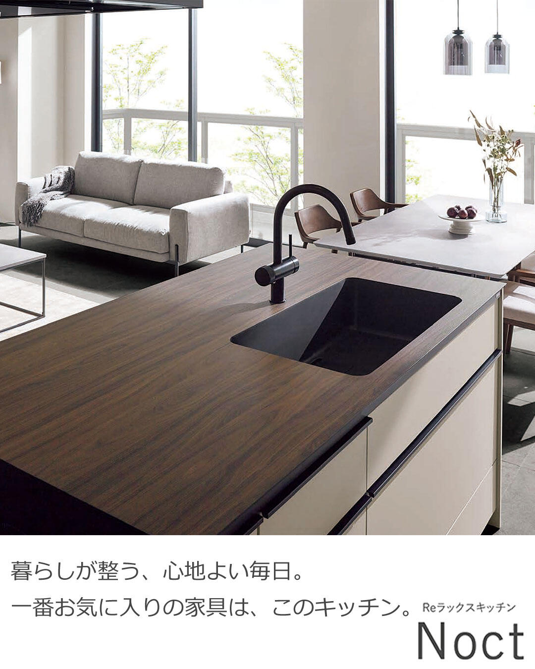 ノクトは、デザイン性と機能性を両立したシステムキッチンで、インテリアに調和する美しいワークトップや、日々の家事負担を軽減する使いやすい設計が特長です。
