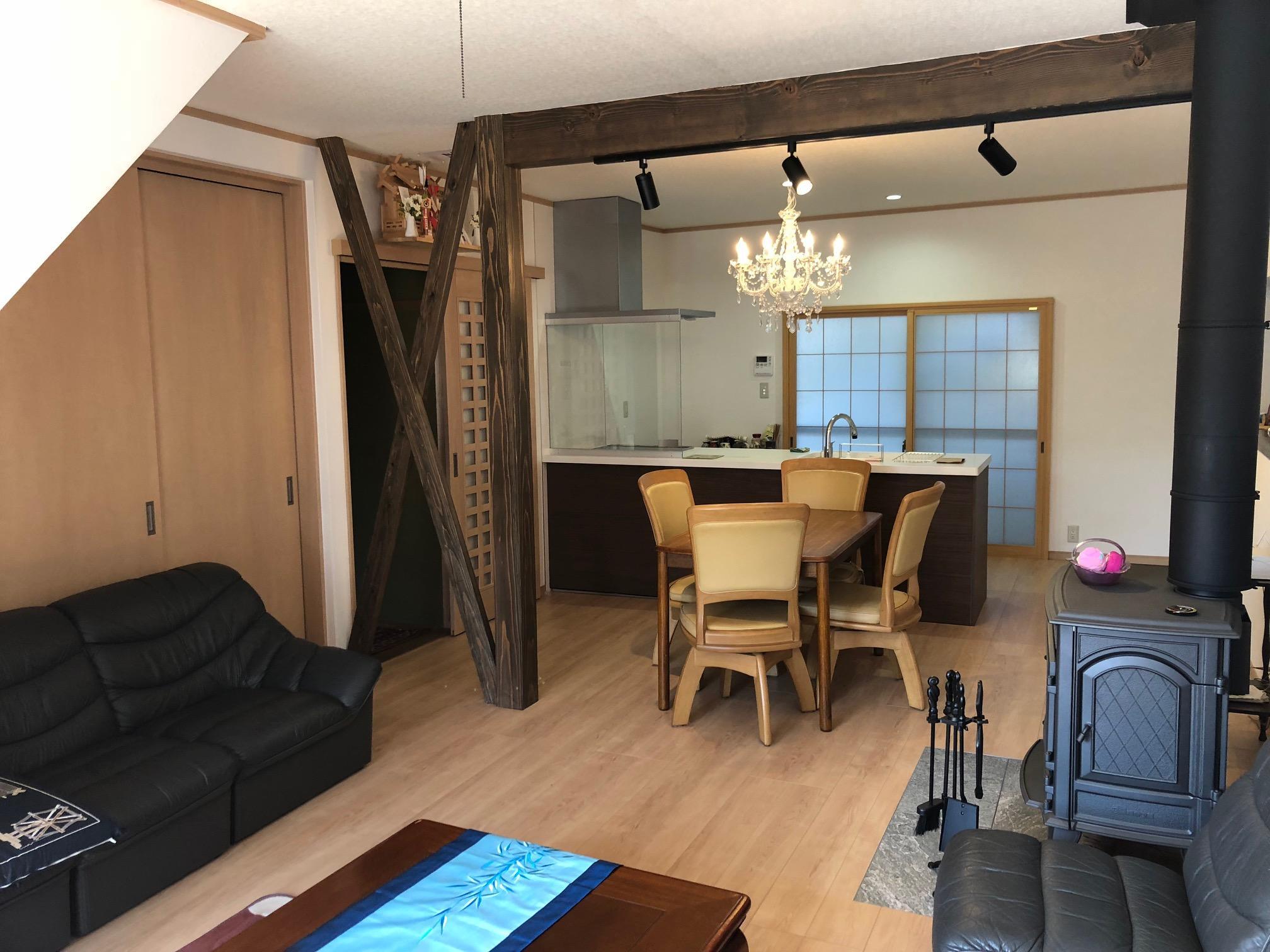リビングとキッチンをつなげ開放感のある空間に。梁を見せることによりモダンな雰囲気を。 薪ストーブで冬も暖かい癒しの空間を演出。
