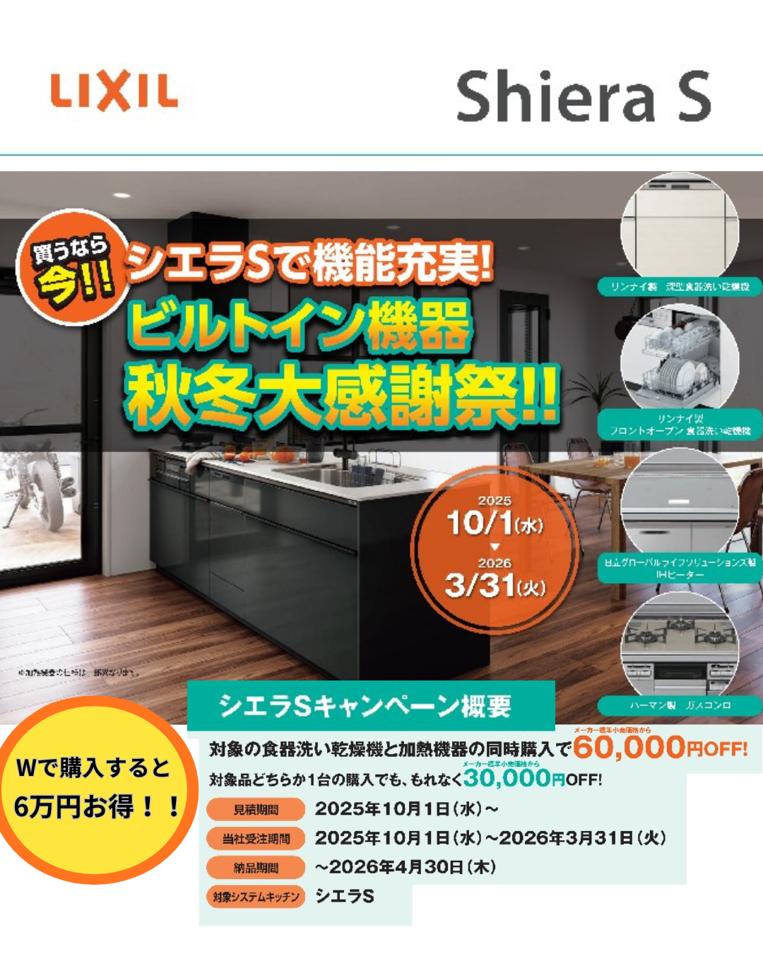期間中に、対象の食器洗い乾燥機と加熱機器(IHヒーターまたはガスコンロ)を同時購入された方に、メーカー標準小売価格から 最大60,000円OFF となる特別割引を実施しています。