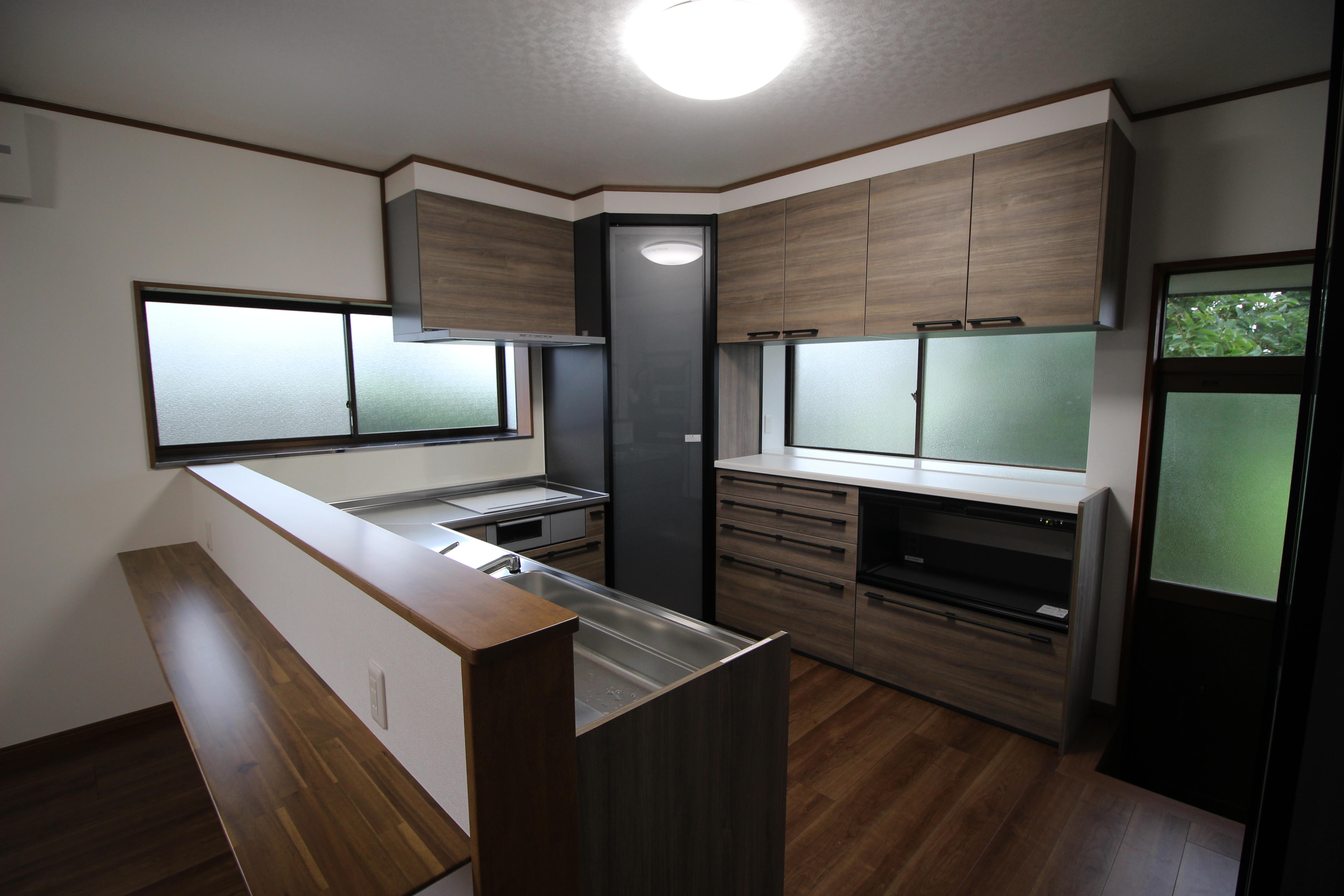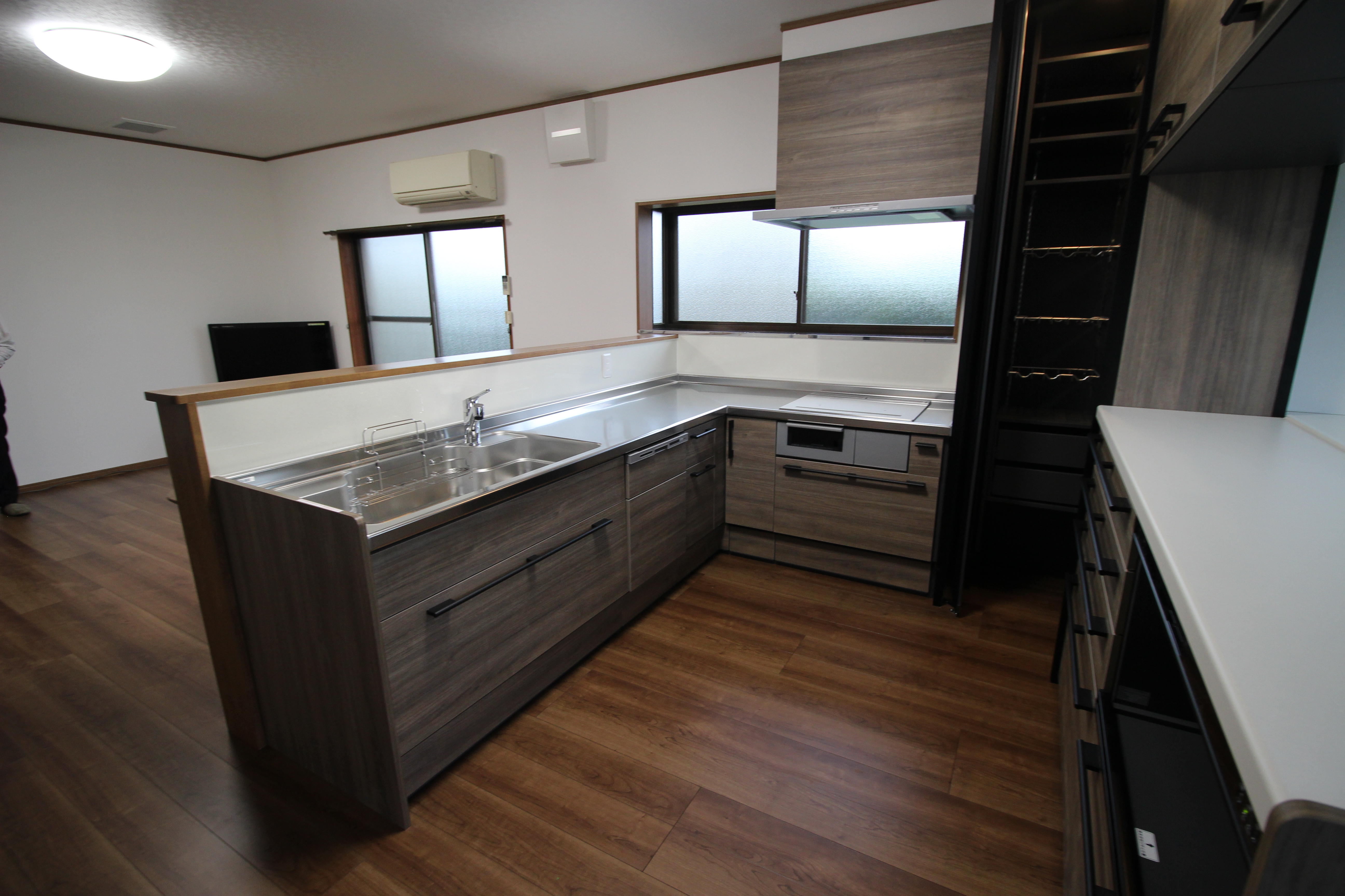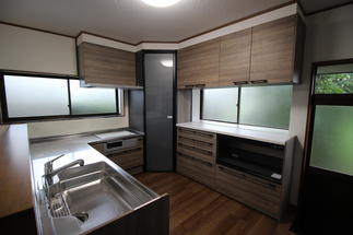 既設のキッチンが、コの字型で収納量が多かったため、リフォーム後も、同じコの字型で収納量も維持しました。ポイントは、奥行きがたっぷり収納できる「コーナー収納」です。