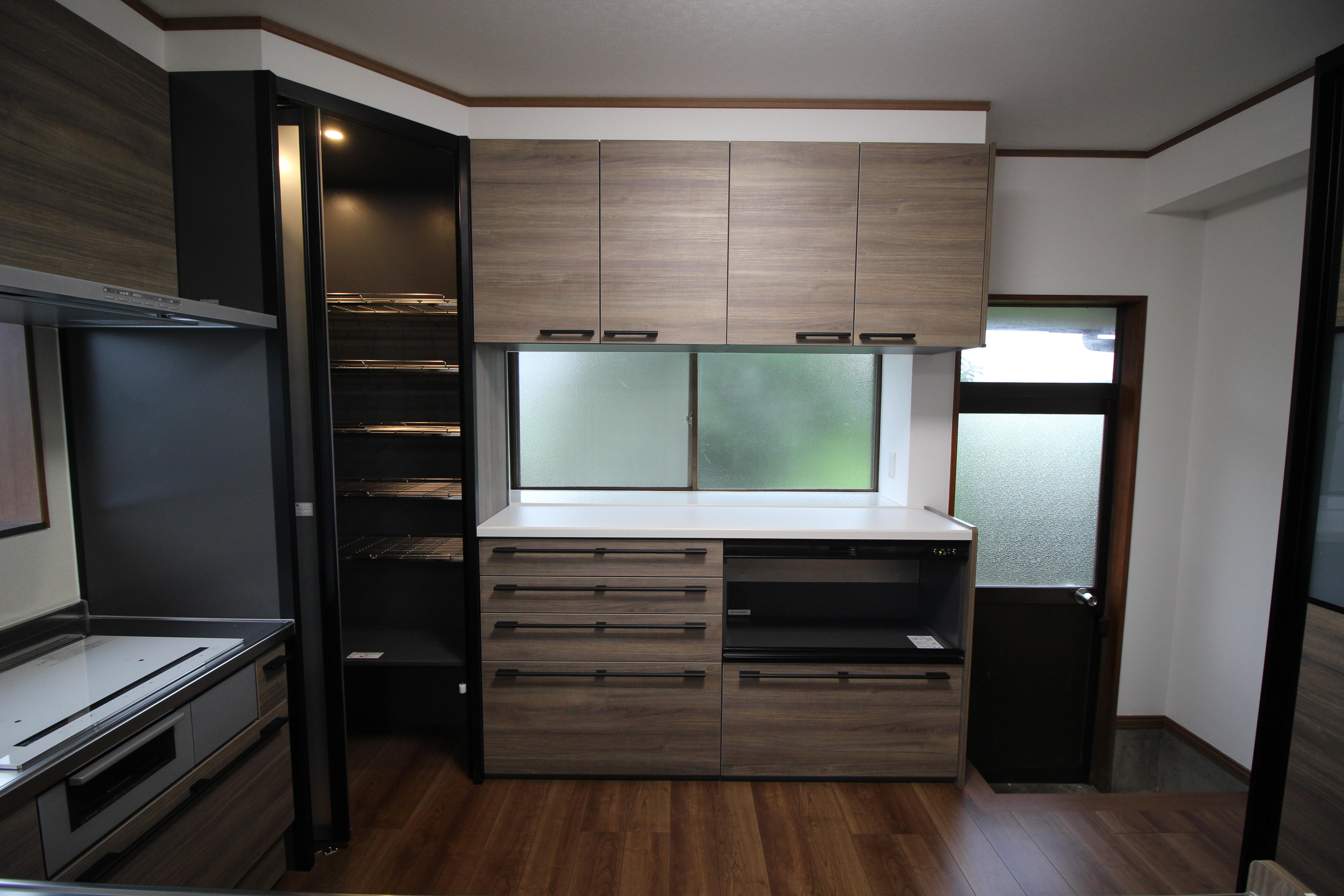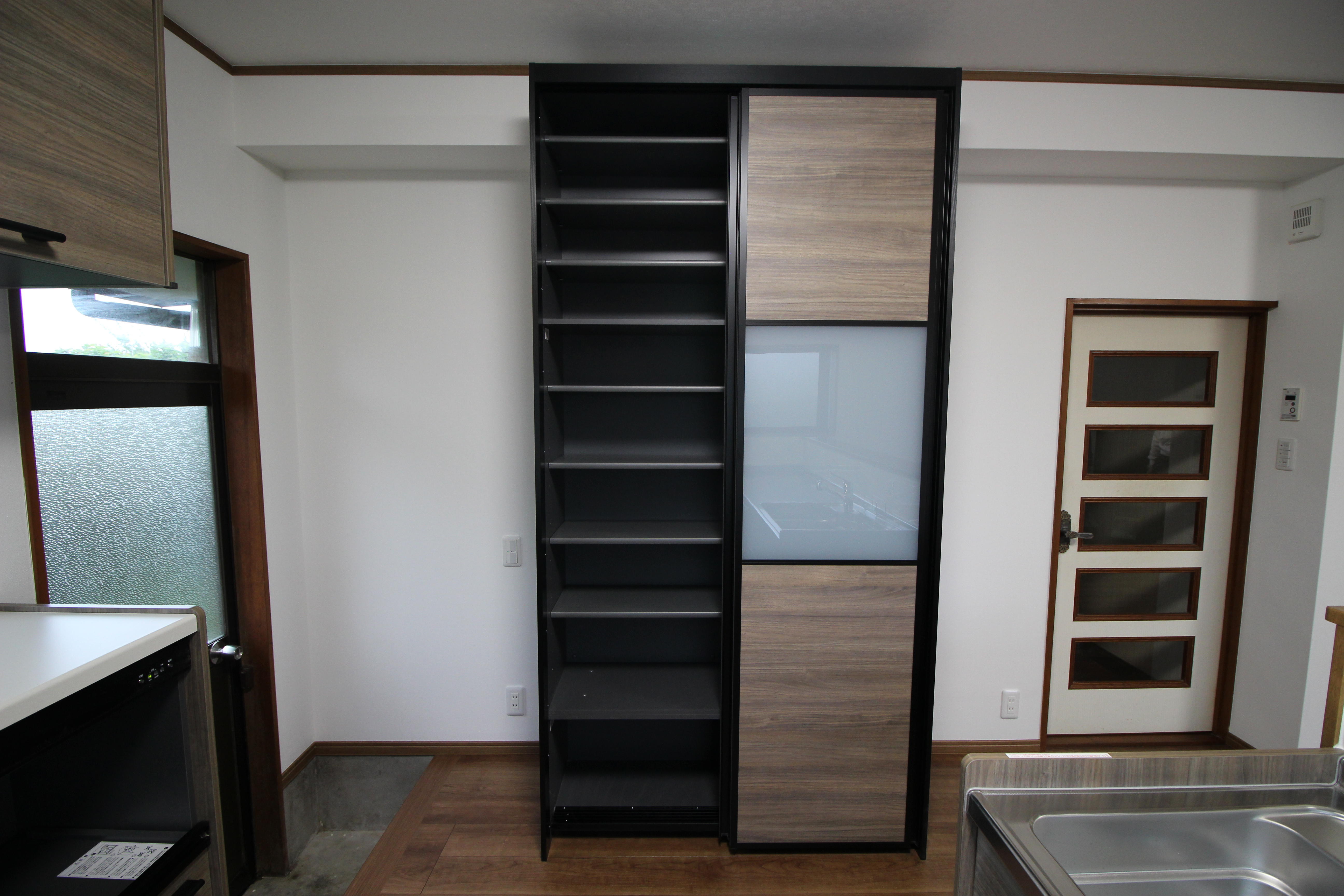 キッチンの側面に、カップボードを設置しました。高さがあるので、よく使うものは正面に、普段あまり使わないものは上の方にと、使い分けて収納することができます。