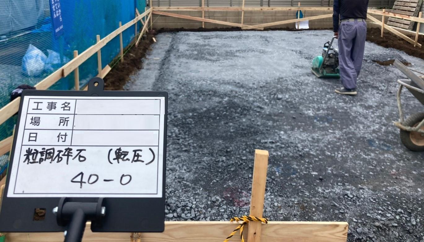 砕石転圧後、防蟻材を散布し、