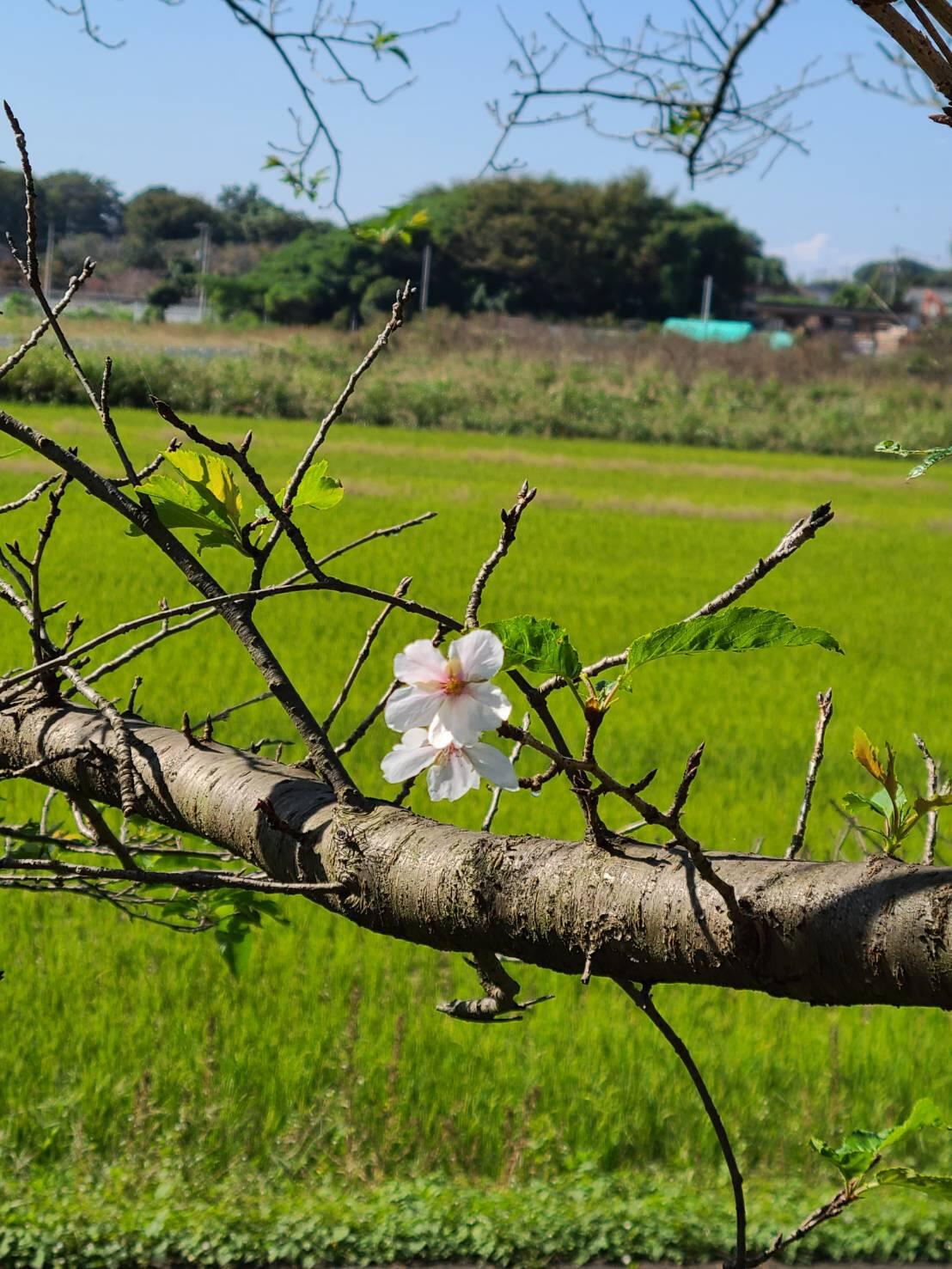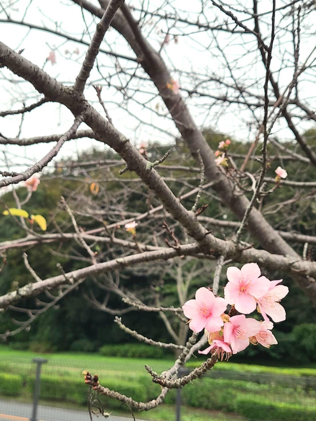 少し黄色くなりかけた銀杏と桜(河津桜)が