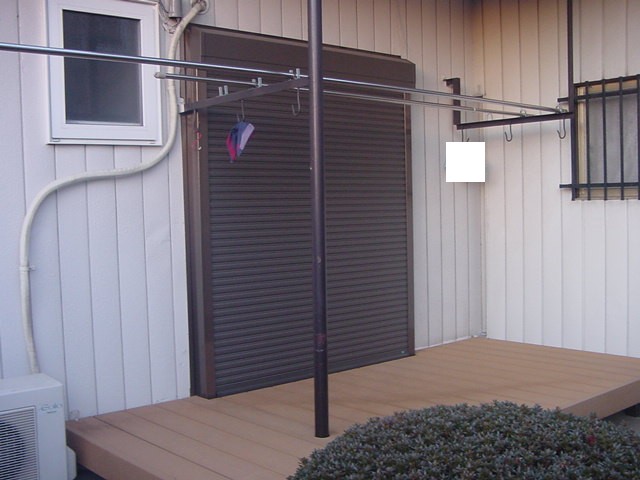 「既存雨戸がスムースに動かなくなり、開け閉めに毎日不便な思いをしてた」とうかがい、既存雨戸を撤去し壁付けシャッターを取り付けました。半日程度で施工完了です。壁付けシャッターは、外壁を改修する事なく取付出来る優れものです。 デッキはトステムのリコステージ!リサイクル樹脂製で、長寿命のエコ材料です。