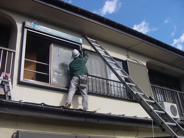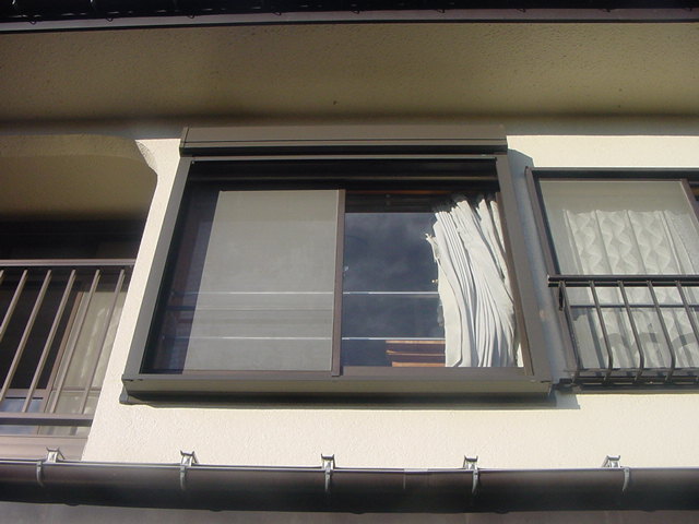 「最近は物騒で、雨戸がない窓は心配。何か簡単に防犯出来ないかしら・・・」との声に、窓上部にシャッターを取り付けました。両側に雨戸が収まるスペースがない為、窓がむき出し状態。当時シャッターは主流ではなく、2階の窓という事もあり何も付けなかったのでしょう。見た目もすっきりで、防犯性能を上げることができました。