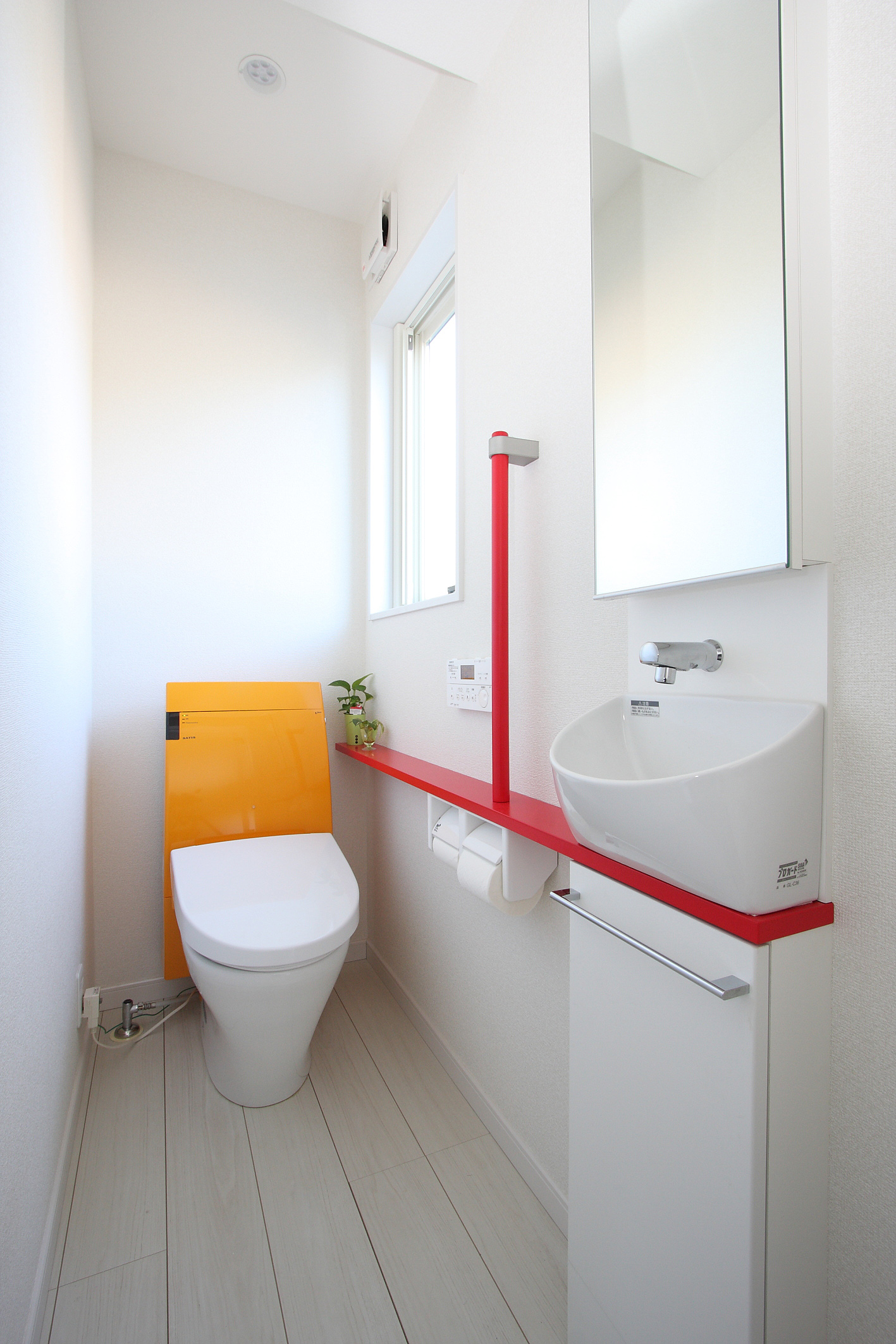 トイレ空間も清潔感のある白を基調に、ポイントポイントカラーが光る一部屋。