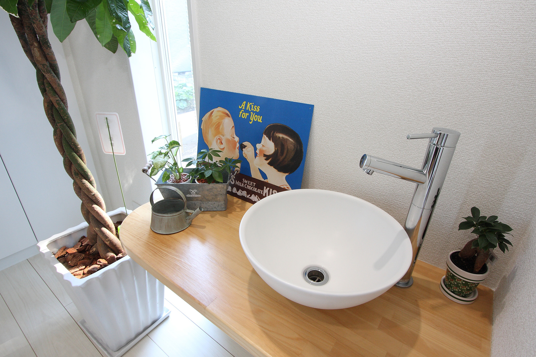 ホールにある手洗いコーナー。空間のアクセントになるだけでなく、外出から帰ってきたらすぐ手が洗えて、とても実用的です。