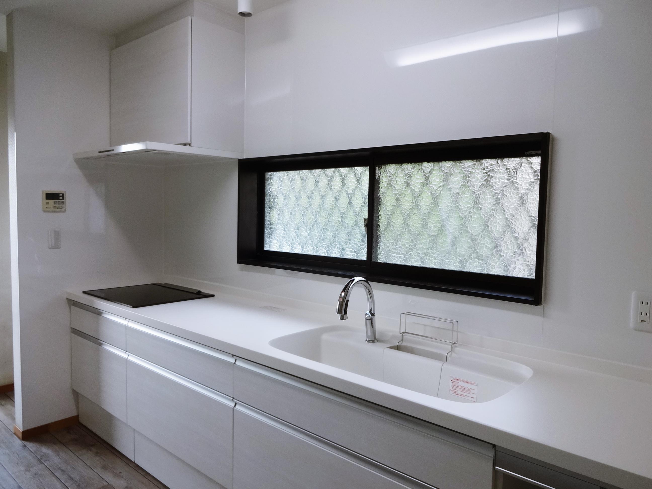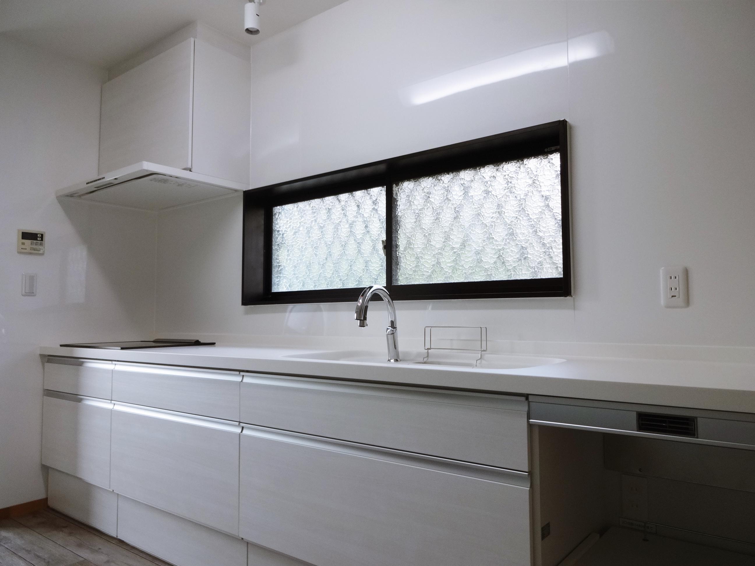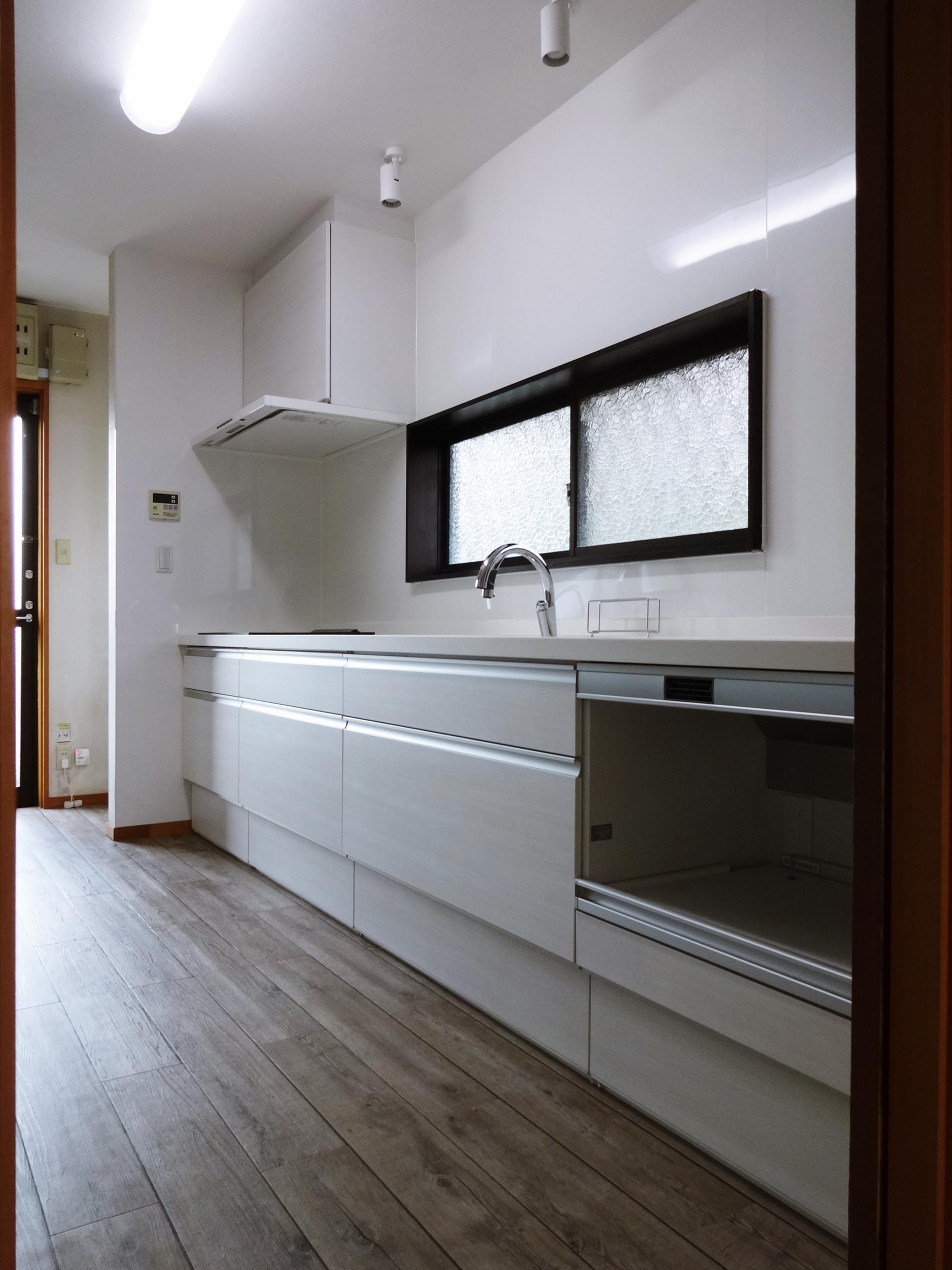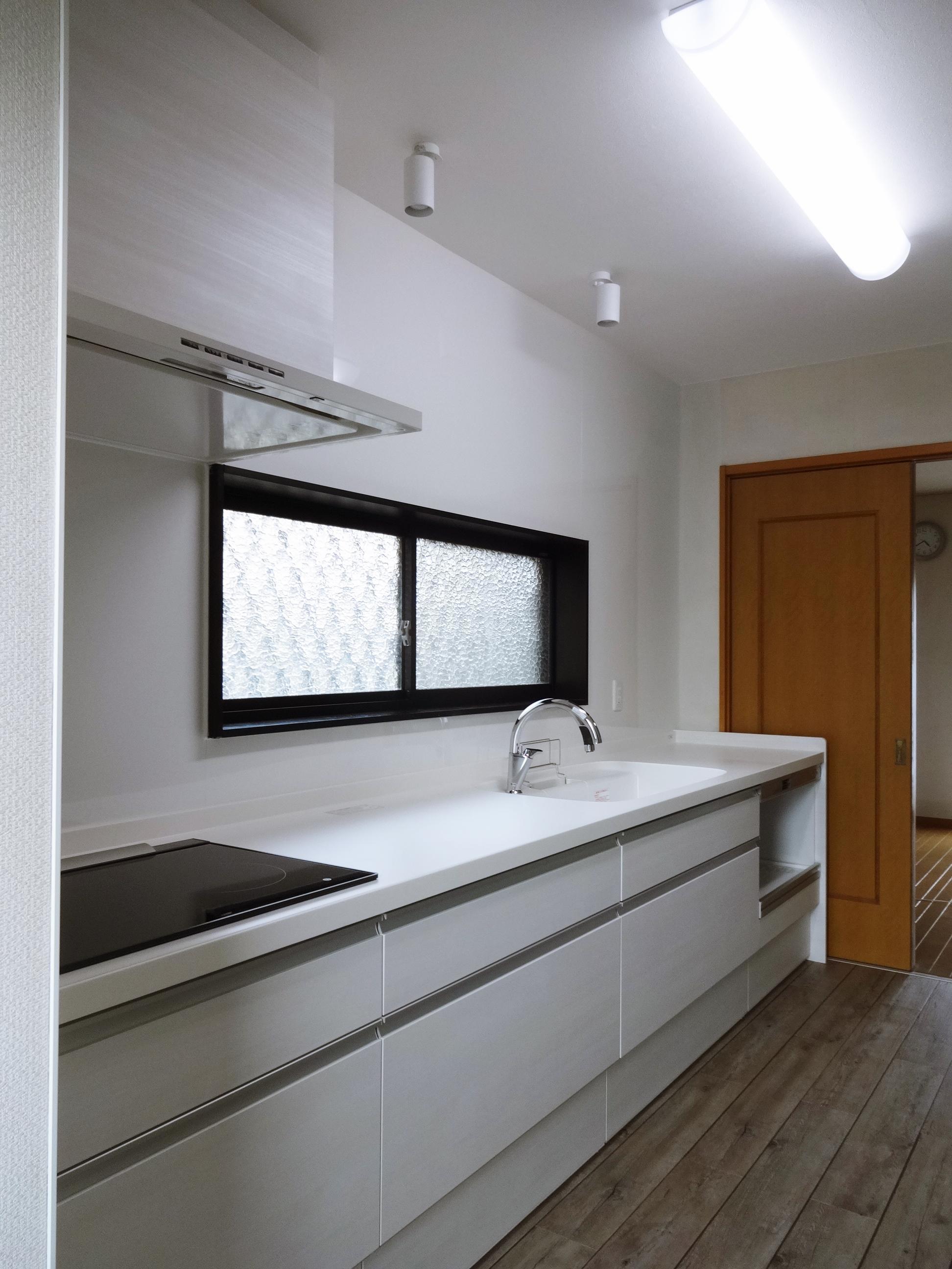 白でまとめた気持ちのいいキッチン空間です。今まではキッチンの隣に家電用の棚を置かれていましたが、今回はキッチンの一部に家電収納スペースを組み込み、カウンターは一体型で広々お使い頂けるようになりました。キッチンの下側の収納だけでたっぷり入りますので、吊戸をなくしスッキリとした印象になりました。