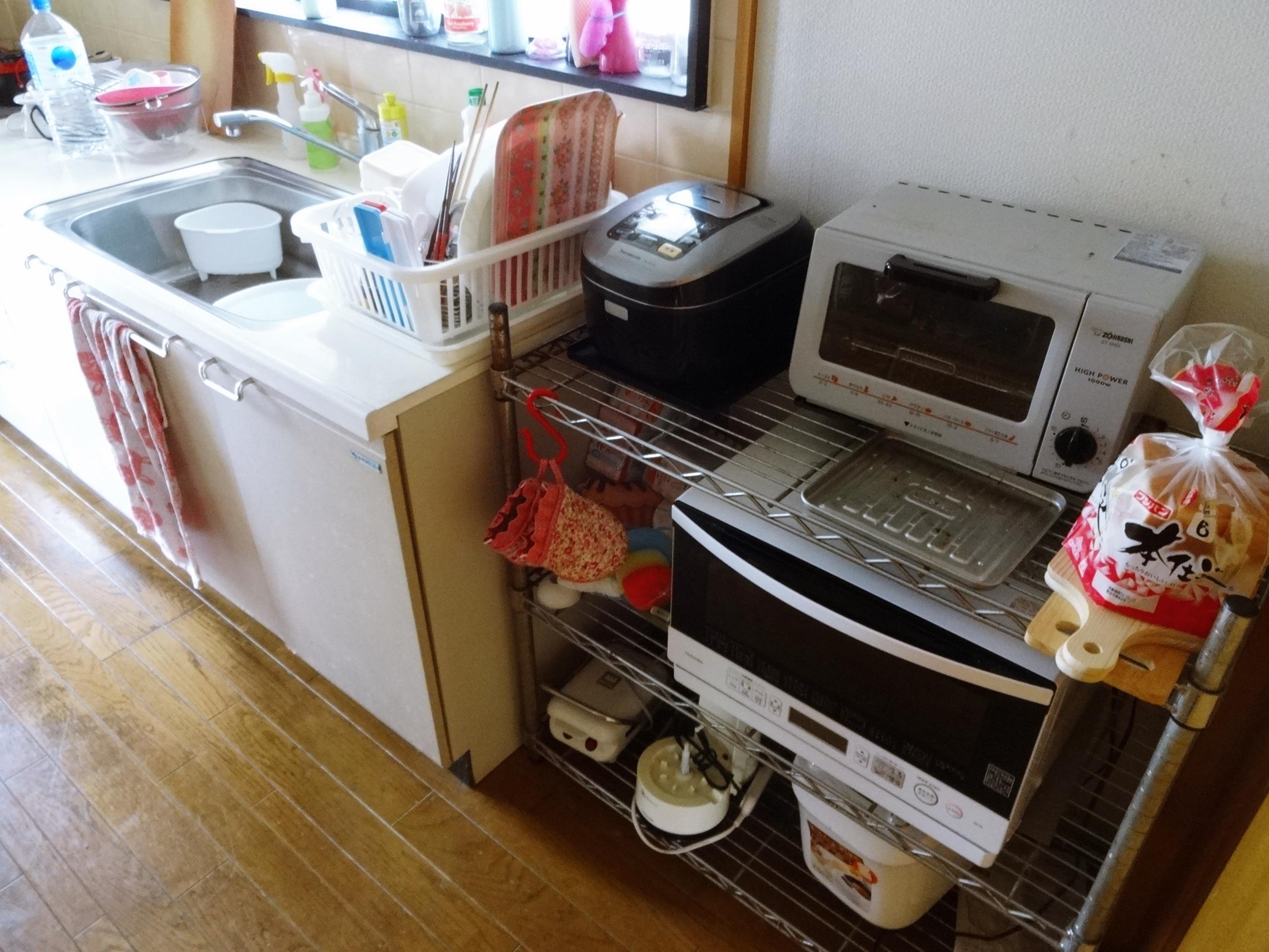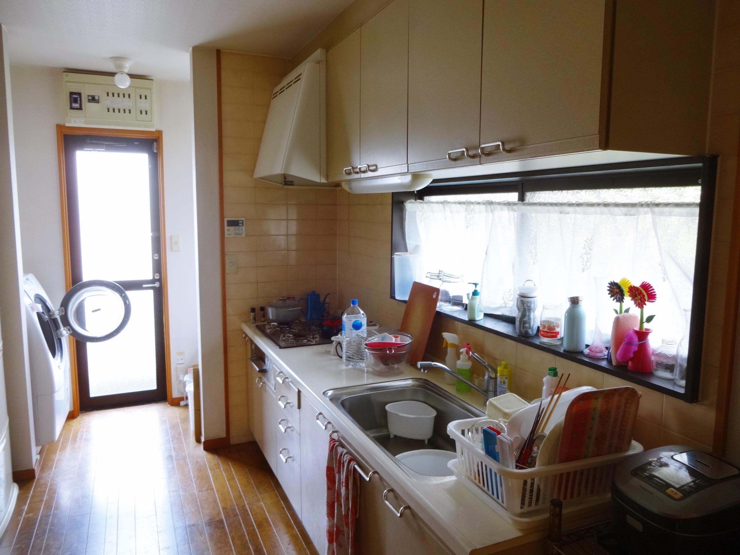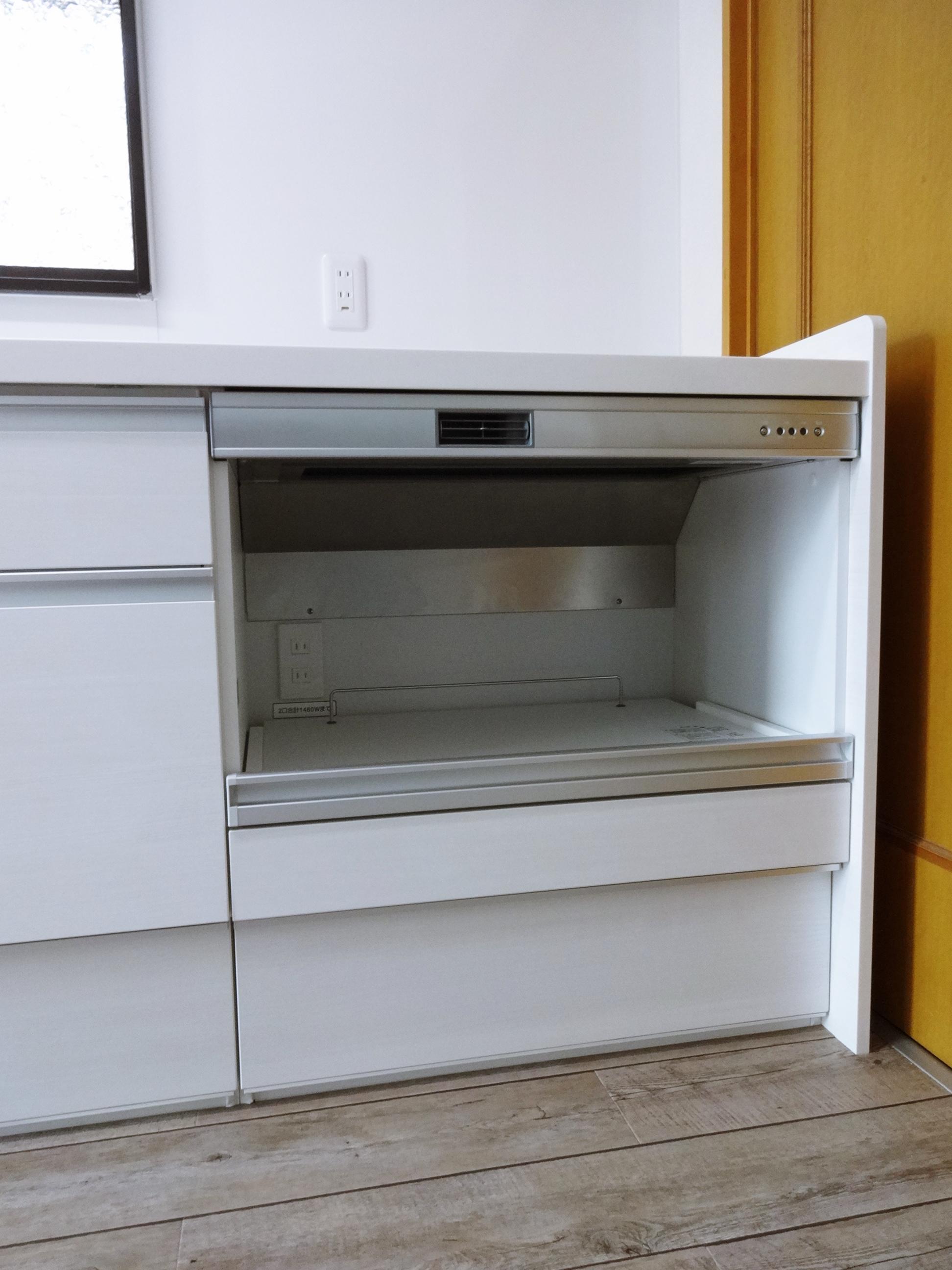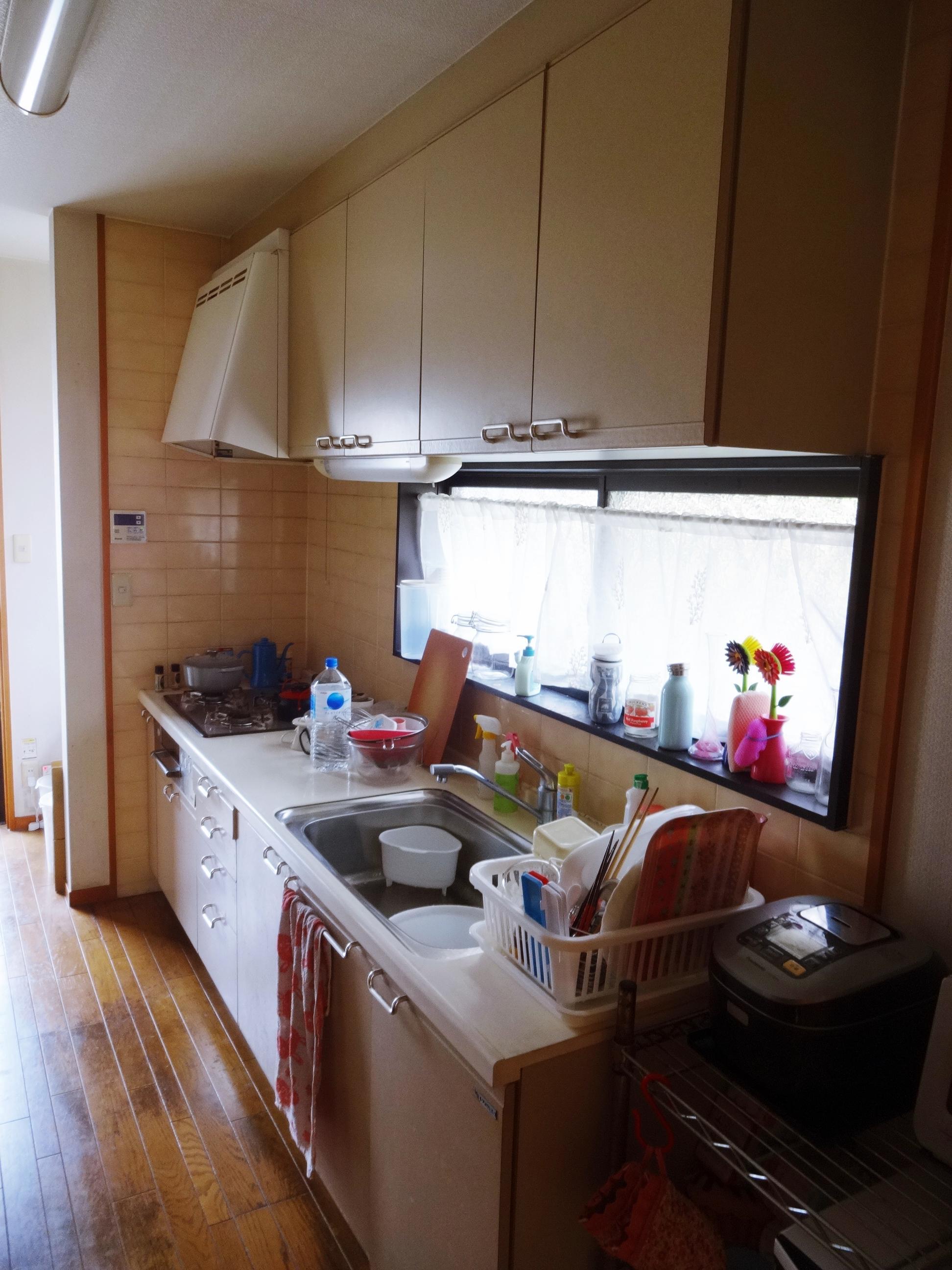 白でまとめた気持ちのいいキッチン空間です。今まではキッチンの隣に家電用の棚を置かれていましたが、今回はキッチンの一部に家電収納スペースを組み込み、カウンターは一体型で広々お使い頂けるようになりました。キッチンの下側の収納だけでたっぷり入りますので、吊戸をなくしスッキリとした印象になりました。