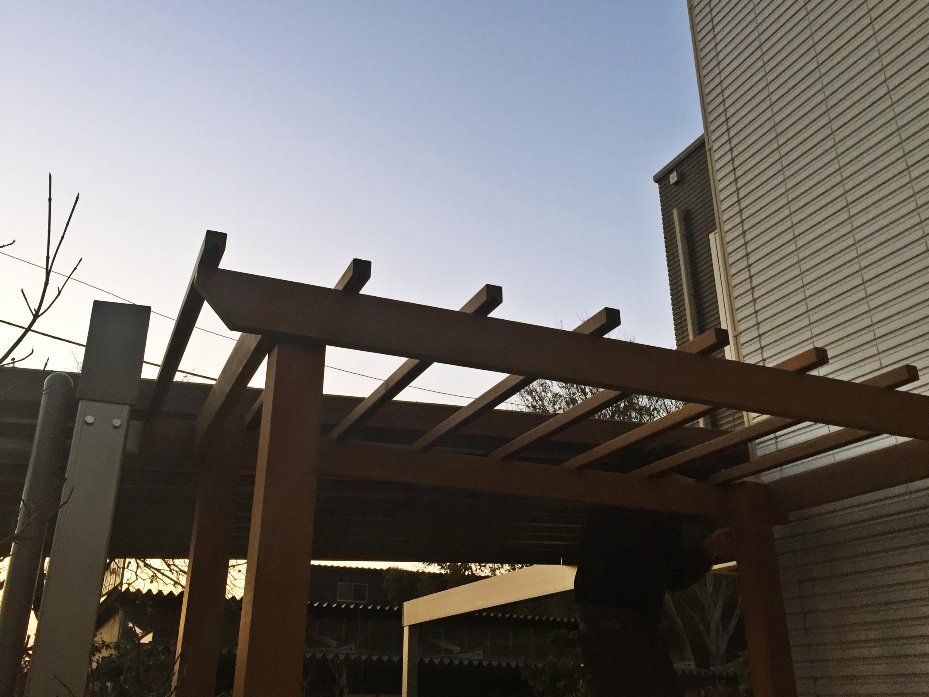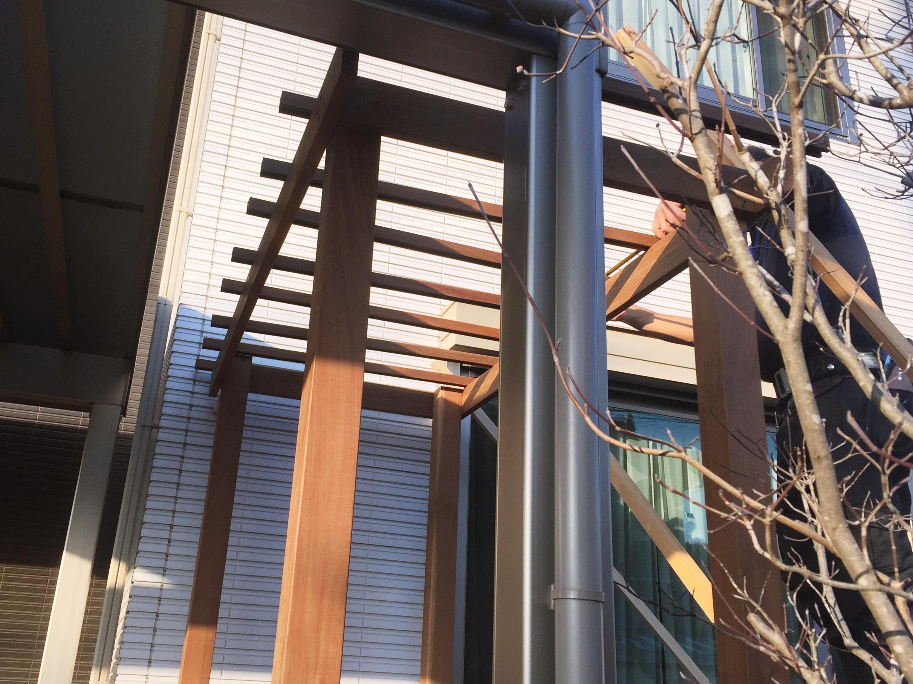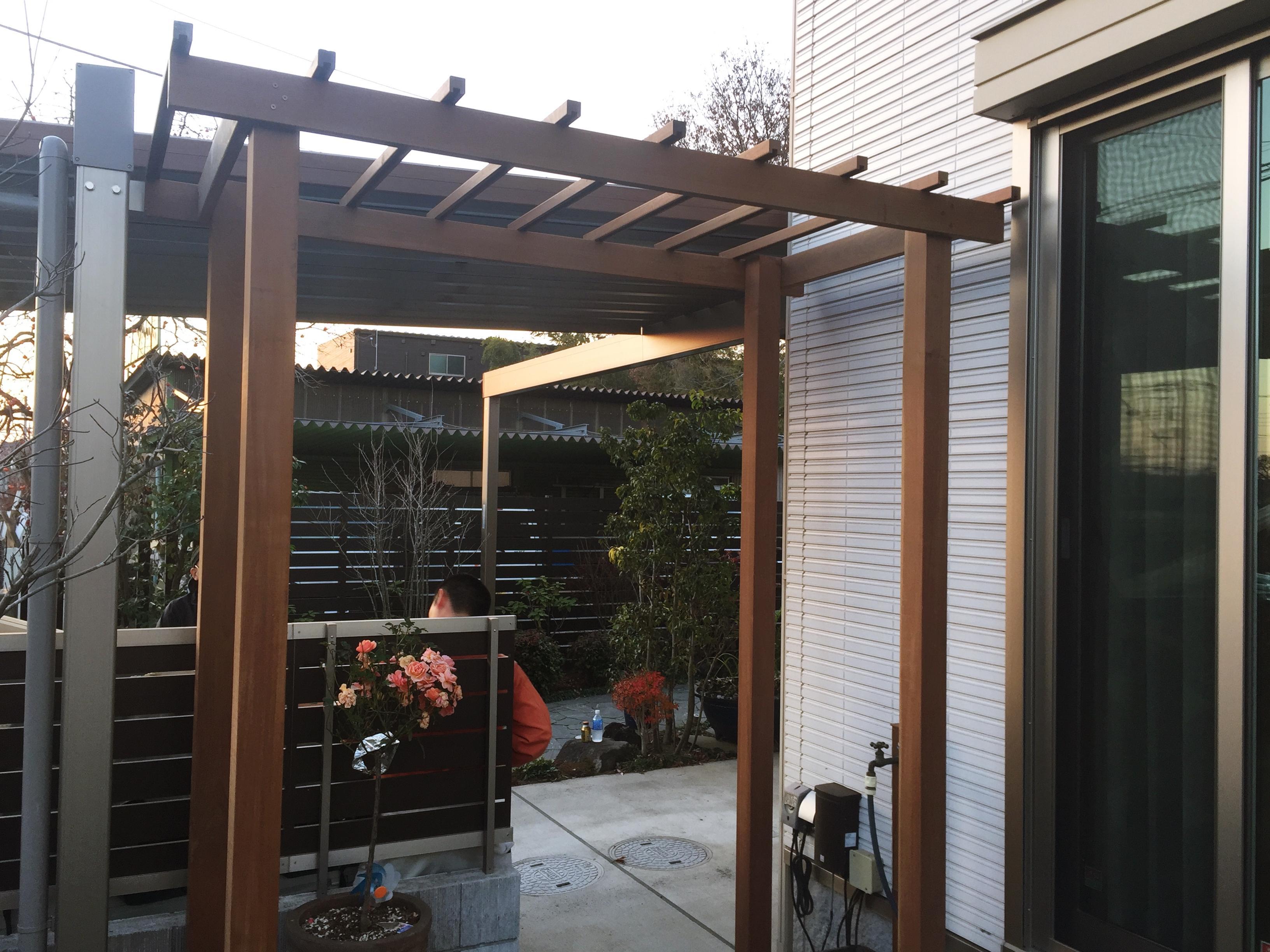 価格を抑えて長持ちするパーゴラ新設のご依頼。ウッドデッキ材にも使用するイペ材をチョイスしました。無塗装で20年~30年もつとされていますので末長くご使用出来ると思います。
