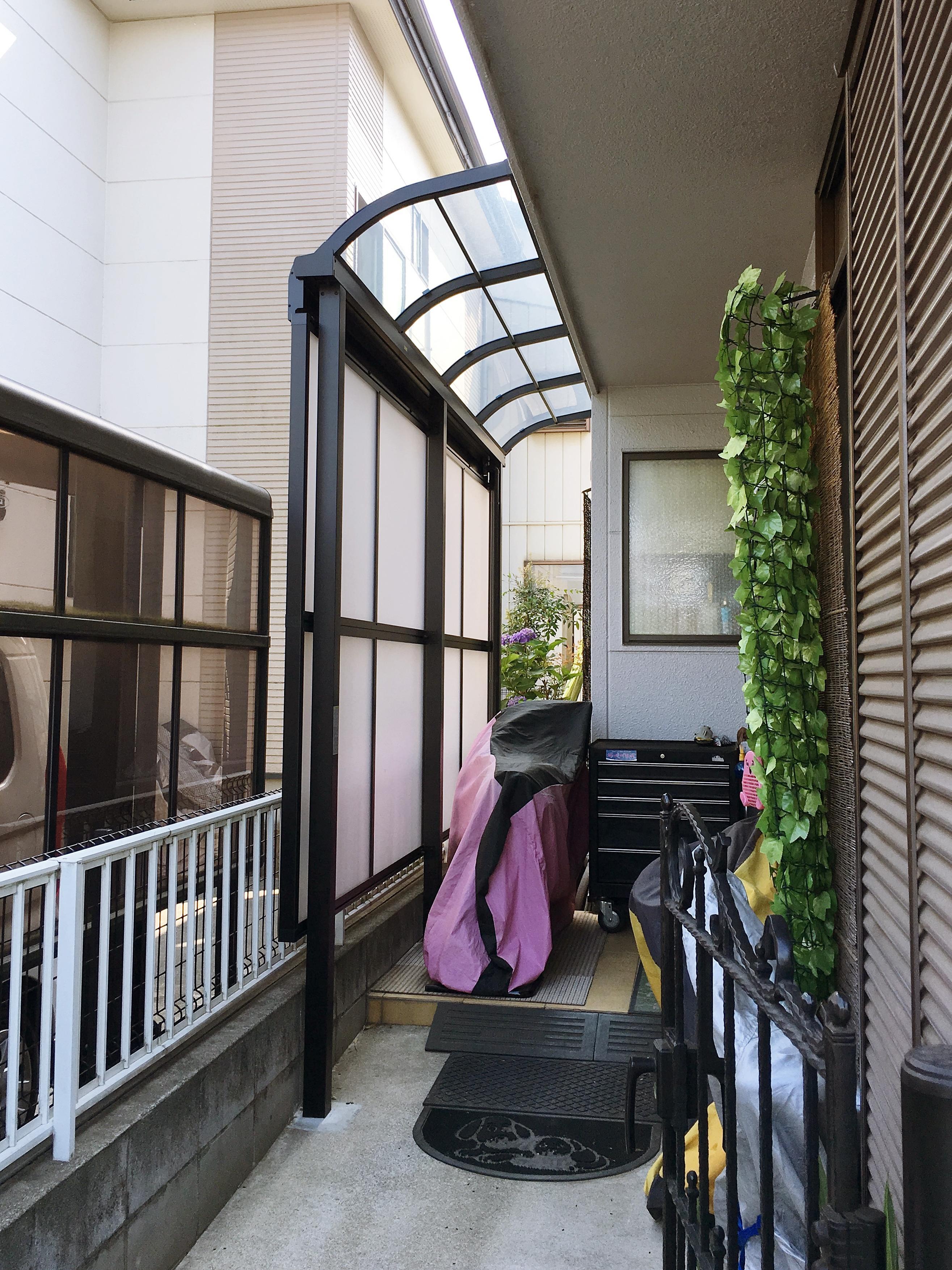 ご主人様の趣味である「バイクレース」。カバーをかけているとはいえ、雨が降ると心配事が増えてしまう。そんなお悩みを解決するためにサイクルポートを設置しました。天井だけでなく側面にもパネルを取り付けることで雨でも心配事がなくなりました。