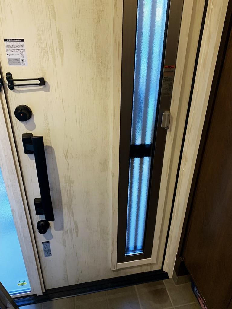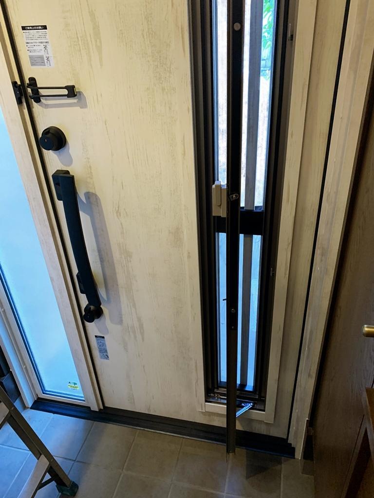 玄関網戸は防犯上心配。網戸にしても安心・安全な彩風玄関にしました。断熱玄関ドアで玄関の冷えも少なくなりました。そして電気錠!カザスキーで利便性も向上。お施主様自慢の玄関扉になりました。