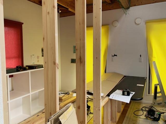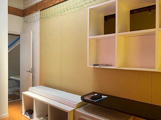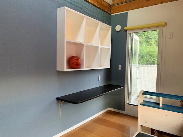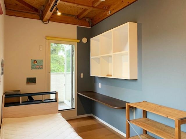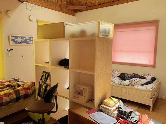 以前より使用していた家具をうまく利用し、間仕切り壁を作りました。学習机の代わりにカウンターを両側に配置して、5.5畳の部屋にベットを置いても圧迫されない空間が出来たと思います。