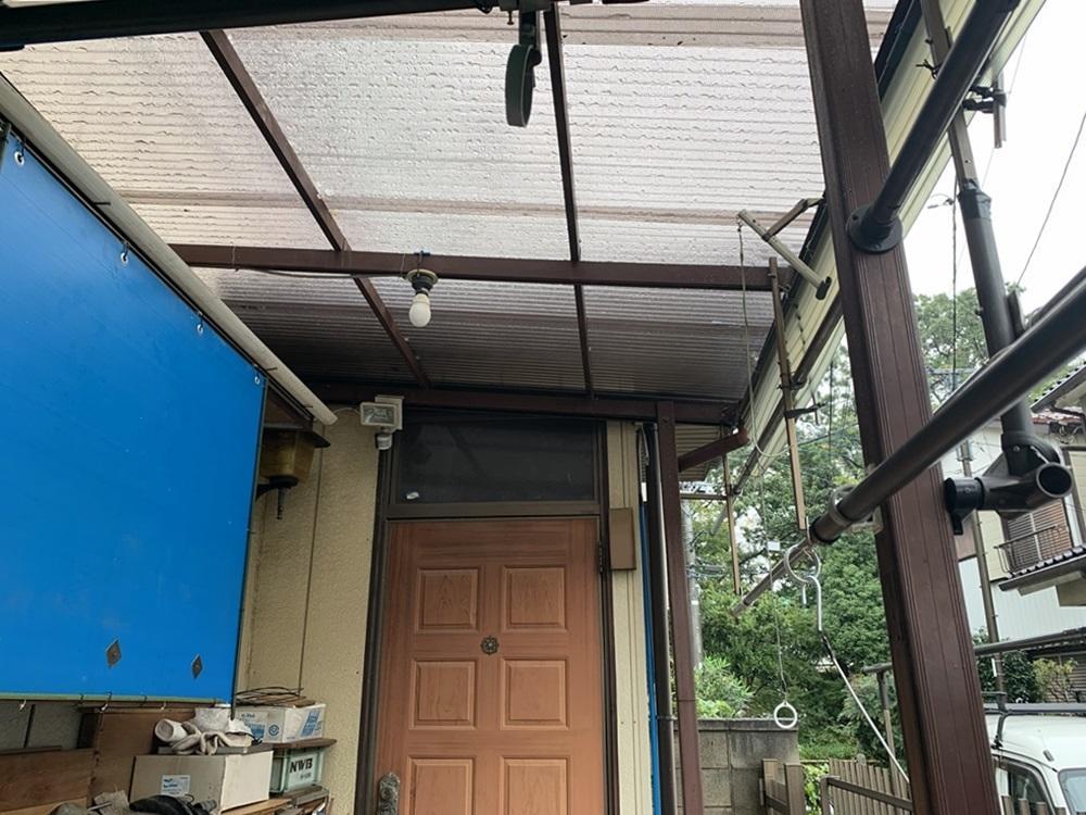 『80歳になる父親が玄関先の屋根を修理していたら脚立から足を踏み外し怪我をしてしまったので今後は修理が必要ない屋根にしてほしい』という内容で息子様より依頼がありました。現場調査に伺うと、40年間、創意工夫をしながらご使用になられてきた、哀愁を感じられるテラス屋根。撤去するのは淋しいですが、お父様が怪我をされると家族の方々が悲しがるので、今後何年ご利用になれるか判りませんが交換の運びとなりました。