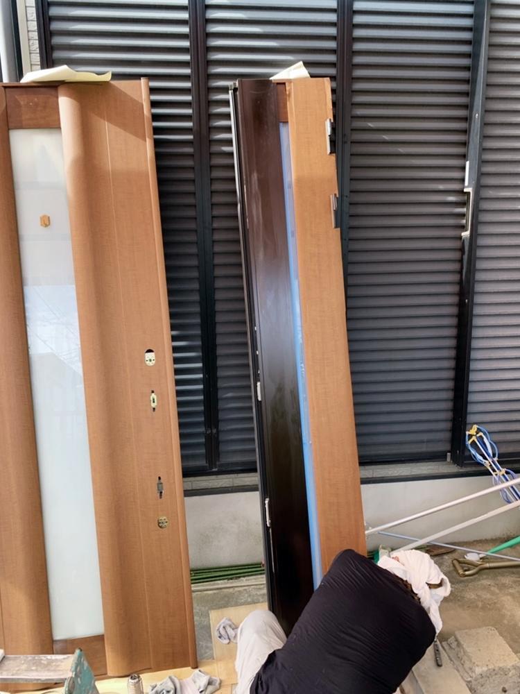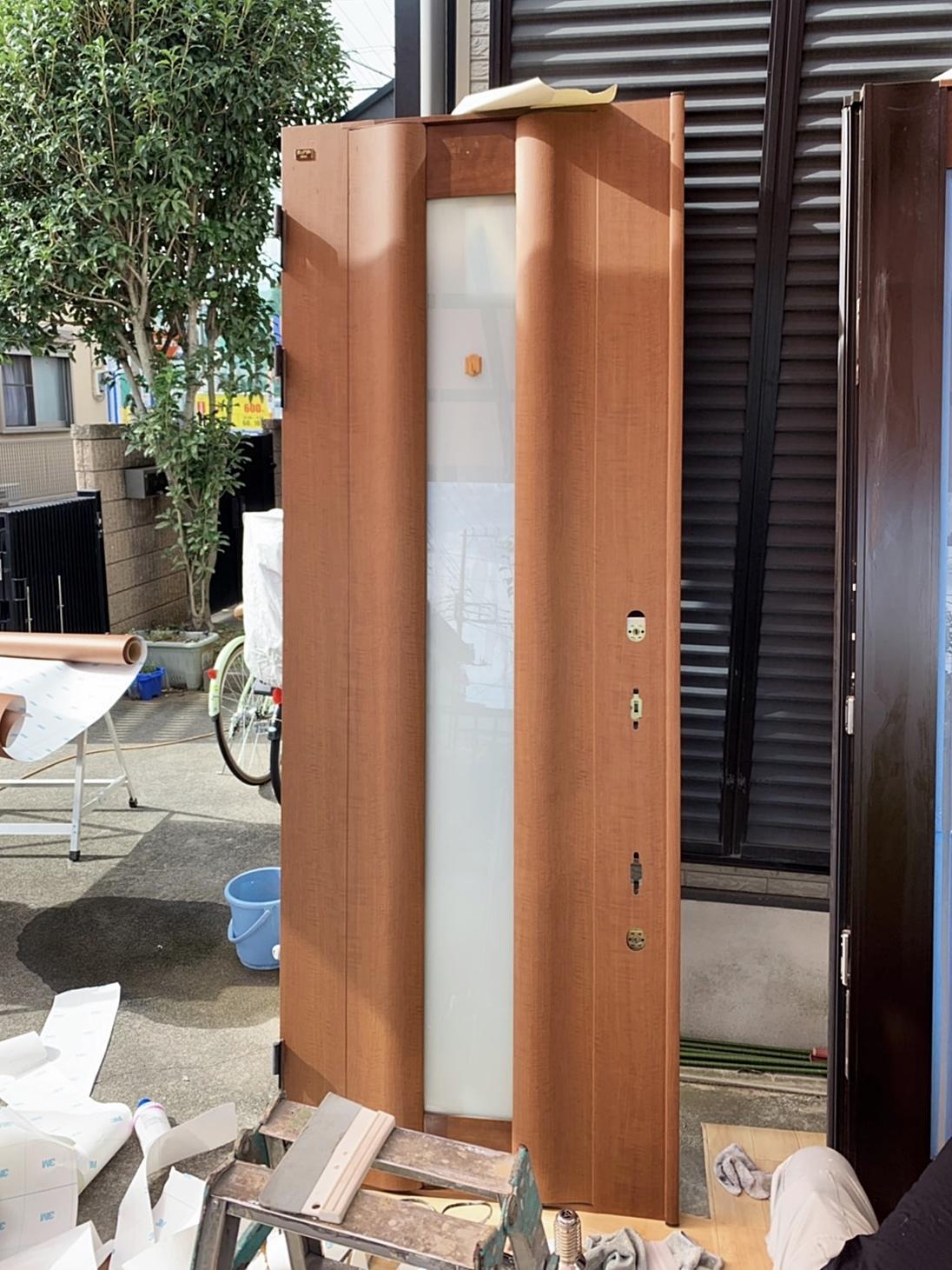 既存の玄関扉は西日が厳しいからなのか、 元々の商品自体が悪いのか、 化粧シートがずれずれ。 さすがにこのままでは 見た目がよろしくないので・・・ ずれずれの化粧シートをきれいに剥がして 新しい化粧シートを貼り直し。玄関扉の交換も検討しましたが、 結果、玄関用シートとなりました。